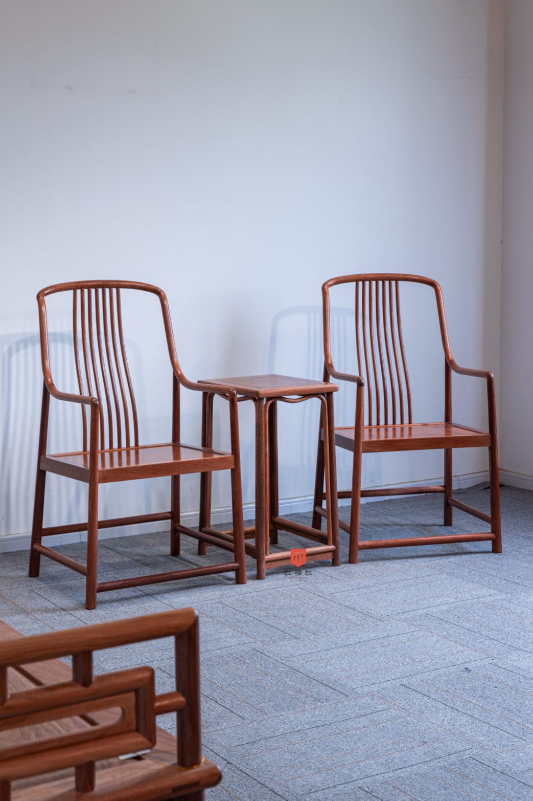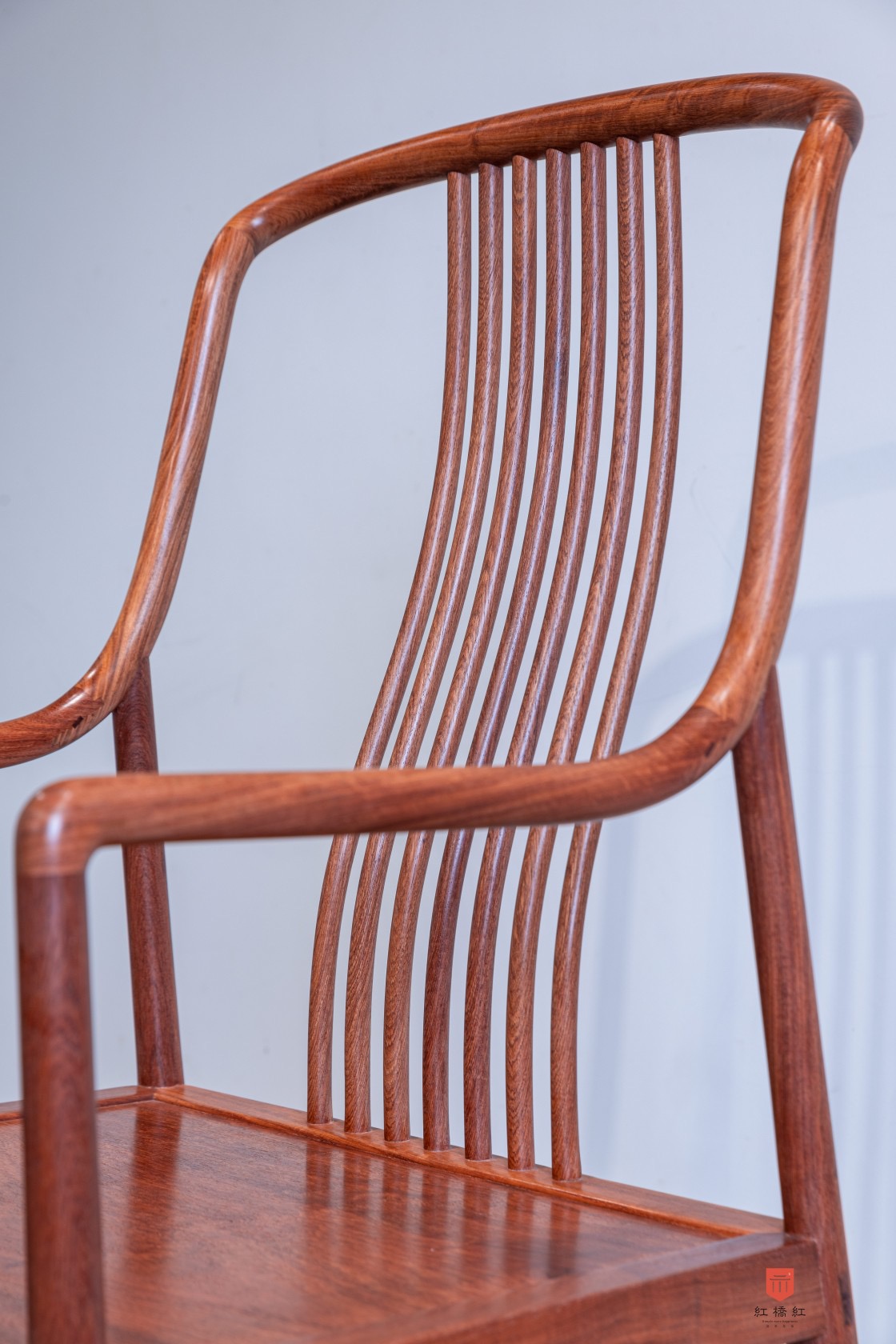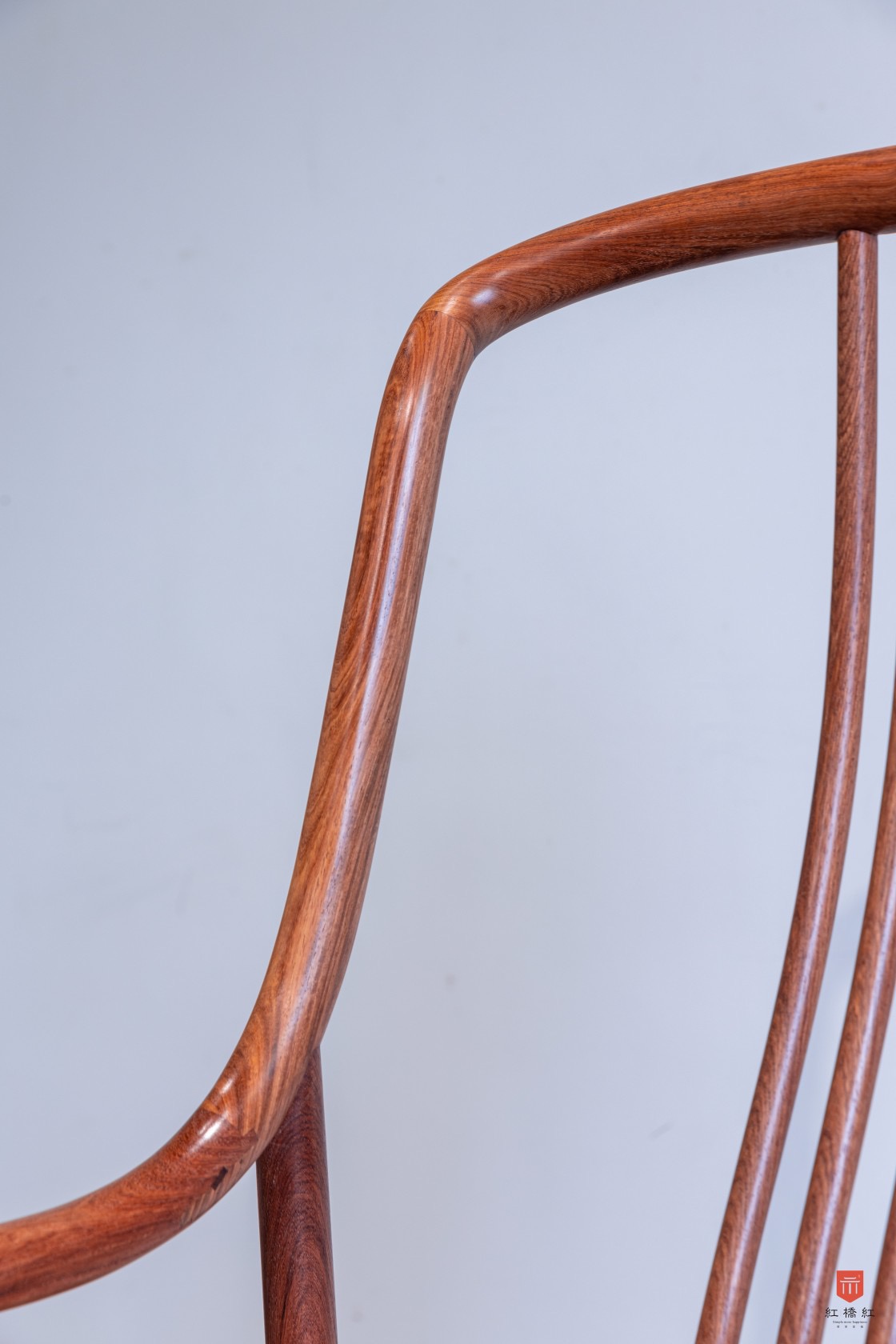 此扶手椅,风格疏朗通透,富现代气息。以缅甸花梨木制作,全器除座面为四面平的方材、腿足外圆里方外,通体框架采用圆材,整体方圆结合。三弯靠背采用曲棂式样,搭脑与扶手的线条柔婉,以烟袋锅榫结合。