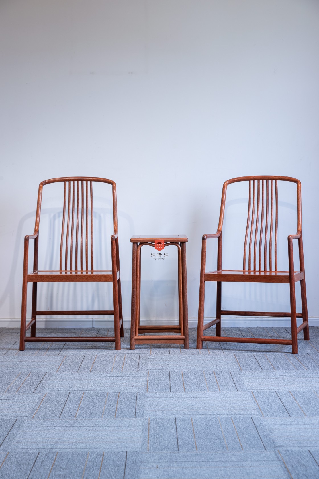 座面硬屉为独板,用料考究。四腿八挓,腿间安步步高赶枨。整器高挑,造型呈梯状,给人稳定之感。