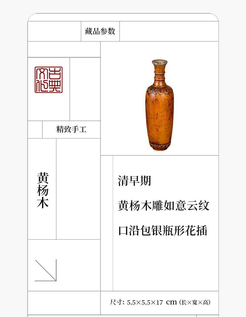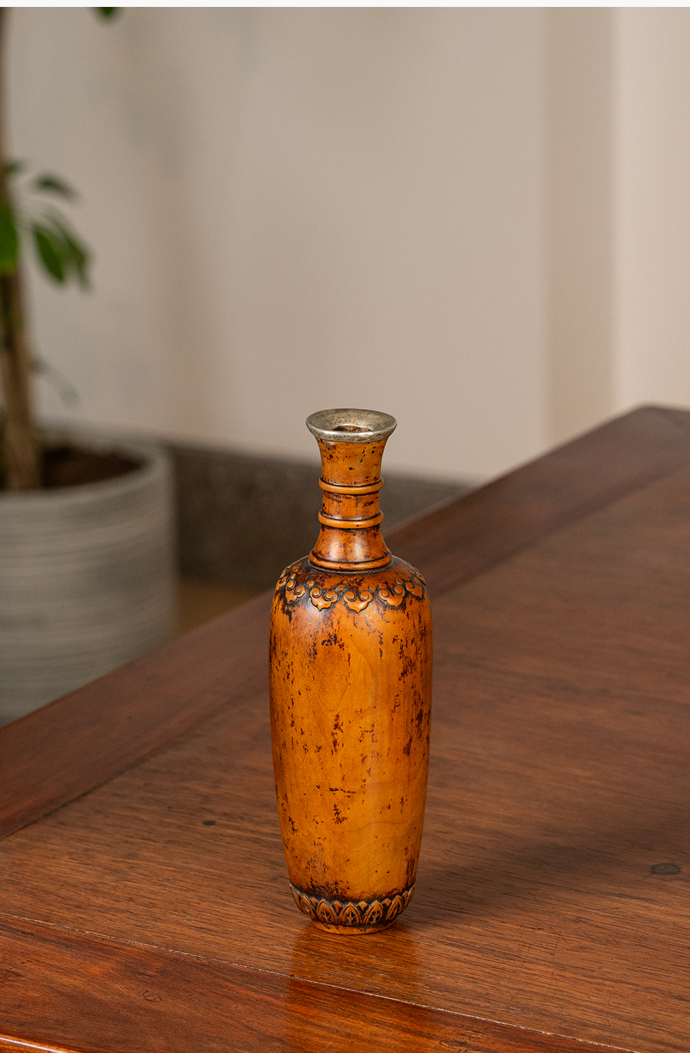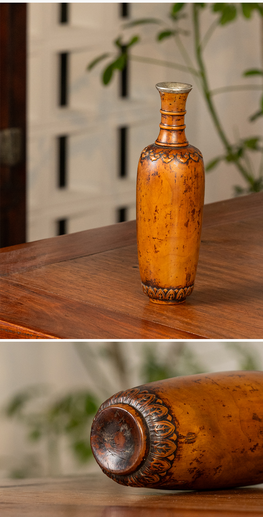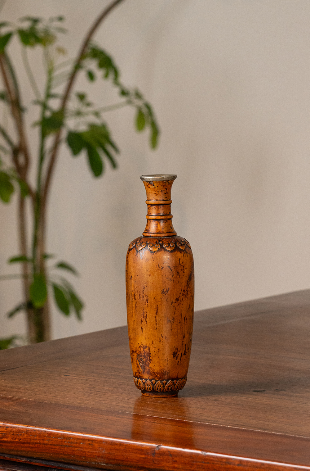 清早期 黄杨木雕如意云纹口沿包银瓶形花插