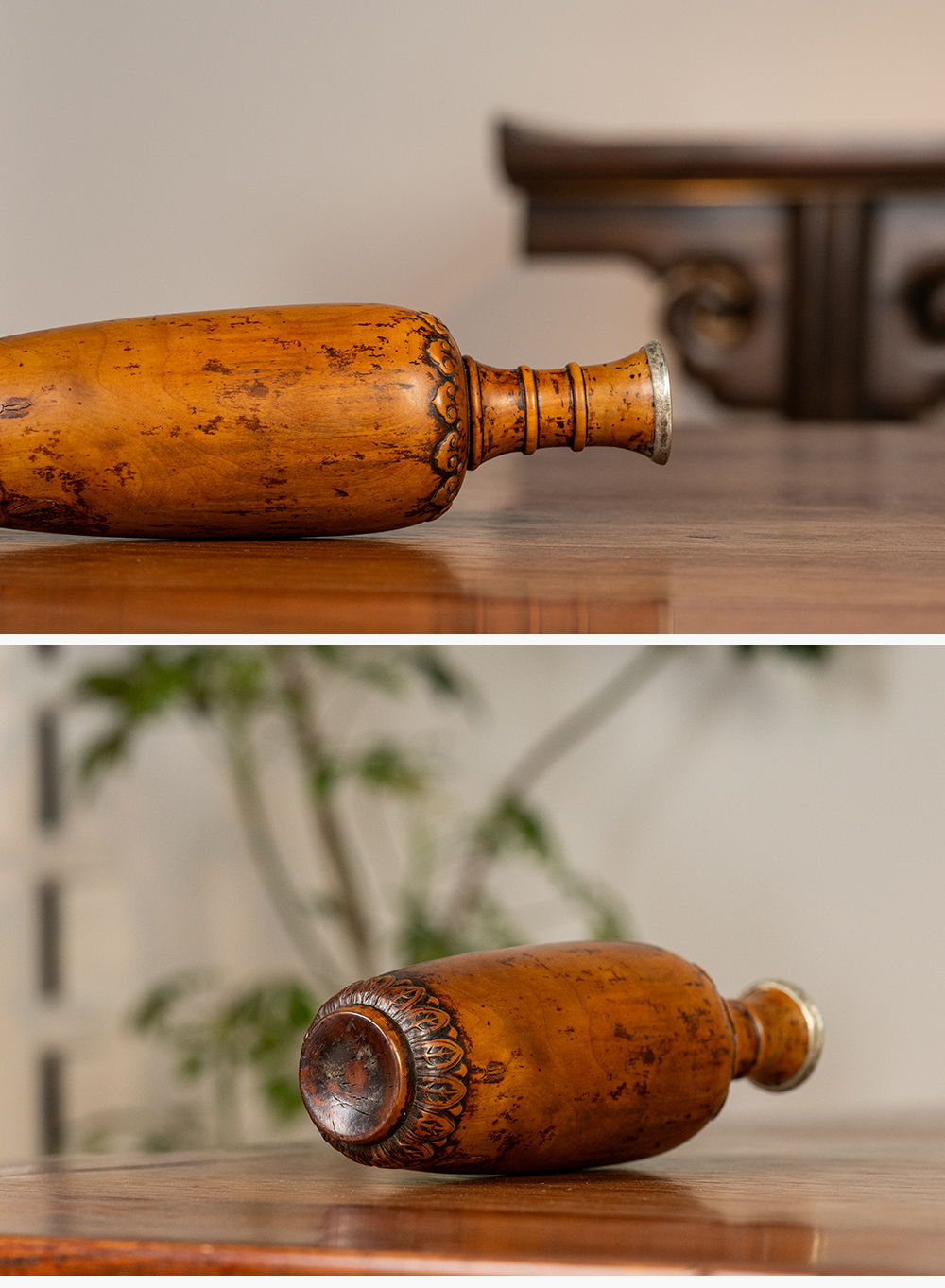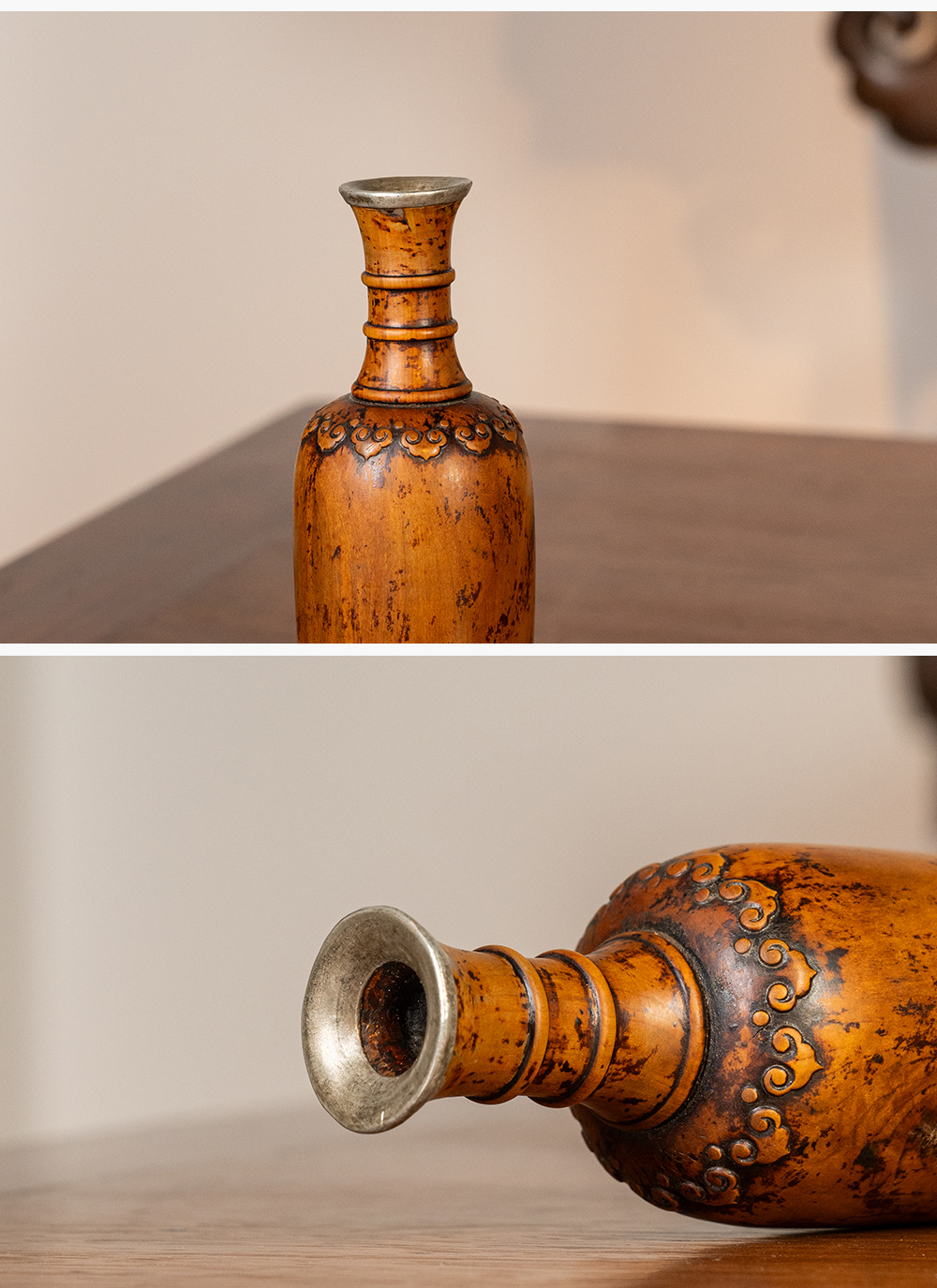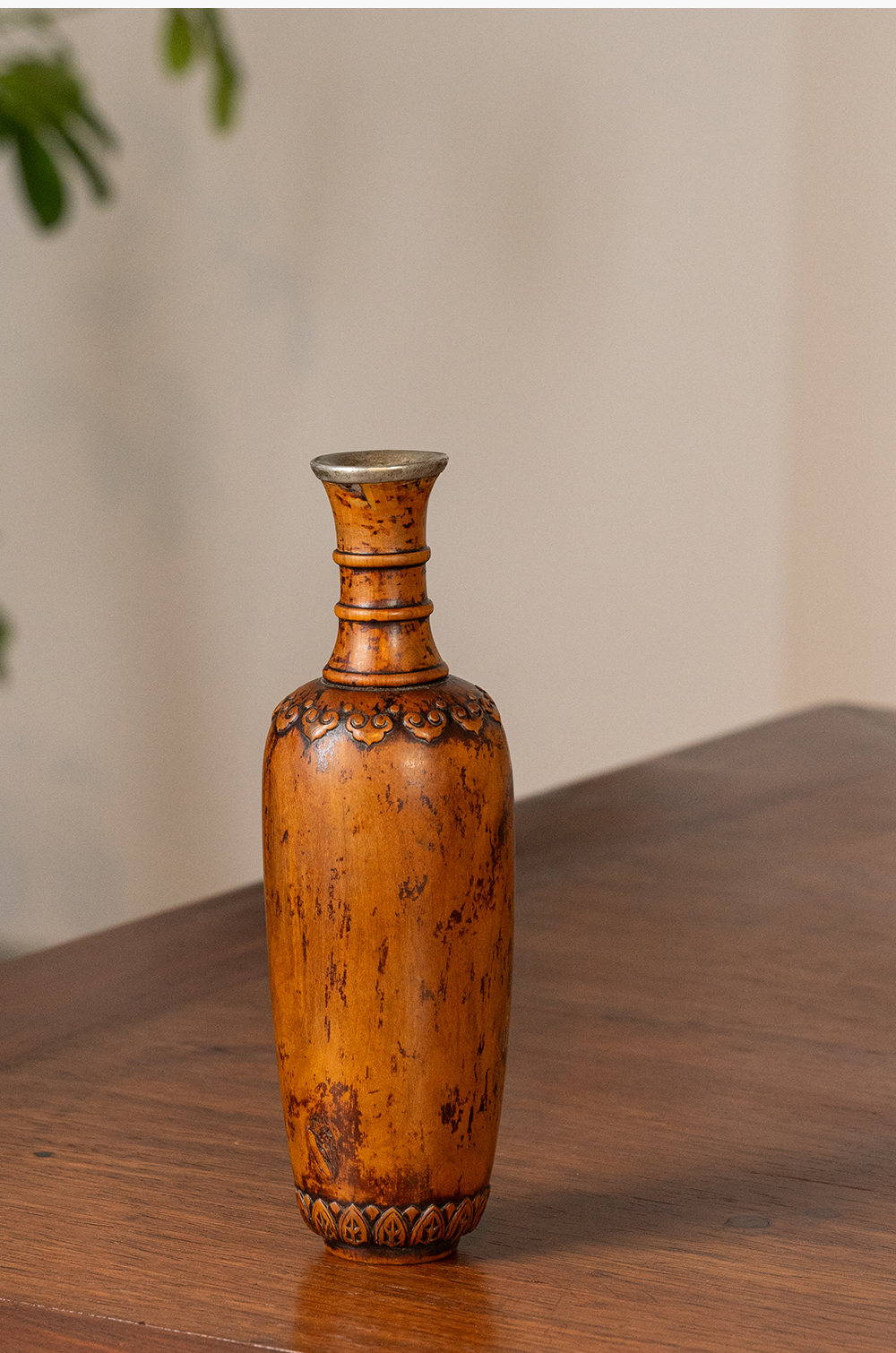 清早期 黄杨木雕如意云纹口沿包银瓶形花插