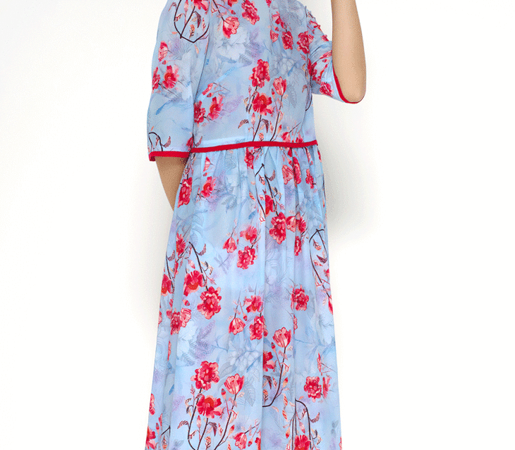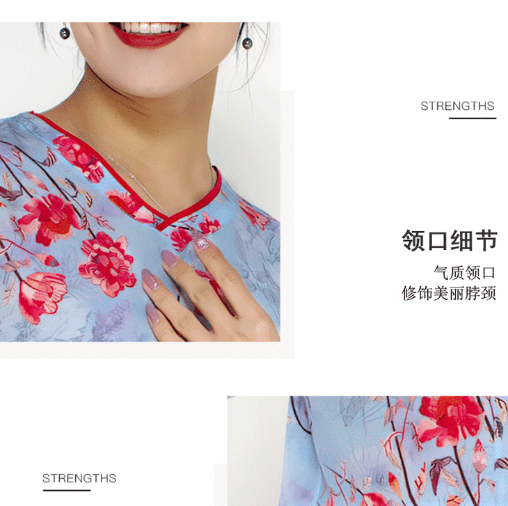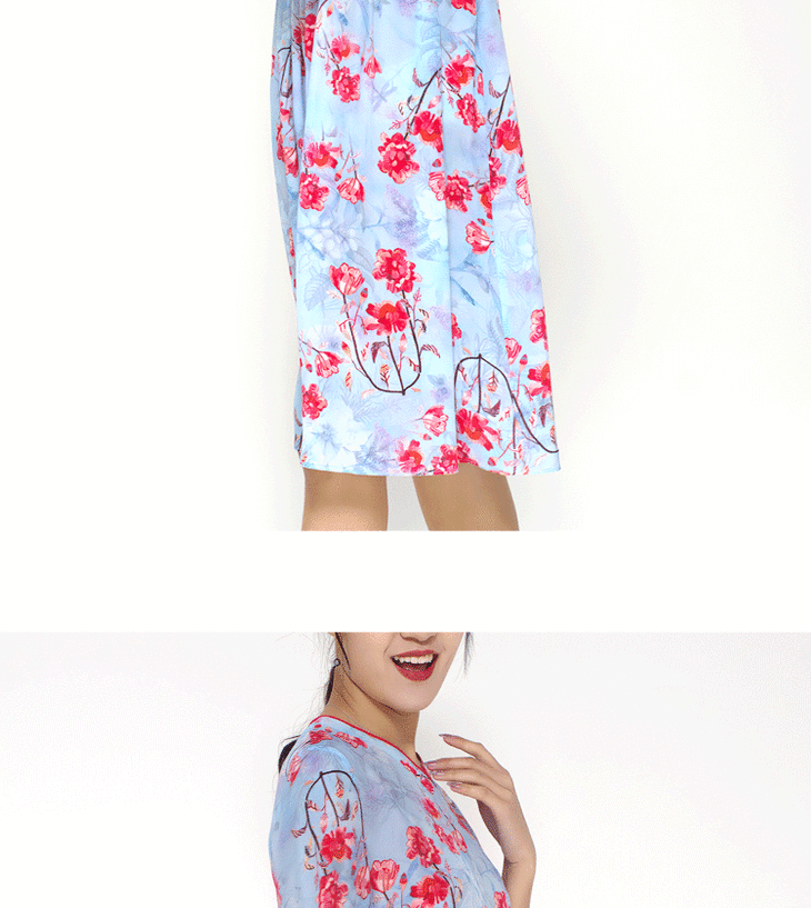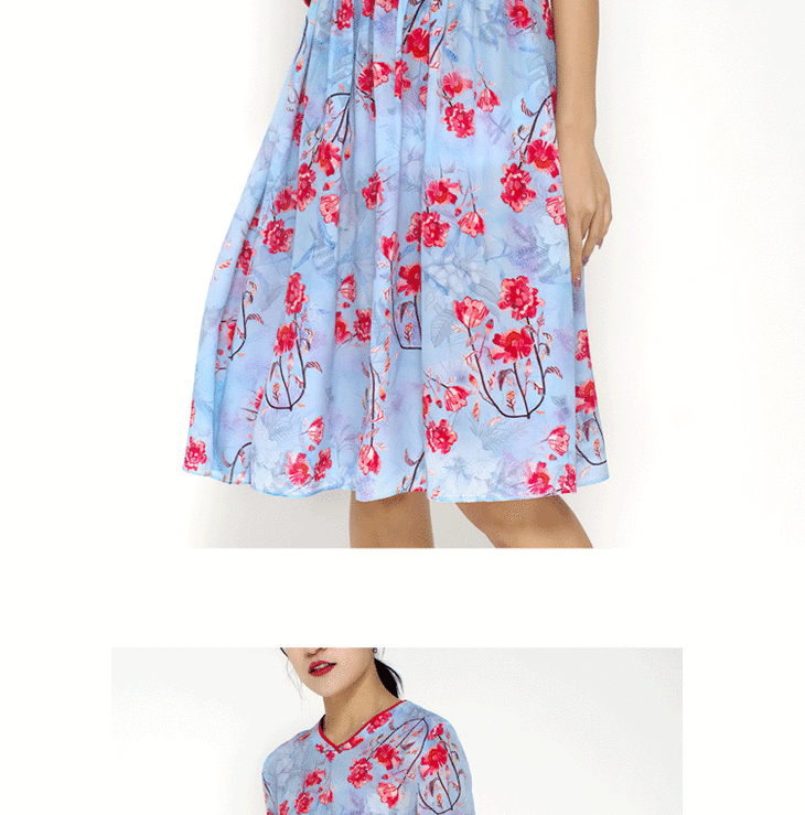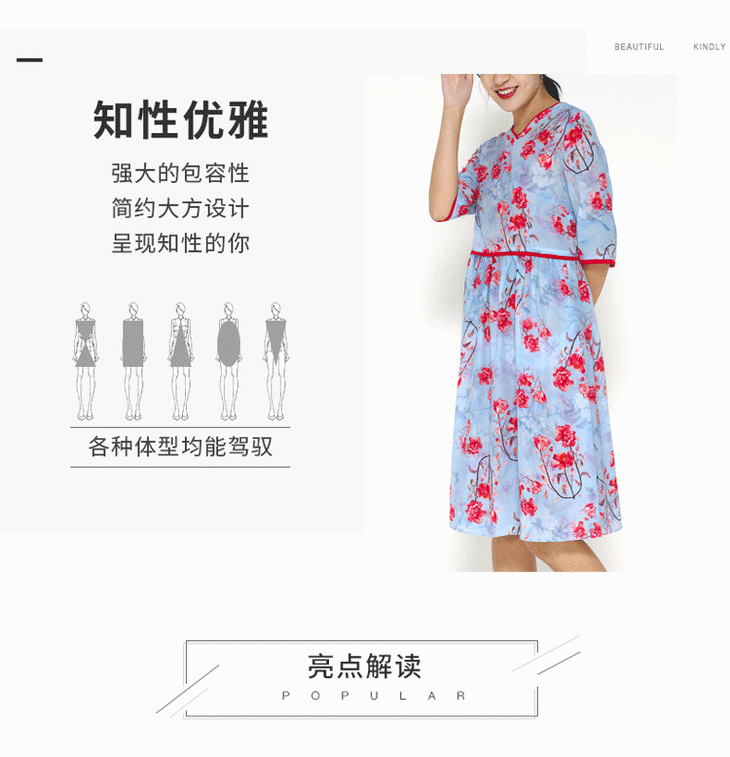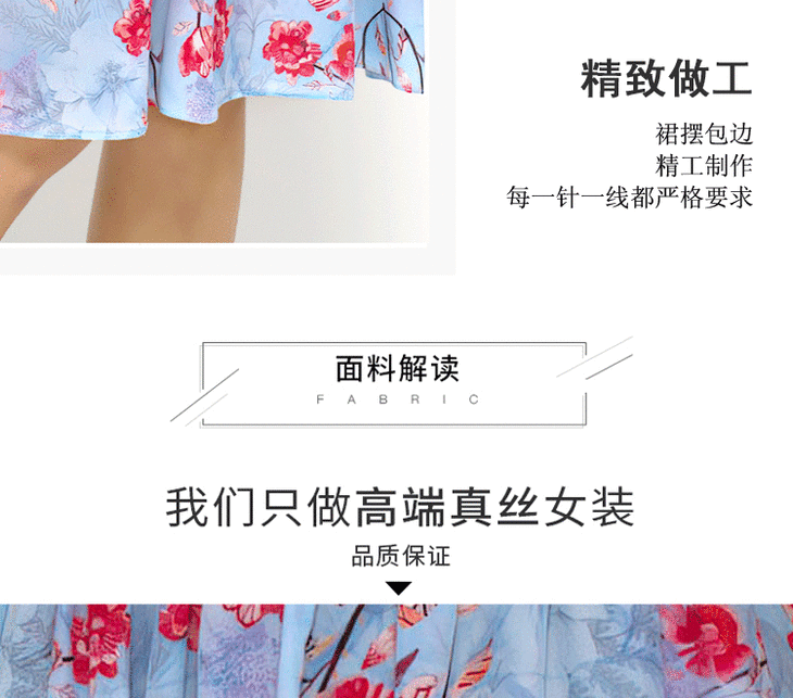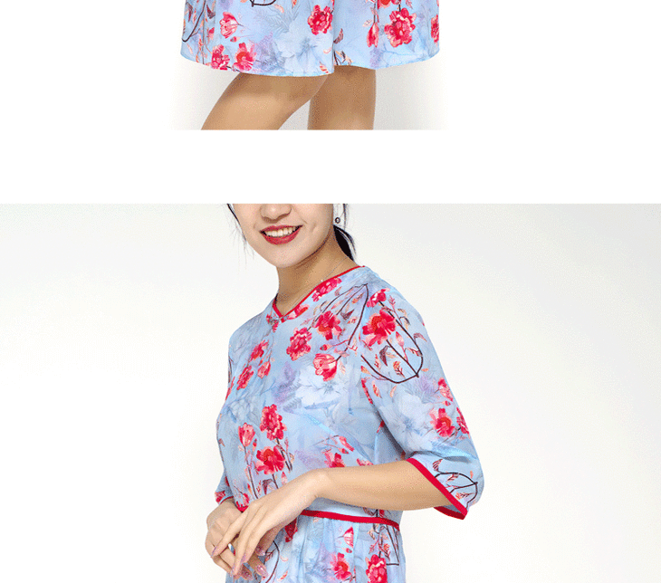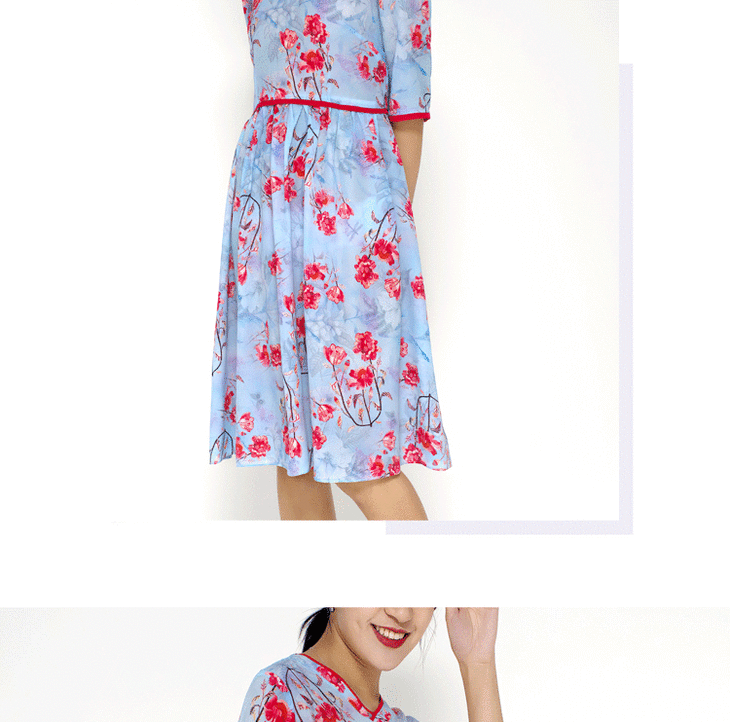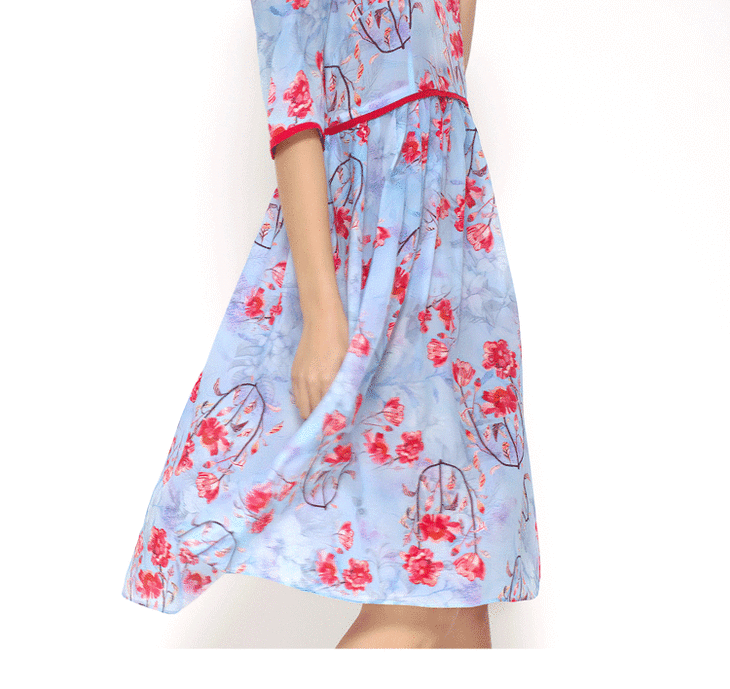 丁摩 真丝连衣裙撞色包边印花时尚中袖桑蚕丝连衣裙20-60DB399240531