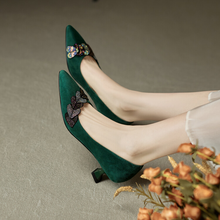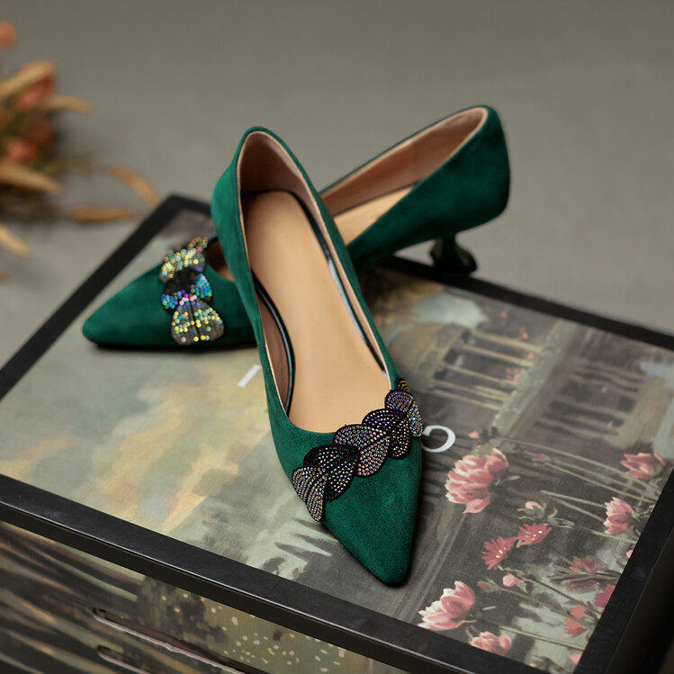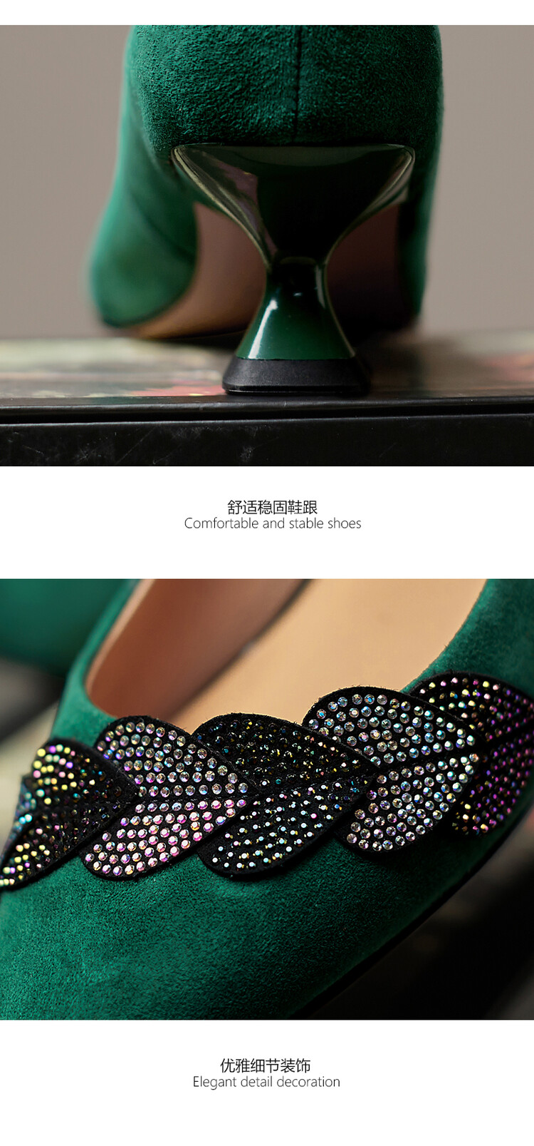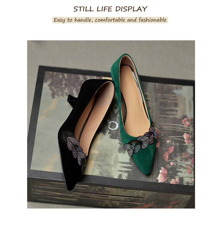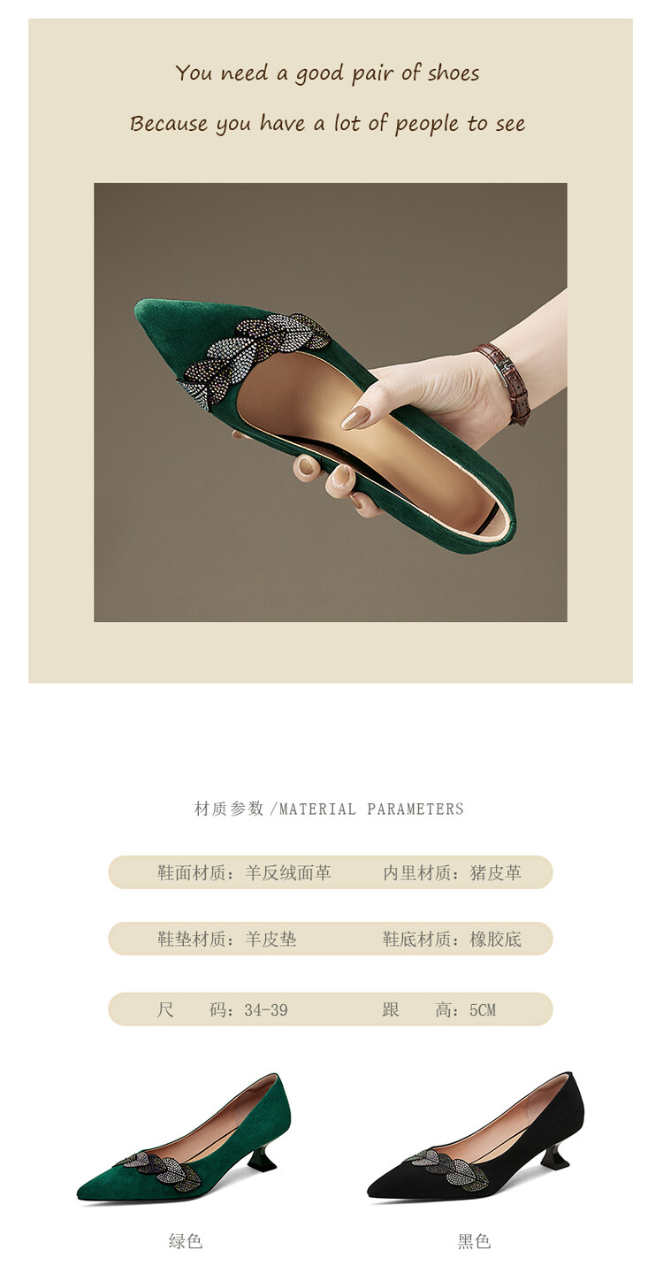 【颜 色】: 黑色,绿色【鞋 面】:羊皮【内 里】:猪皮【鞋 底】:橡胶底【跟 高】:5CM【尺 码】:34-39