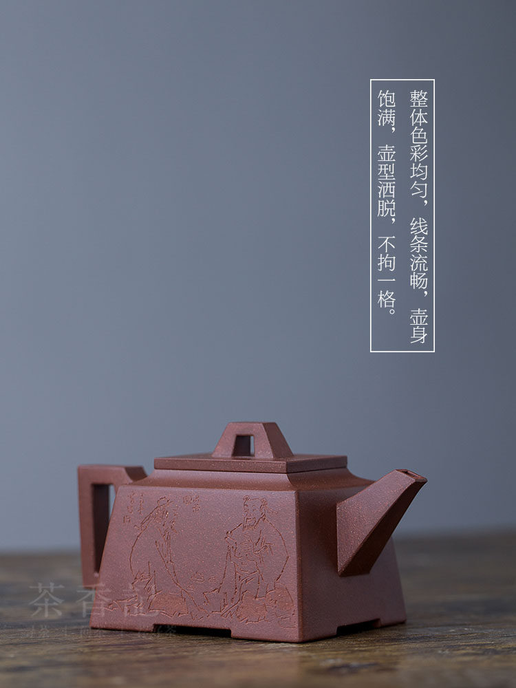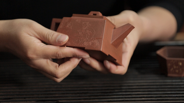 壶身一侧以细腻的工笔刻绘了一幅趣意盎然的「品茶图」,