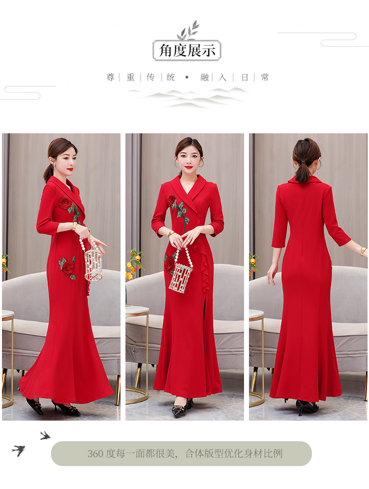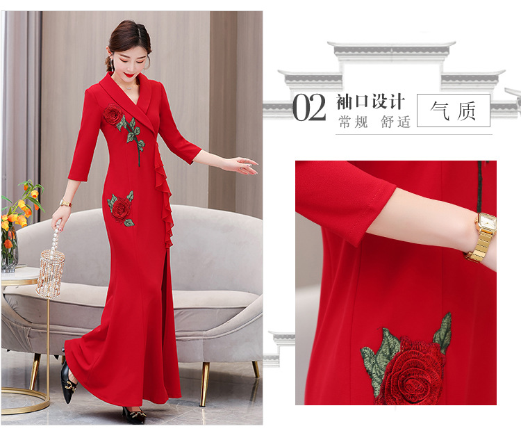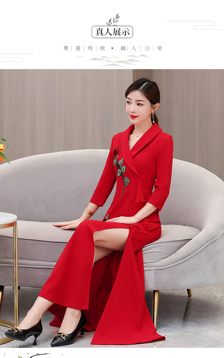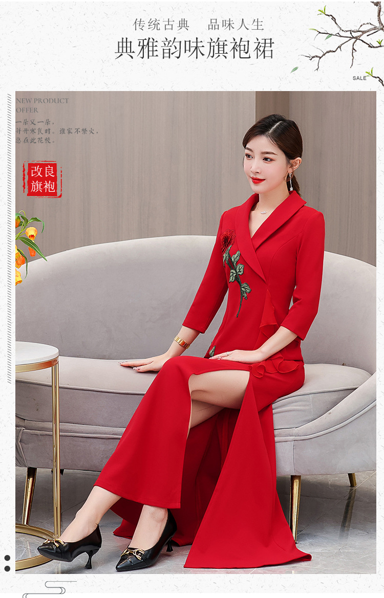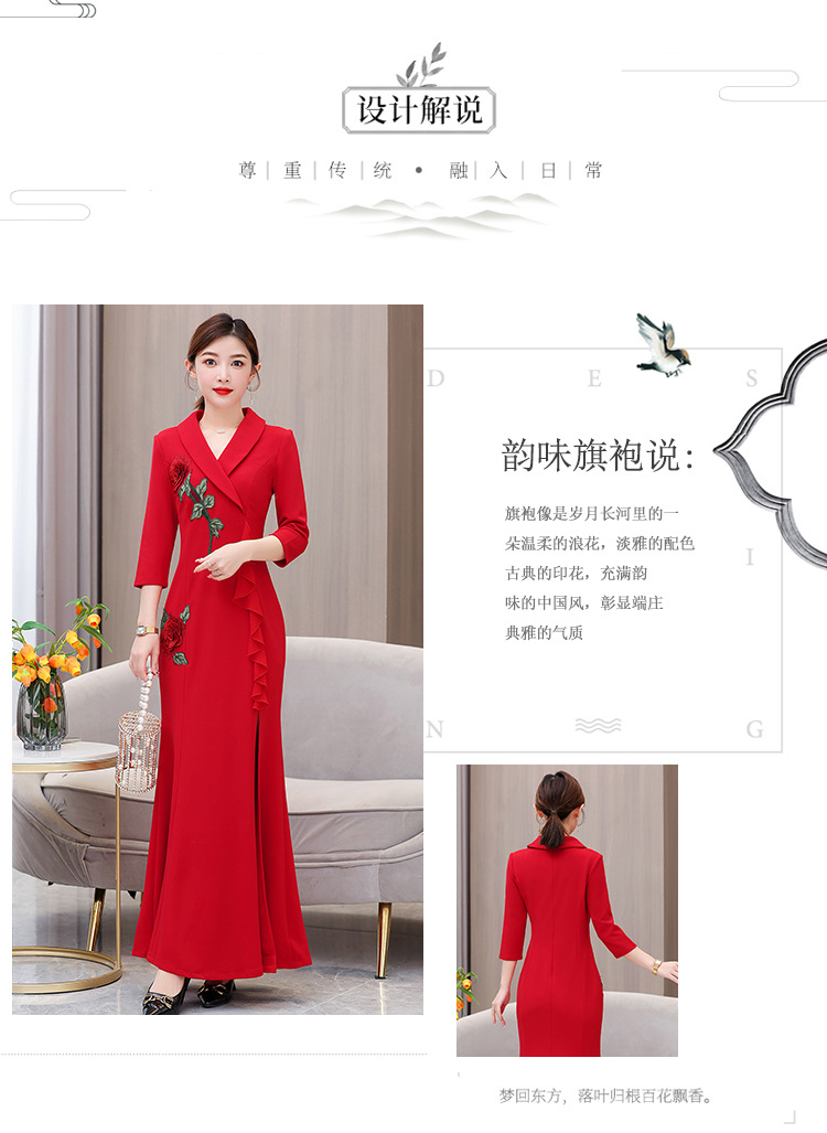 【XY】QE92222023春季新款中国风复古修身斜襟走秀表演长款旗袍刺绣花荷叶边裙