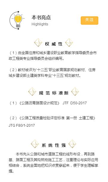 本书系统介绍了公路和城市道路工程的线形布设原理和方法、路基、路面工程及其构筑物的基本原理与施工工艺。注重理论与实际应用相结合,在学生难以理解之处均配有例题和图片,力求做到通俗易懂,并介绍了市政工程的新方法、新工艺,增加了沥青路面结构层的施工案例,全书均采用最新版发行的规范,使教材更为实用。 全书分为三篇,共十七章。其中第一篇道路线形共四章;第二篇路基工程与施工共六章;第三篇路面工程与施工共七章。 本教材主要作为市政工程专业、土木工程专业、交通工程、城市道路与公路专业及其相关专业的高职教材,也可供从事城市道路和公路交通的成人教育、设计、施工部门的工程技术和管理人员参阅。