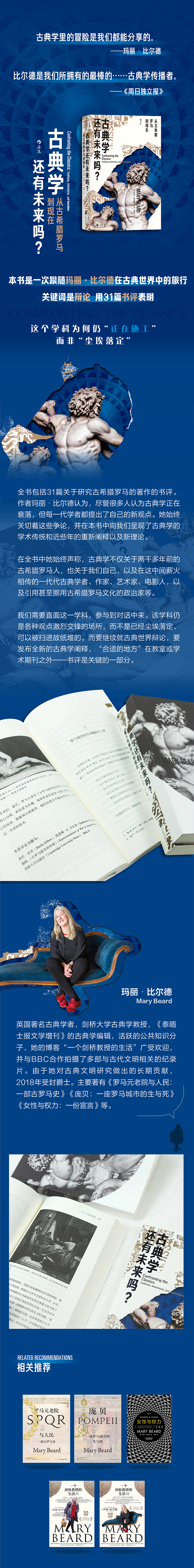 《古典学还有未来吗?》的原书名是Confronting the Classics: Traditions, Adventures, and Innovations,直译为《直面古典学:传统,冒险与创新》。作者玛丽·比尔德是英国当代著名古典学者,全书包括31篇对研究古希腊罗马的著作的书评。中文书名来自她的序言《古典学还有未来吗?》。作者的语言风格是轻松幽默的,但学术态度是严肃认真的。比尔德认为,尽管很多人认为古典学(也就是研究古希腊罗马的学问)正在衰落,但每一代学者都提出了自己对古希腊、古罗马的新观点。她始终关切着这些讨论和争辩,并在本书中向我们呈现了古典学的学术传统和近些年的重新阐释以及新理论。在全书中她始终声称,古典学不仅关于两千多年前的古希腊罗马人,也关于我们自己,以及在这中间薪火相传的一代代古典学者、作家、艺术家、电影人,还有引用甚至挪用古希腊罗马文化的政治家等等。我们需要直面这一学科,参与到讨论中来。该学科仍是各种观点激烈交锋的场所,而不是已经尘埃落定、可以被扫进故纸堆的。