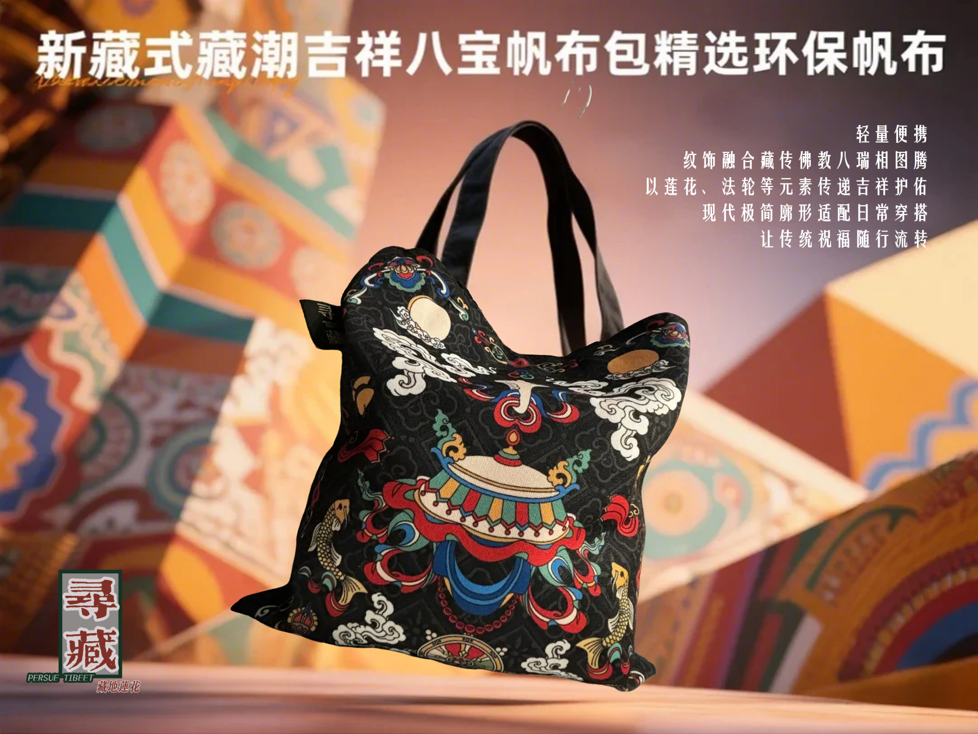 新藏式藏潮吉祥八宝帆布包精选环保帆布,轻量便携。纹饰融合藏传佛教八瑞相图腾,以莲花、法轮等元素传递吉祥护佑,现代极简廓形适配日常穿搭,让传统祝福随行流转。