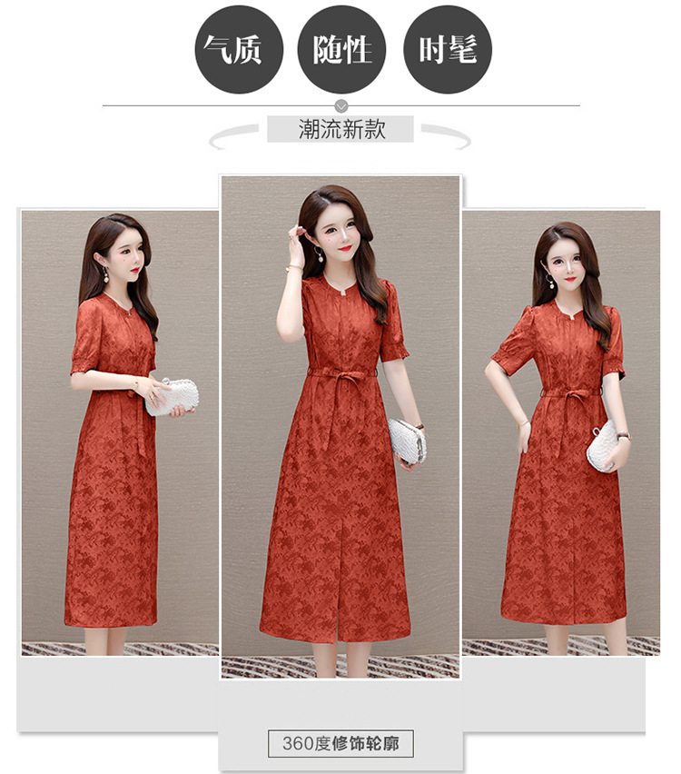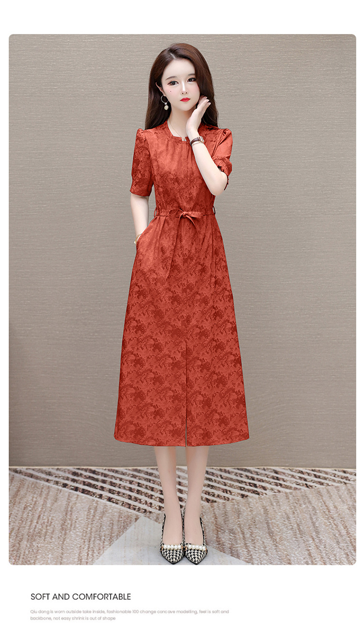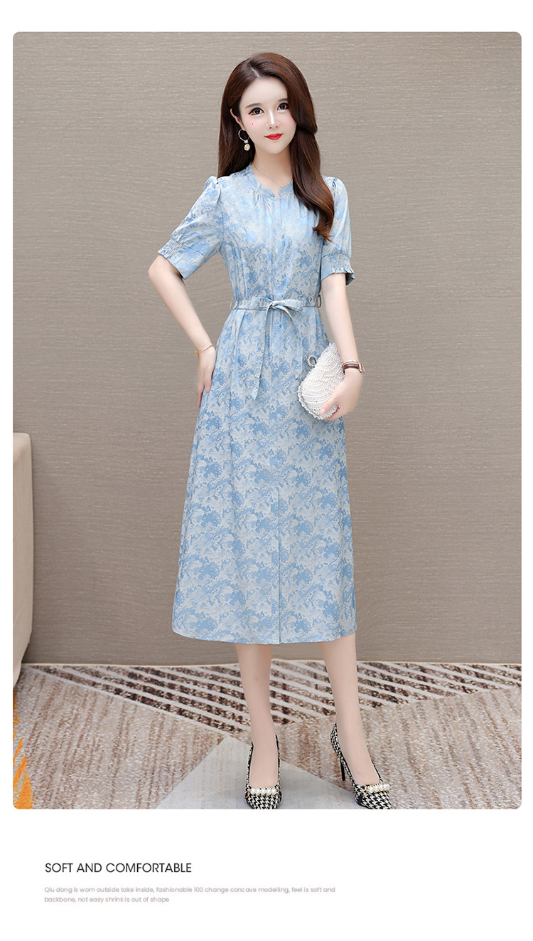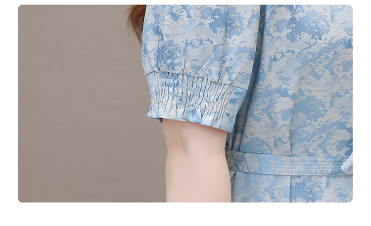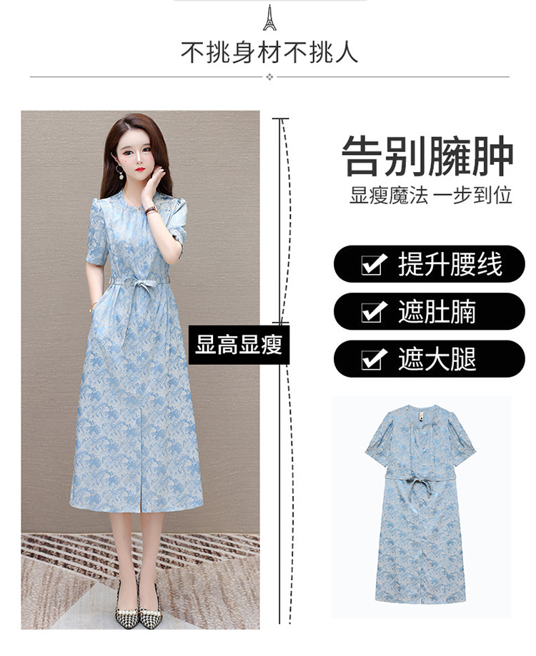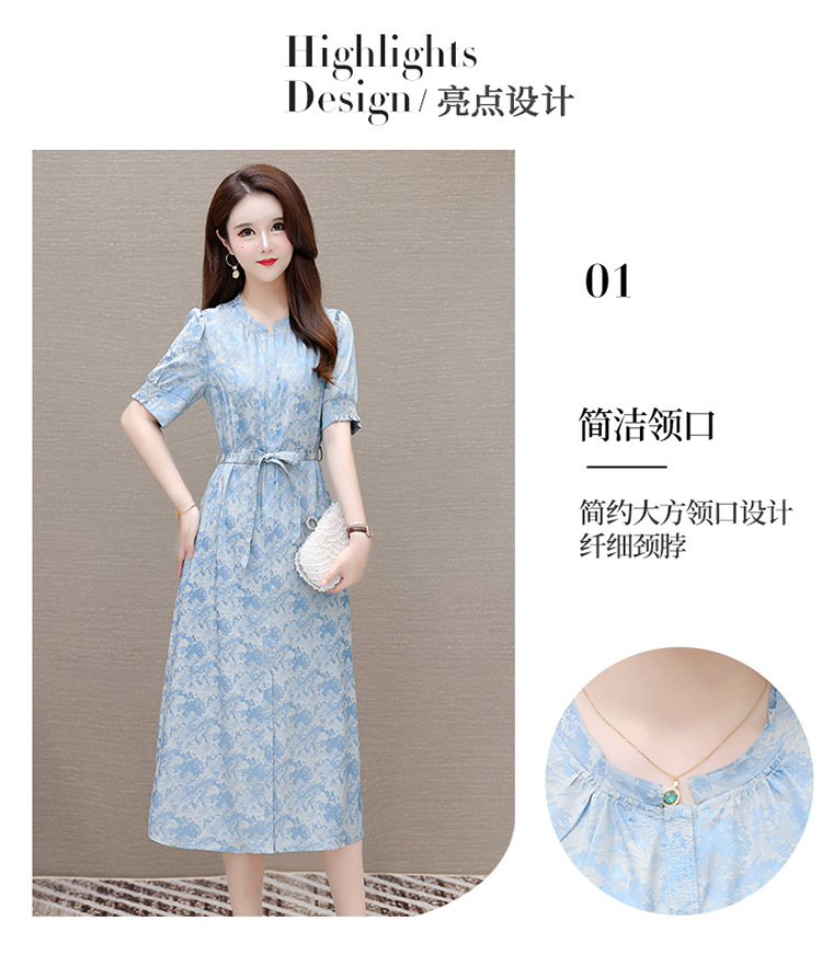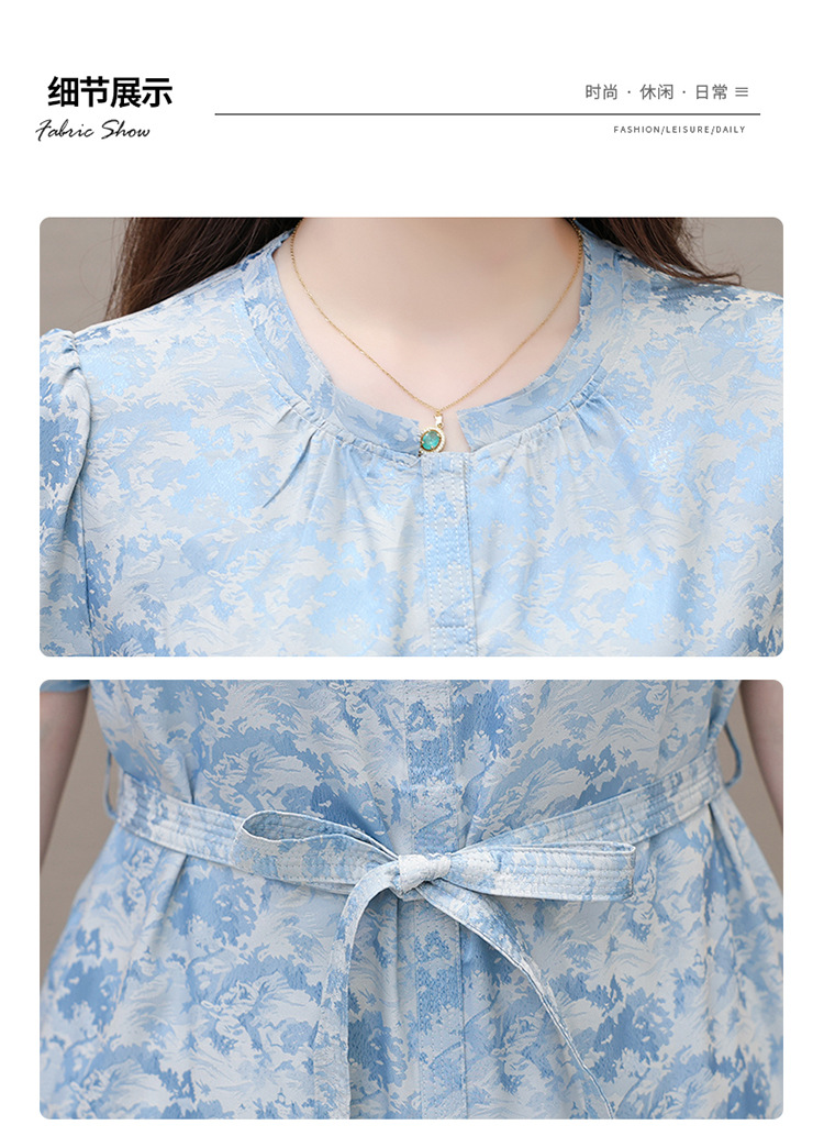 印花系带收腰显瘦,圆领短袖通勤气质A字裙QYM-XQD-7B2430-L