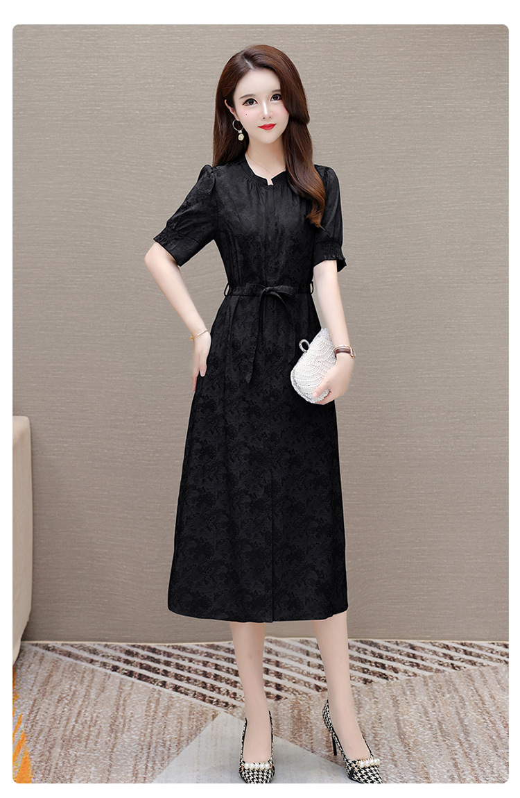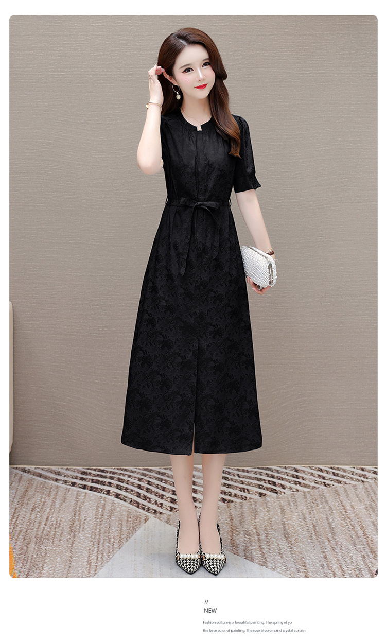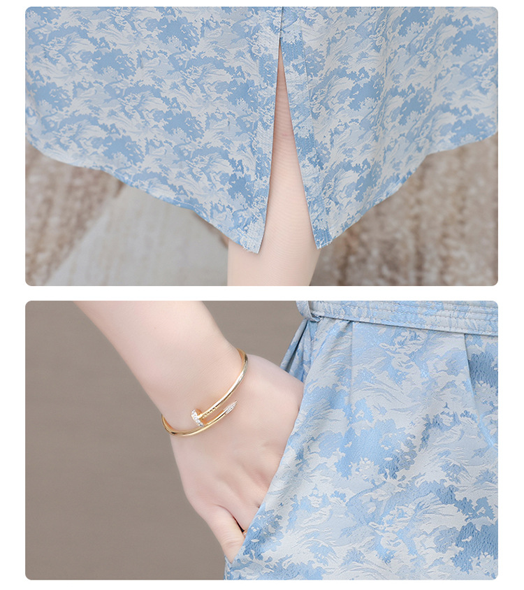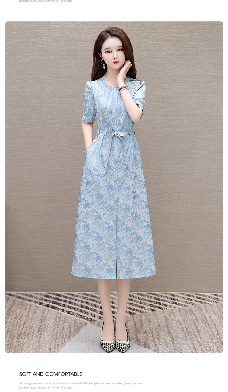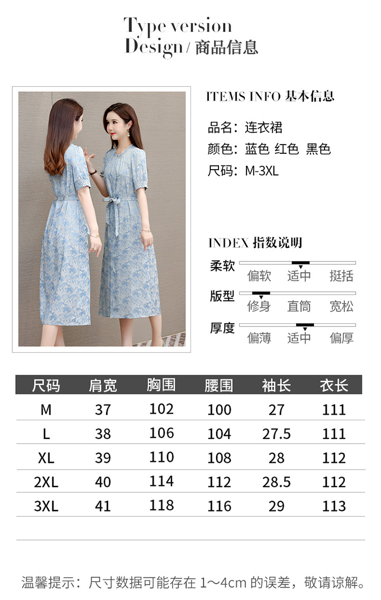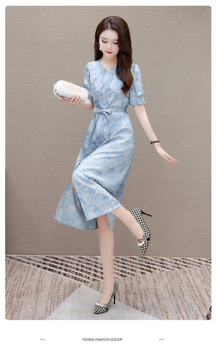 印花系带收腰显瘦,圆领短袖通勤气质A字裙QYM-XQD-7B2430-L