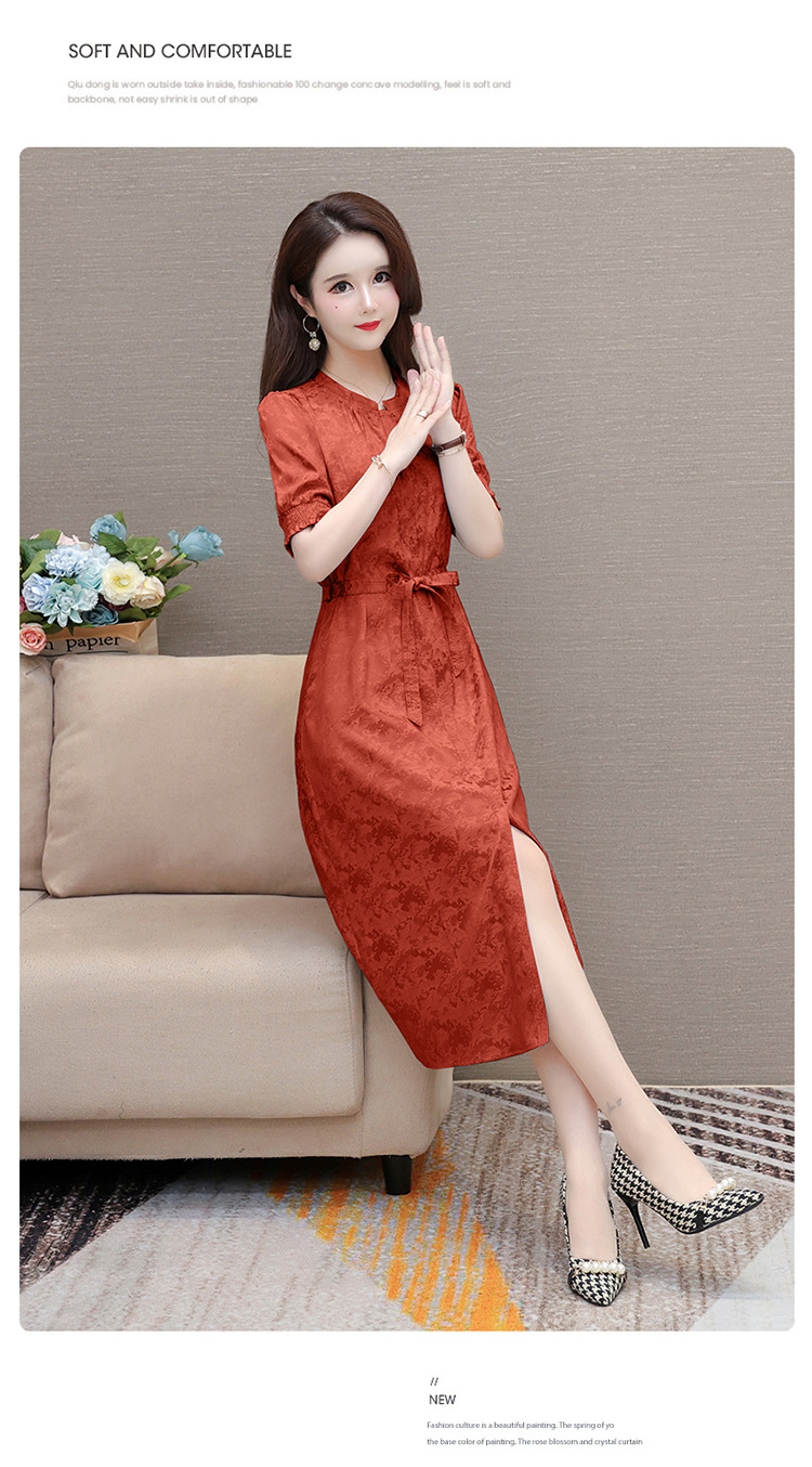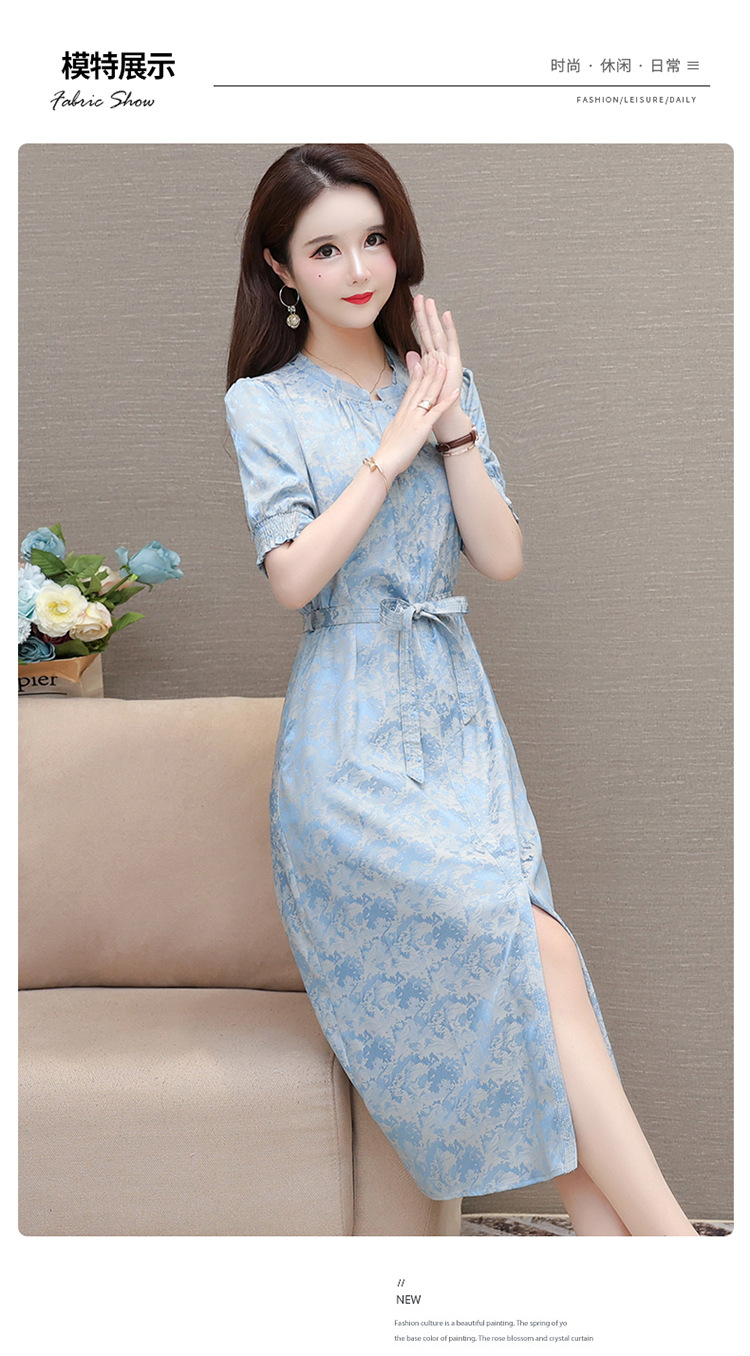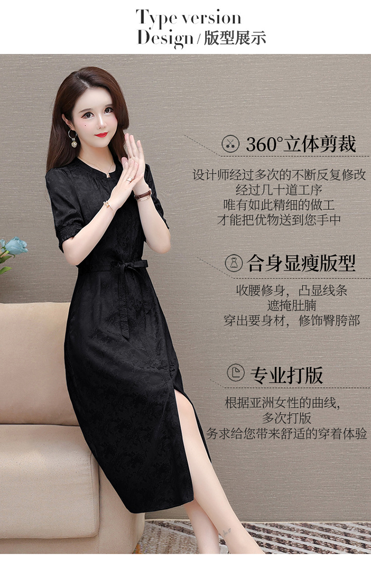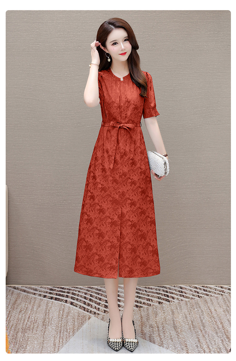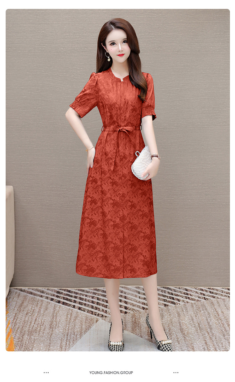 印花系带收腰显瘦,圆领短袖通勤气质A字裙QYM-XQD-7B2430-L