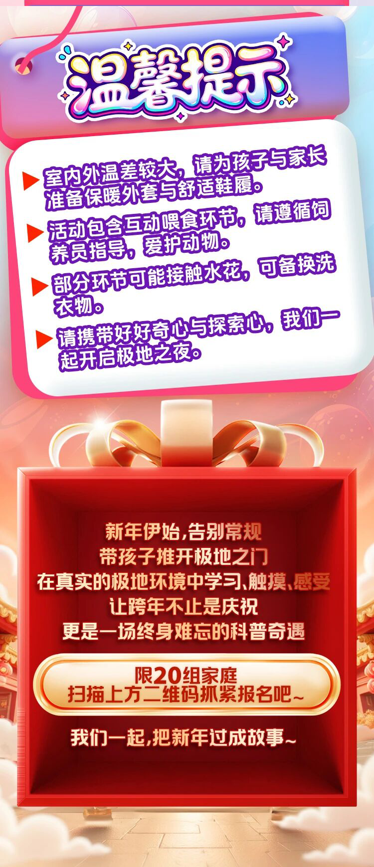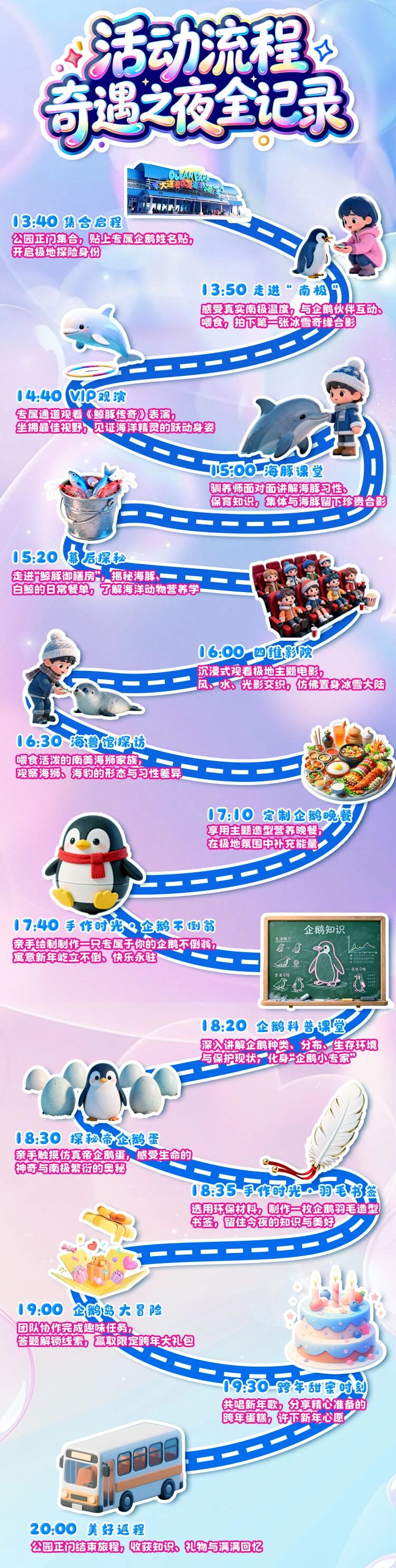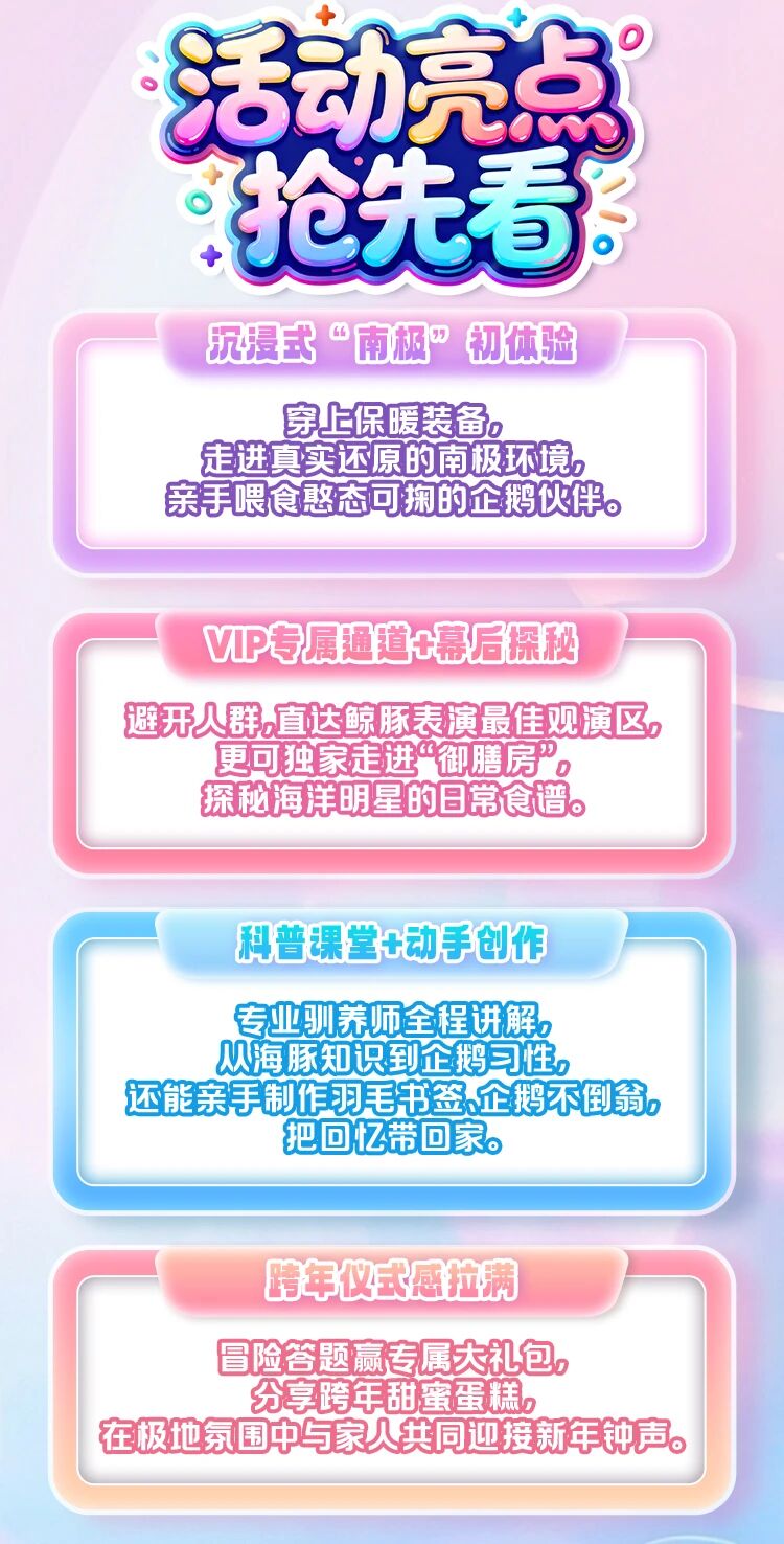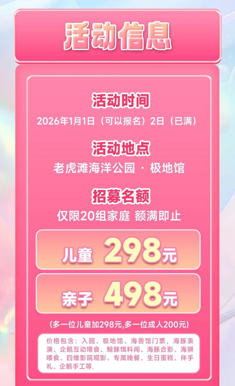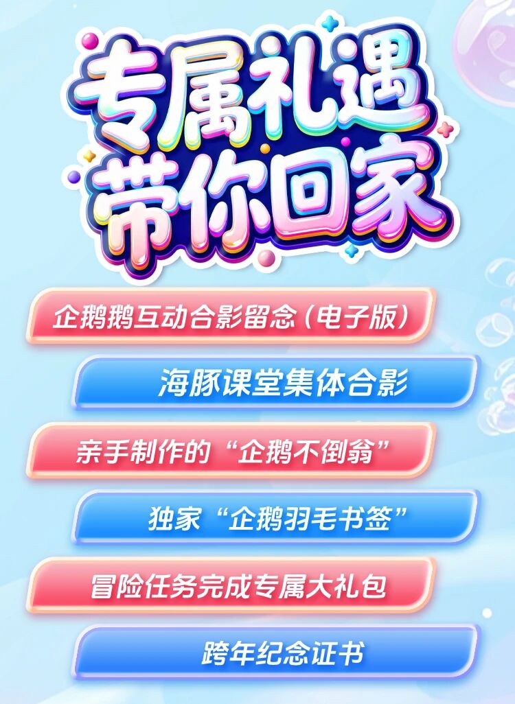 费用包含:入园、极地馆、海兽馆门票,海豚表演、企鹅互动喂食、鲸豚饵料间、海豚合影、海狮喂食、四维影院观影、专属晚餐、生日蛋糕、伴手礼、企鹅手工等