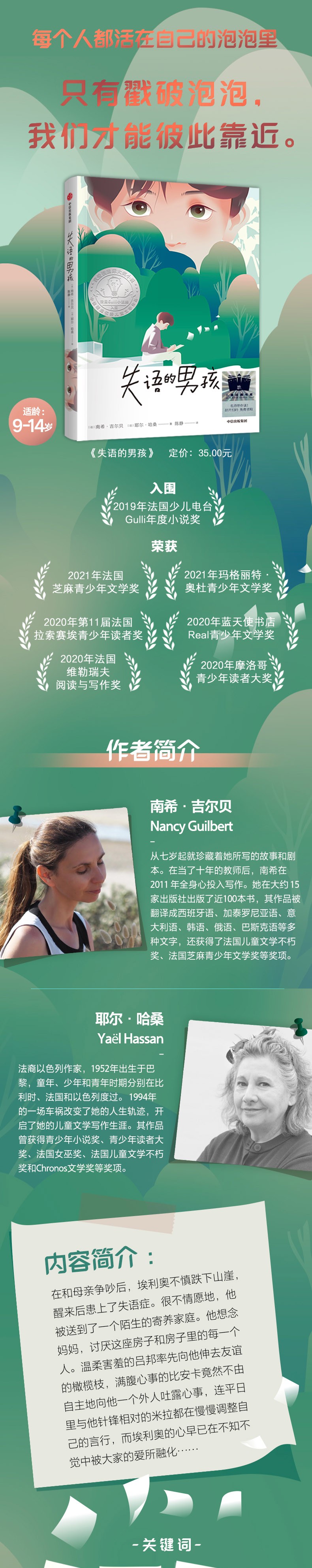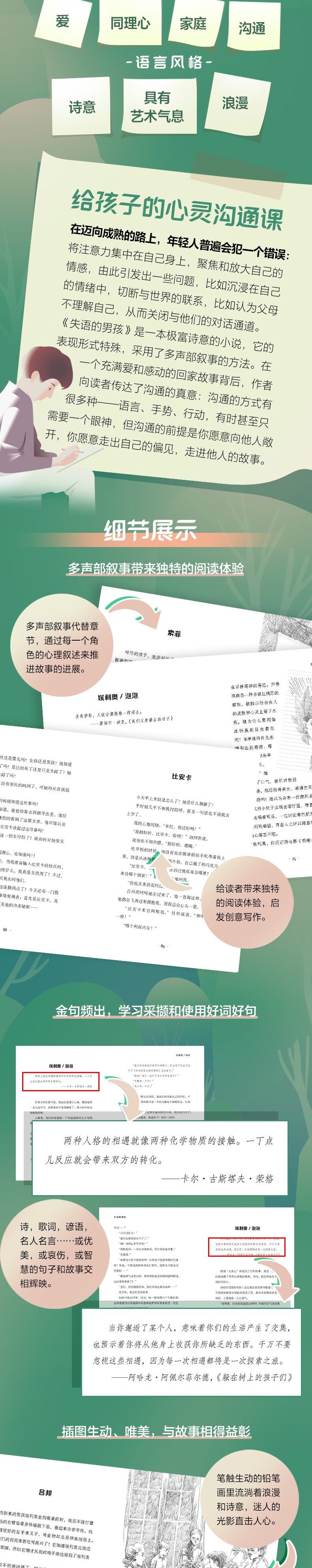在迈向成熟的路上,年轻人普遍会犯一个错误:将注意力集中在自己身上,聚焦和放大自己的情感,由此引发出一些问题,比如沉浸在自己的情绪中,切断与世界的联系,比如认为父母不理解自己,从而关闭与他们的对话通道。《失语的男孩》是一本极富诗意的小说,它的表现形式特殊,采用了多声部叙事的方法。在一个充满爱和感动的回家故事背后,作者向读者传达了沟通的真意:沟通的方式有很多种——语言、手势、行动,有时甚至只需要一个眼神,但沟通的前提是你愿意向他人敞开,你愿意走出自己的偏见,走进他人的故事。