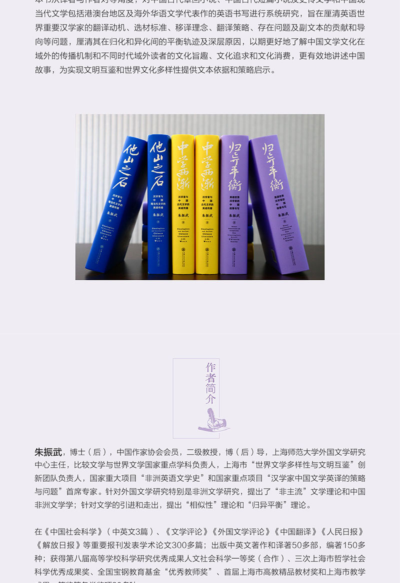 朱振武,博士(后),中国作家协会会员,二级教授,博(后)导,上海师范大学外国文学研究中心主任,比较文学与世界文学国家重点学科负责人,上海市“世界文学多样性与文明互鉴”创新团队负责人,国家重大项目“非洲英语文学史”和国家重点项目“汉学家中国文学英译的策略与问题”首席专家。针对外国文学研究特别是非洲文学研究,提出了“非主流”文学理论和中国非洲文学学;针对文学的引进和走出,提出“相似性”理论和“归异平衡”理论。