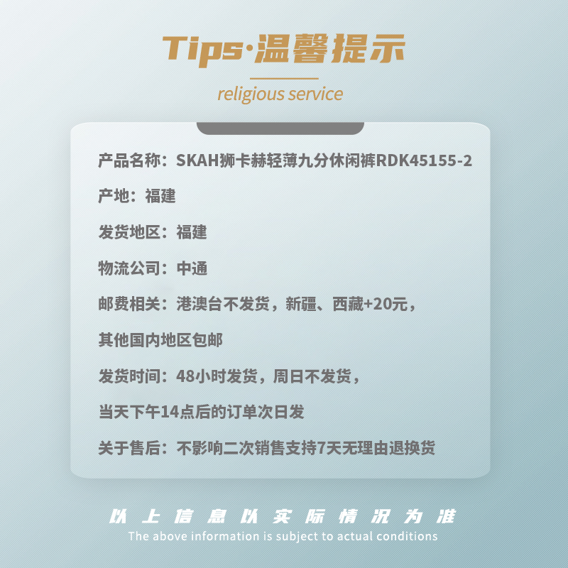 【舒适轻盈体感!】SKAH狮卡赫轻薄九分休闲裤RDK45155-2 夏季薄款日常通勤出行百搭运动 细腻触感透气中长裤