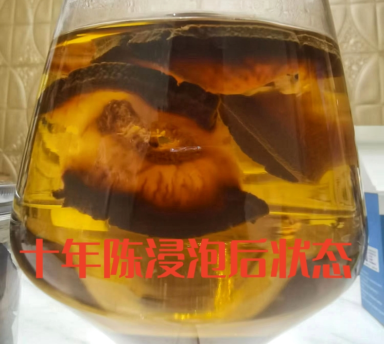 (上图)10年陈浸泡后,内质的果肉还没有完全转化,果肉还呈现浅色,浸泡后果肉吸水后很快膨大。