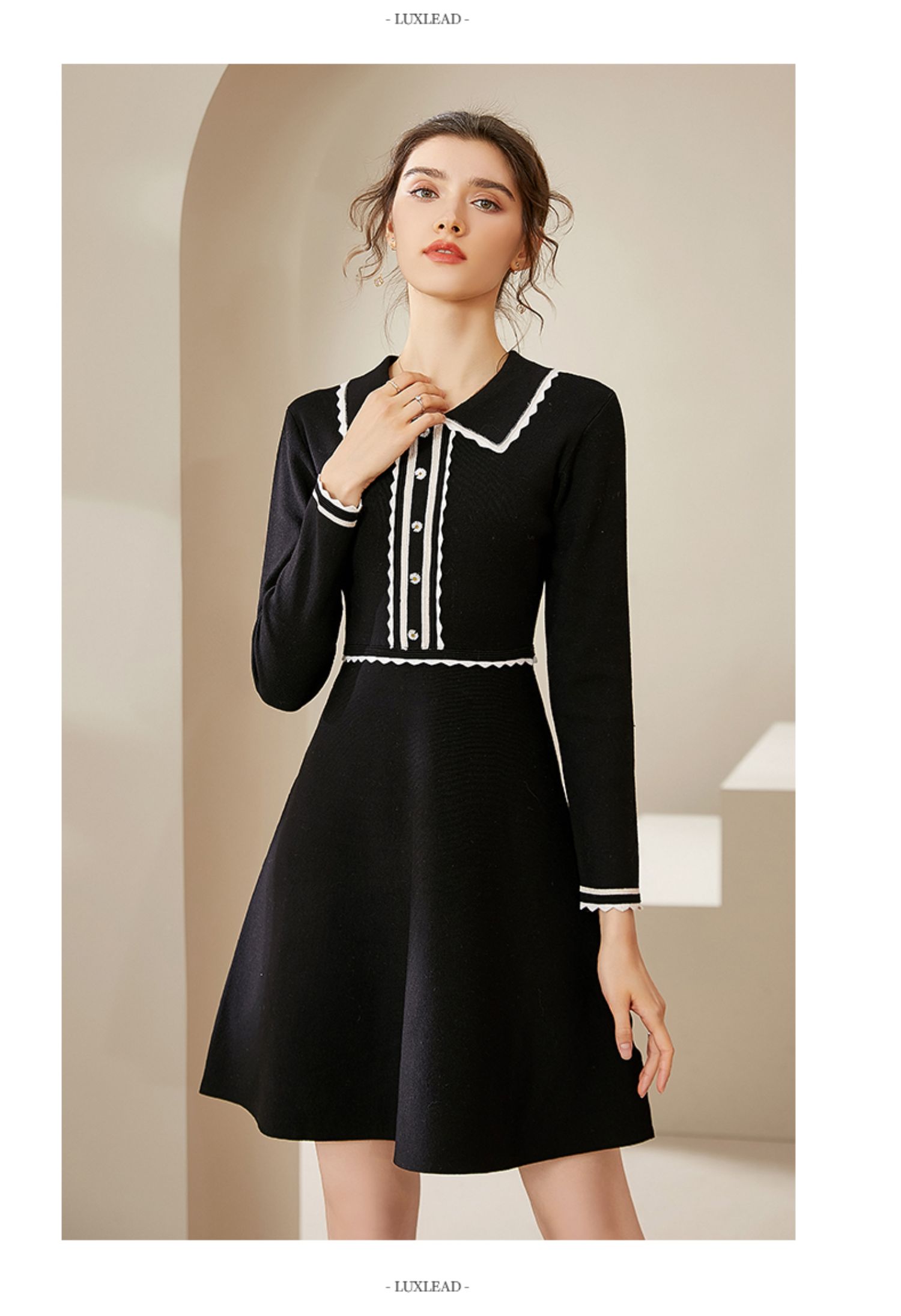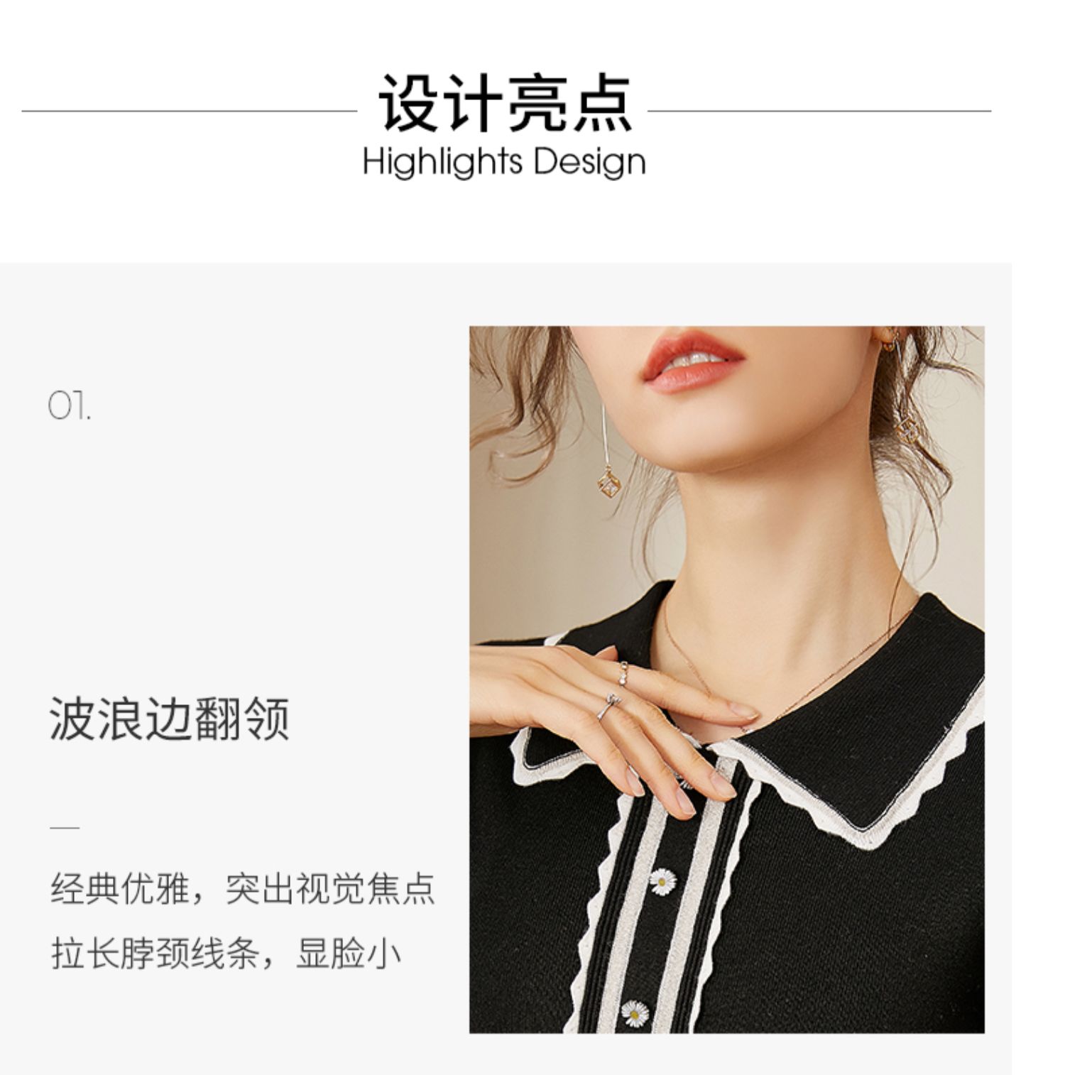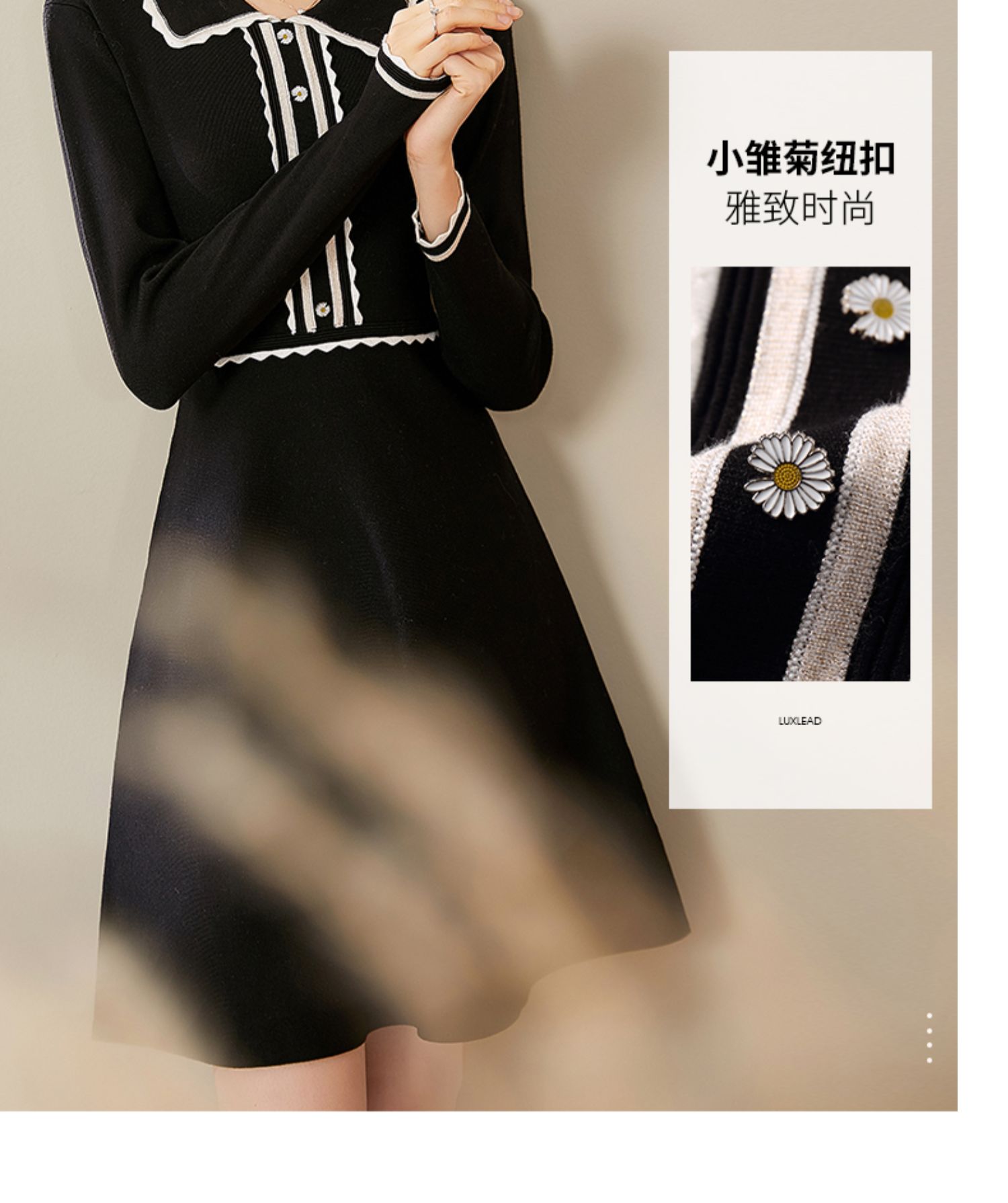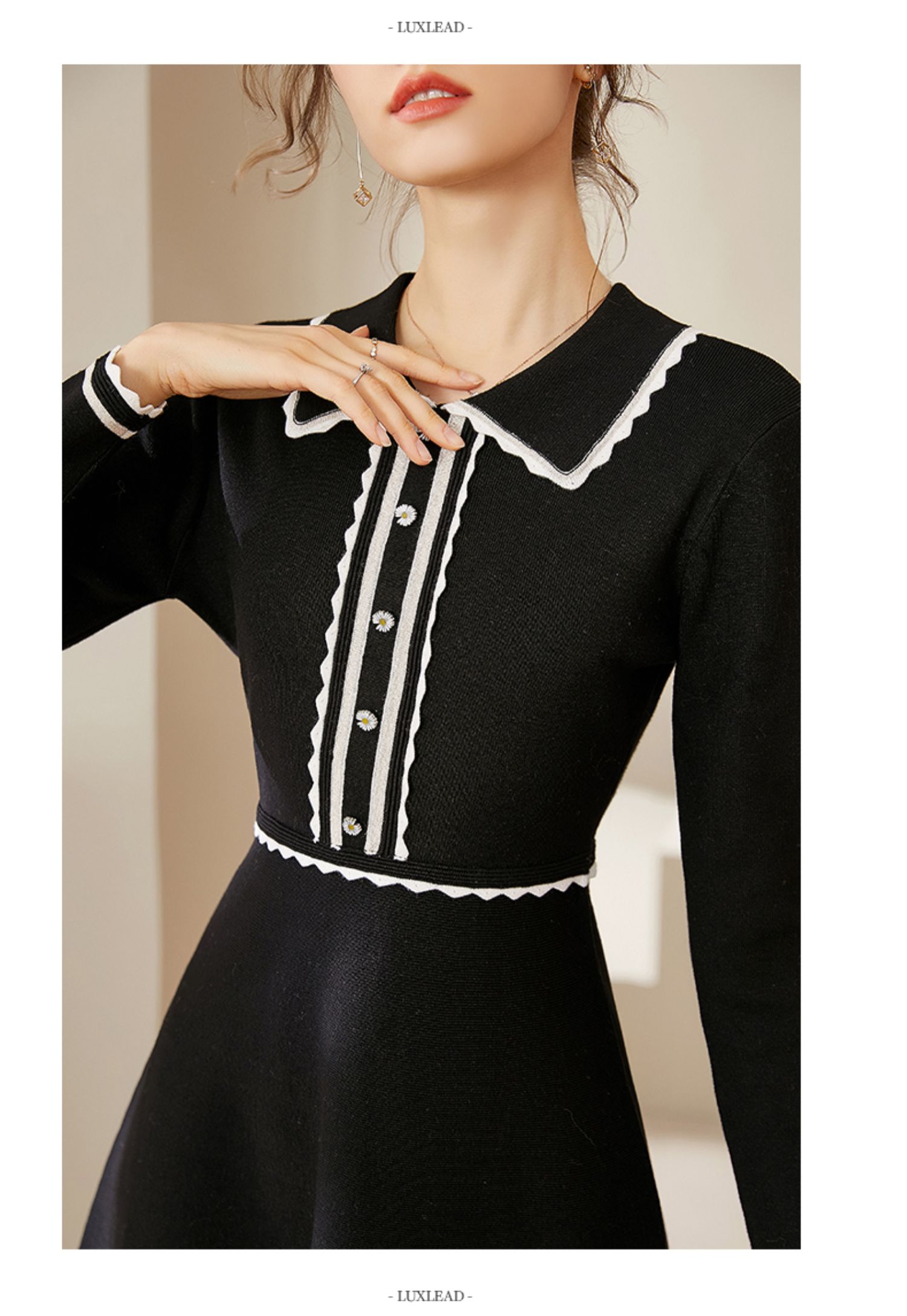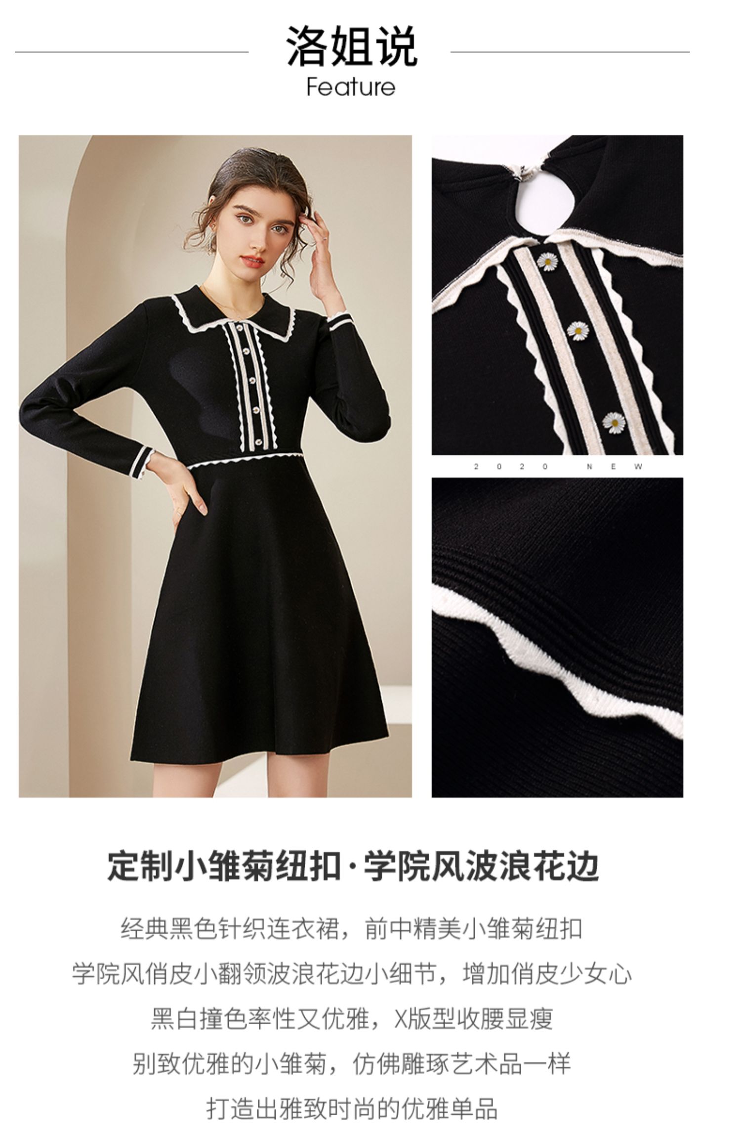 洛诗2020冬季新款小雏菊纽扣学院风花边领收腰修身A字针织连衣裙