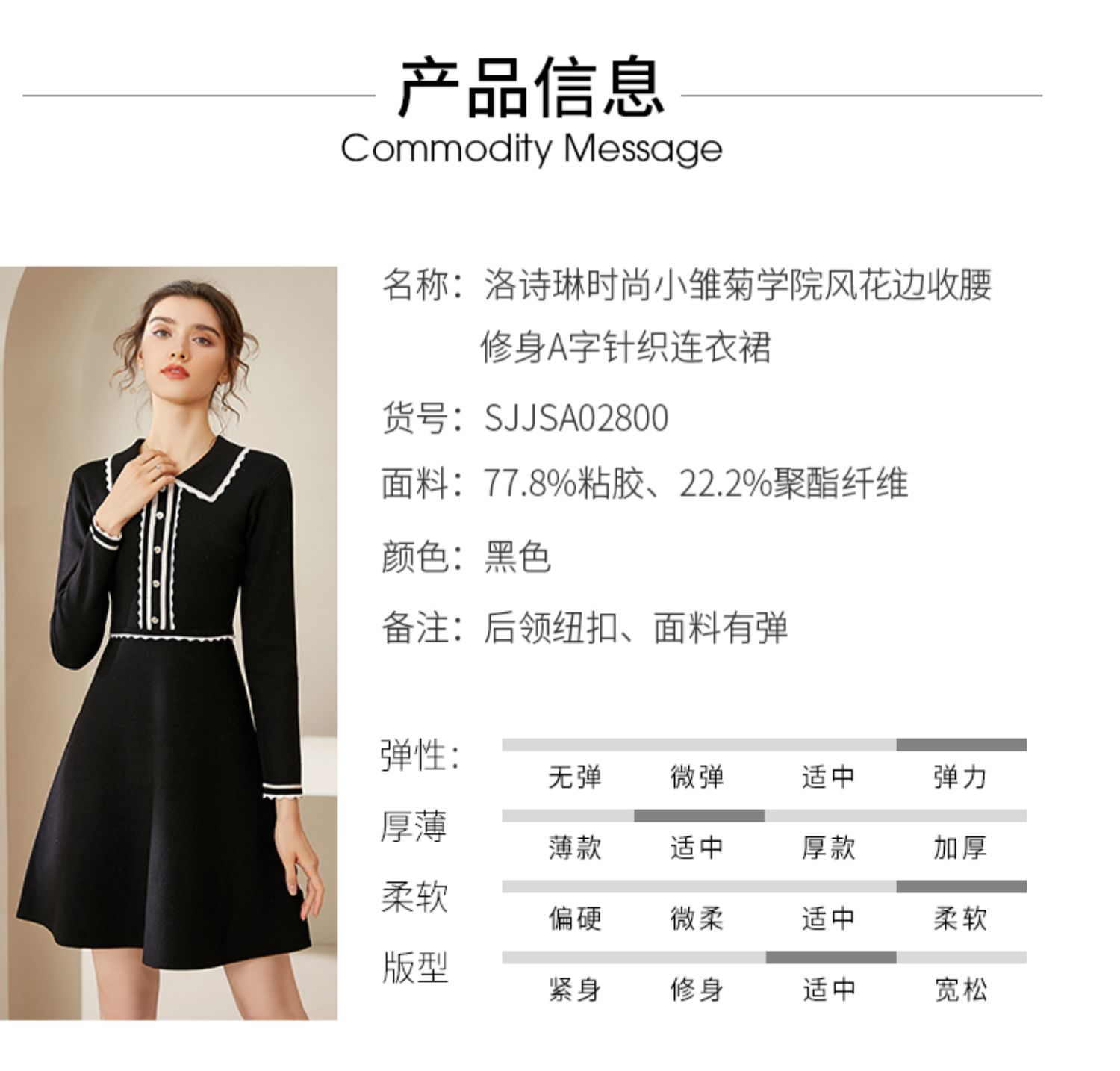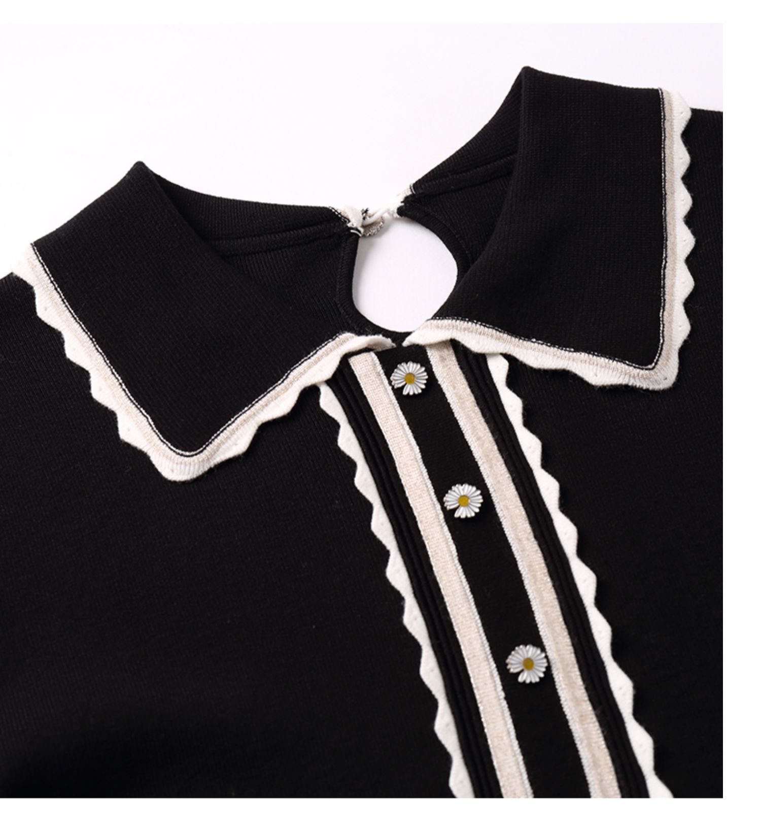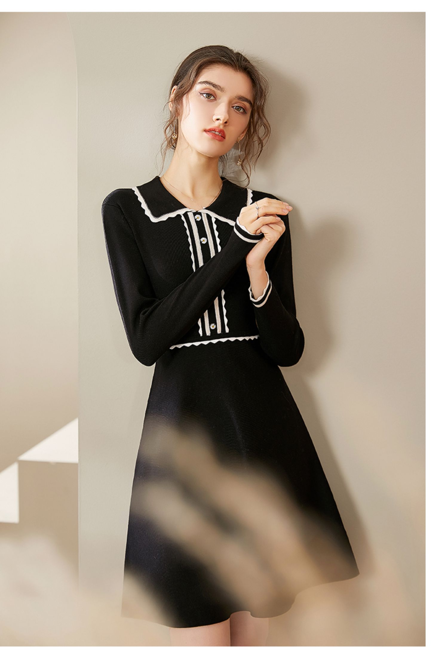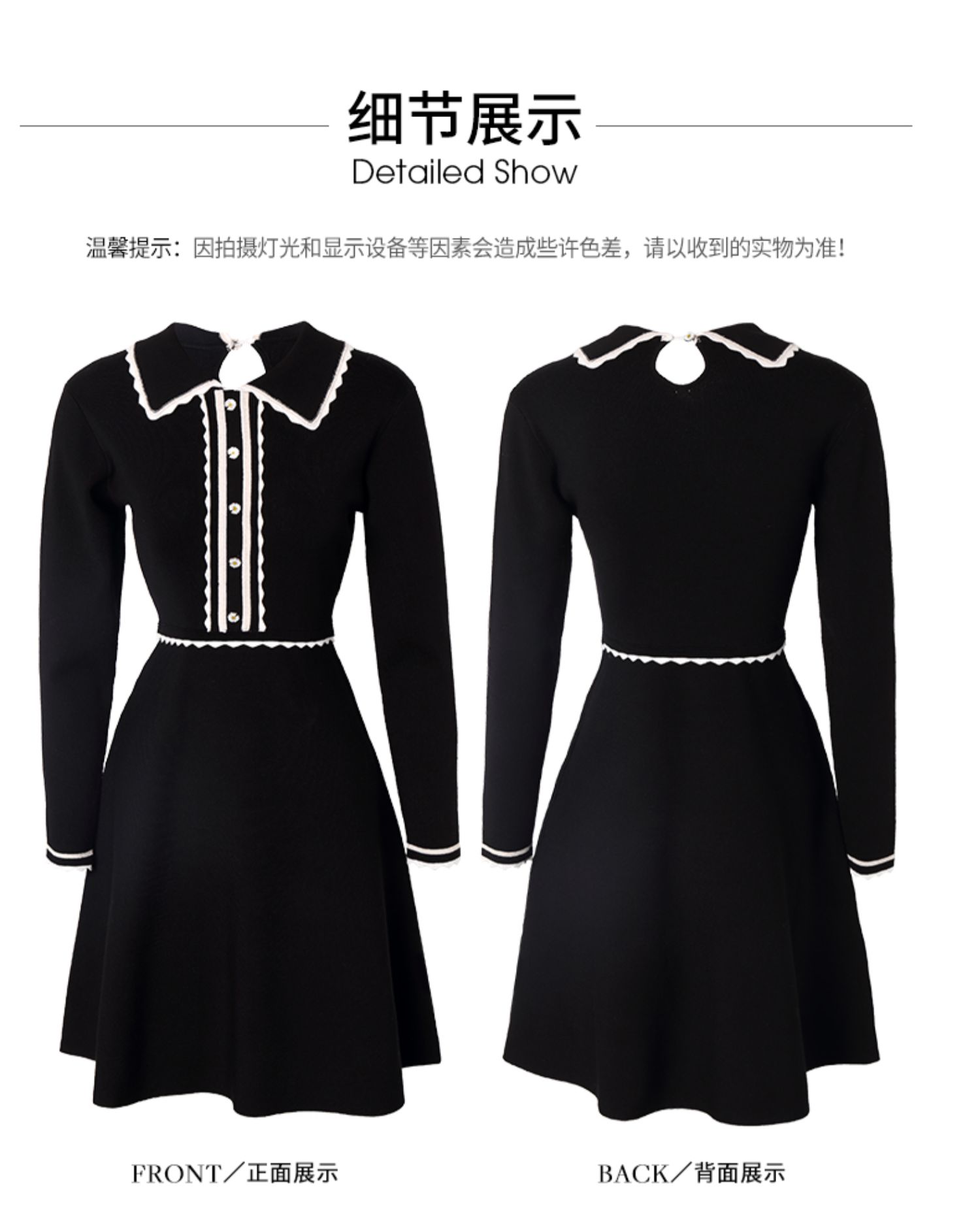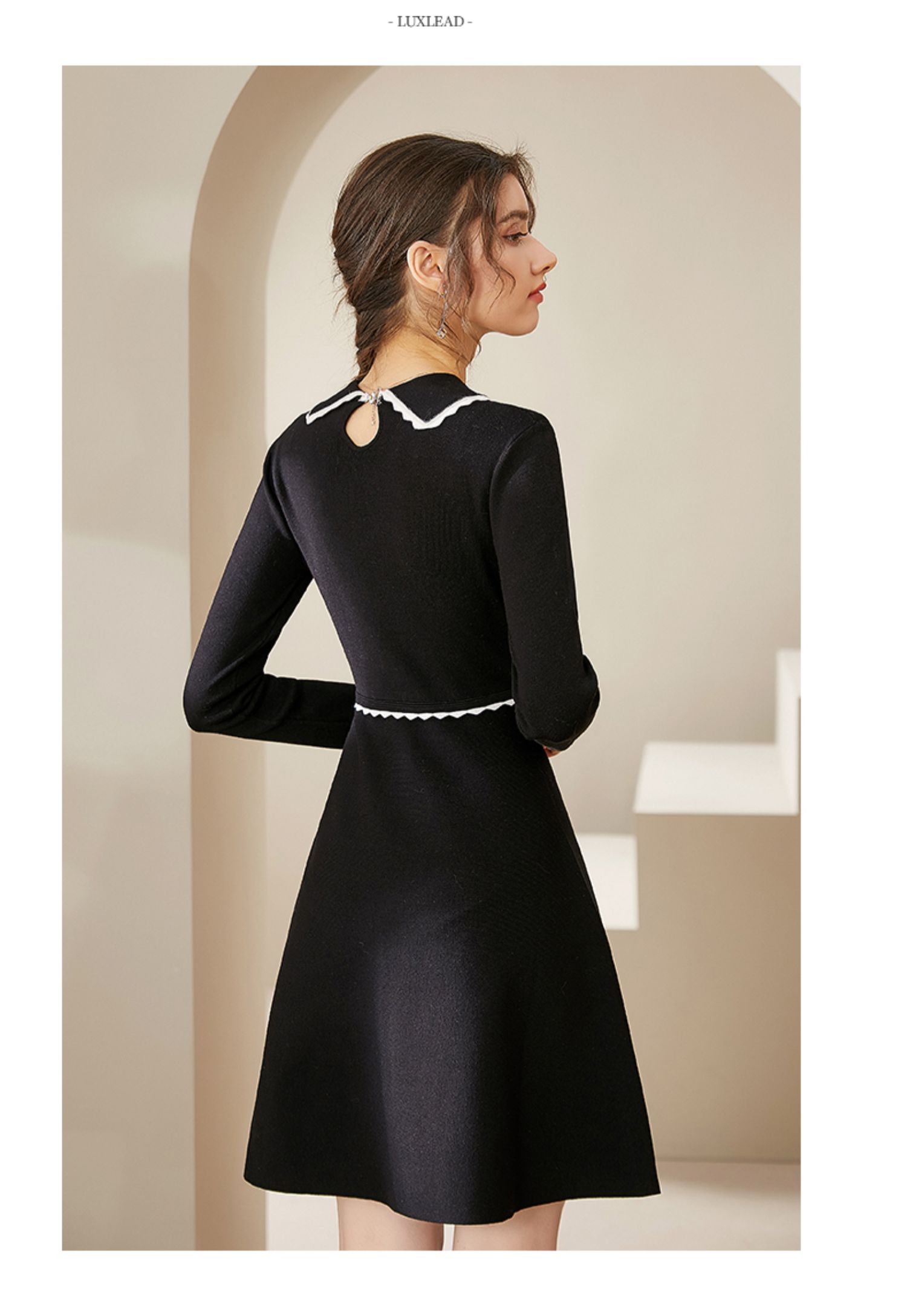 洛诗2020冬季新款小雏菊纽扣学院风花边领收腰修身A字针织连衣裙