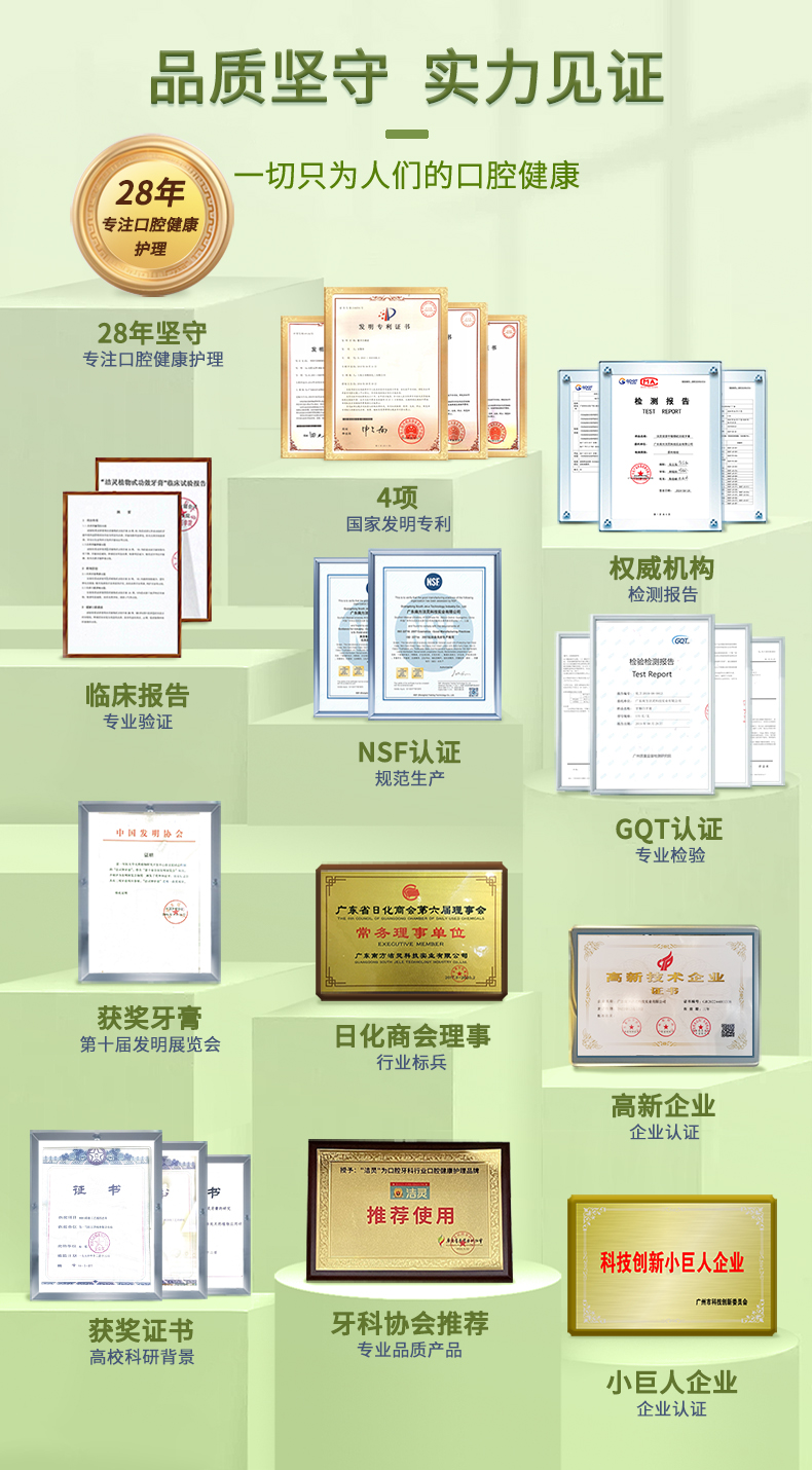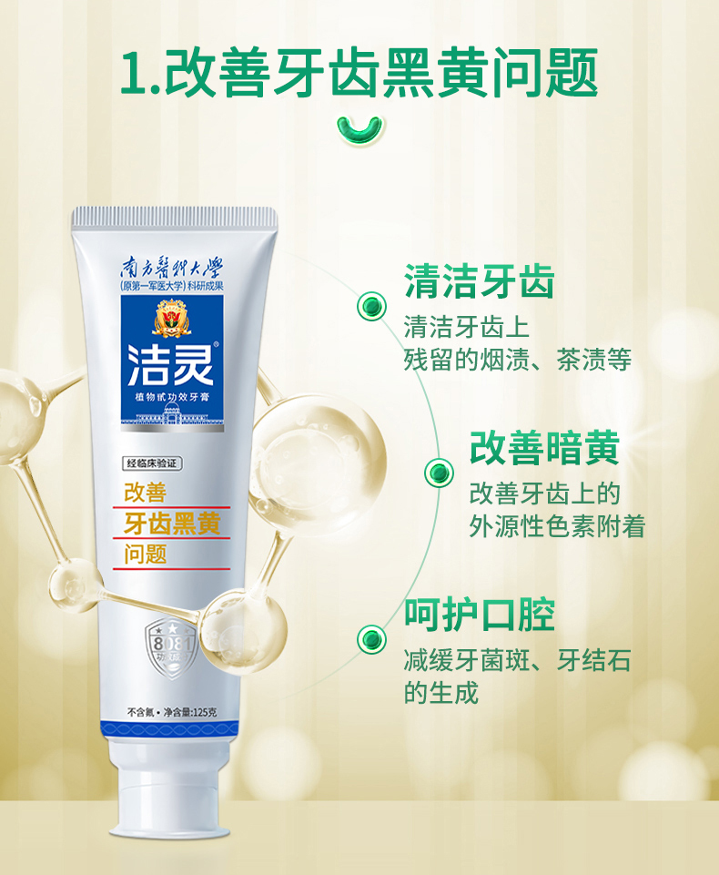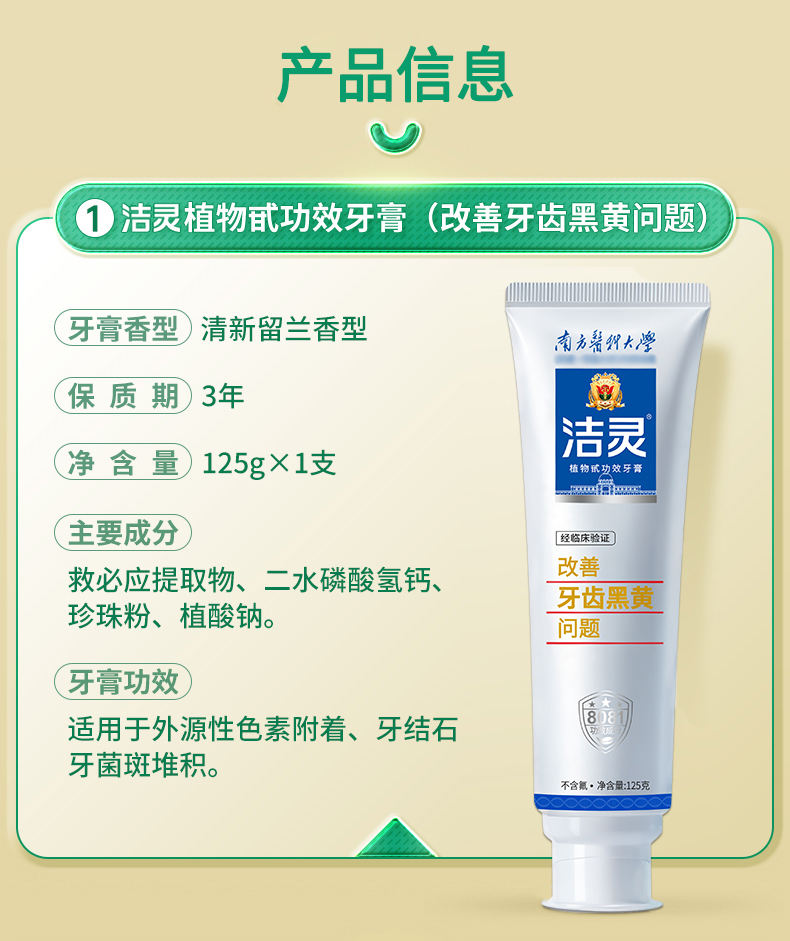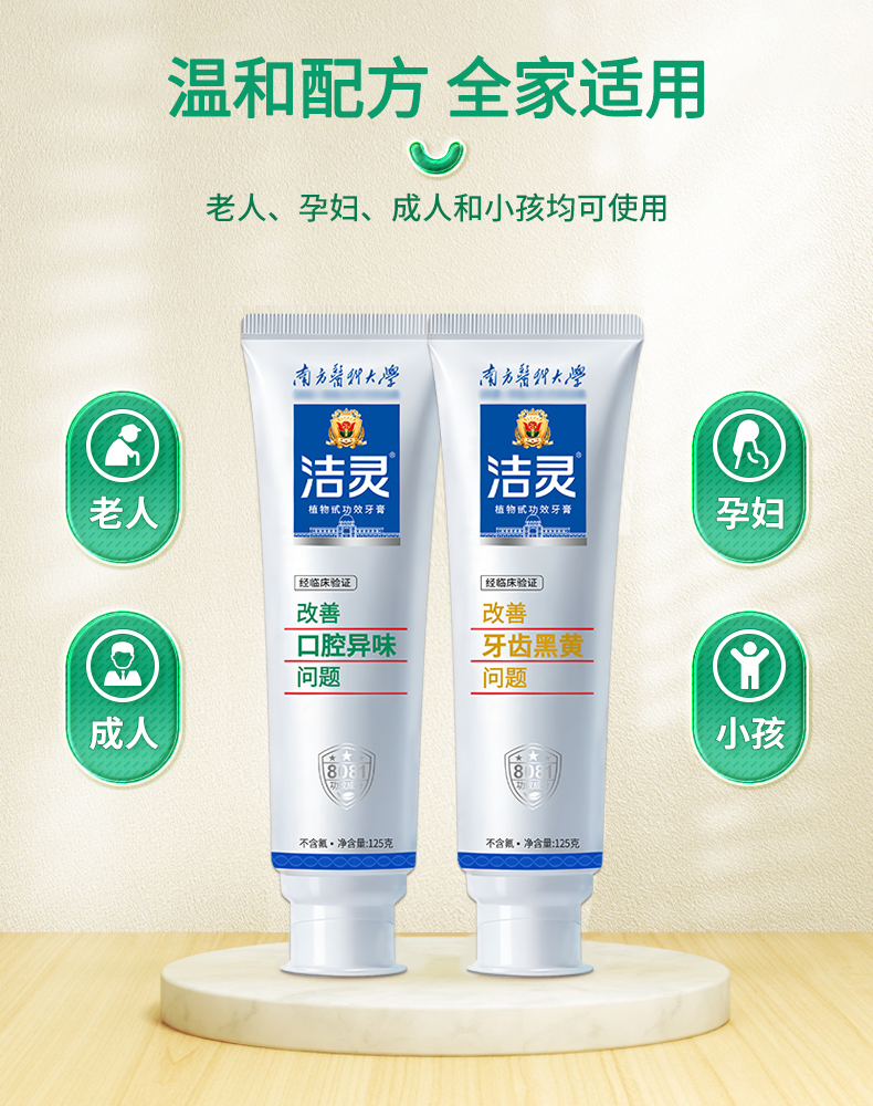 - 洁灵牙膏,由南方医科大学研制,牙膏的核心8081功效成分效果出众,在第十届全国发明展览会成为获奖牙膏。