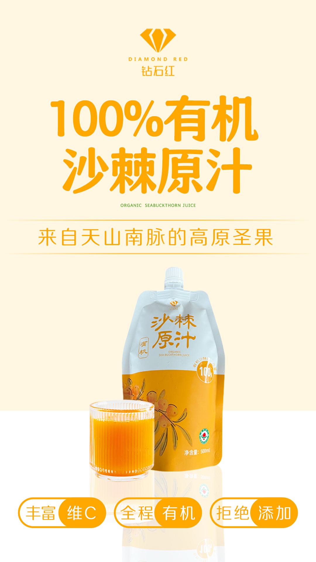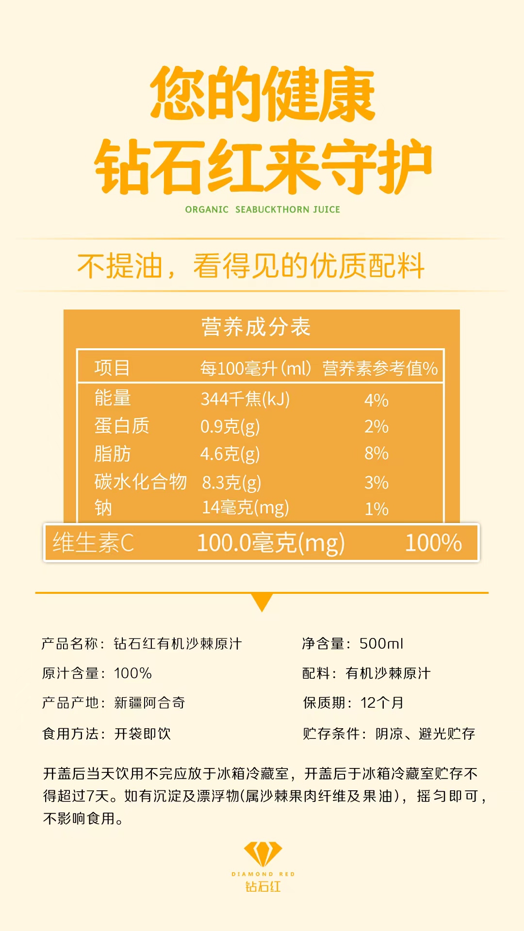 有机沙棘原汁 | 500ml/袋 大果富含沙棘油 奶香味足 维生素C优质来源 丰富黄酮 钻石红