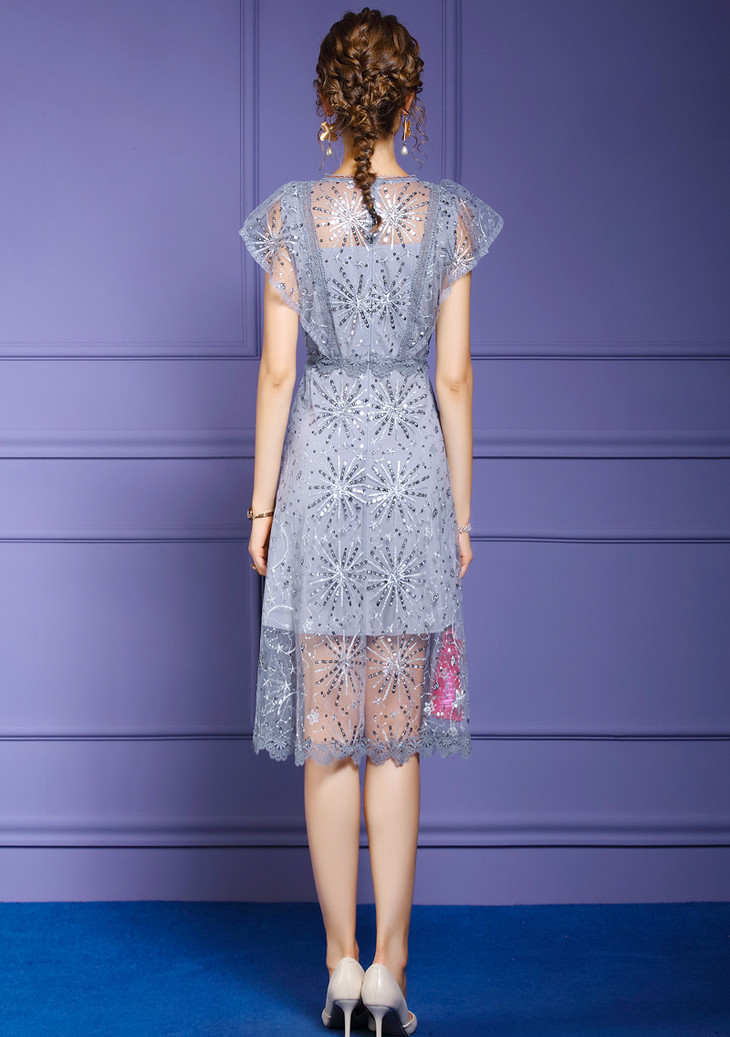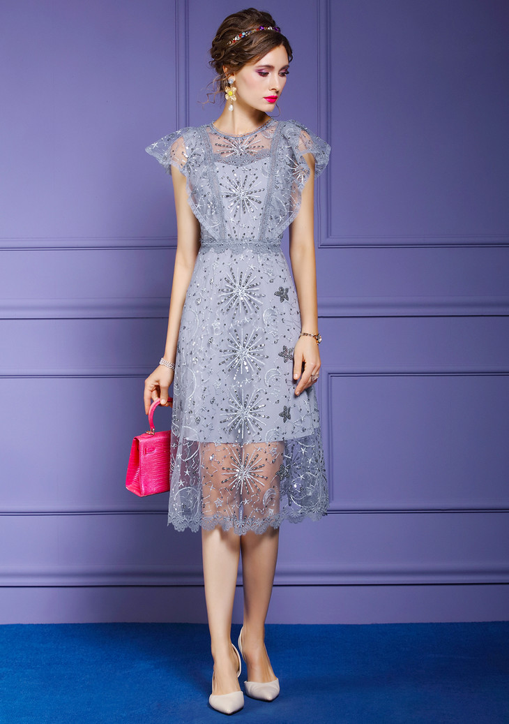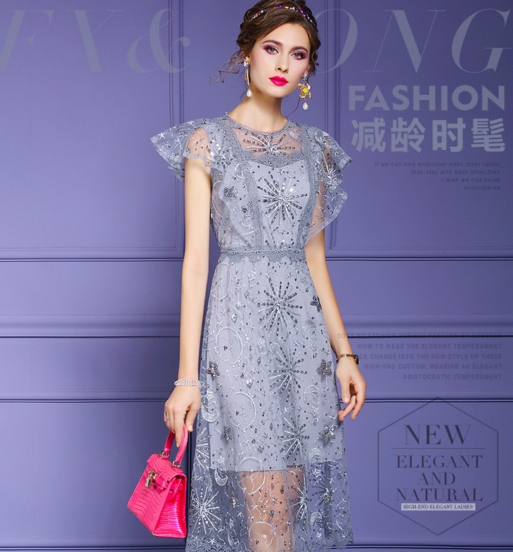 FMY-F20XL33040夏季名媛淑女减龄亮片超仙网布绣花连衣裙