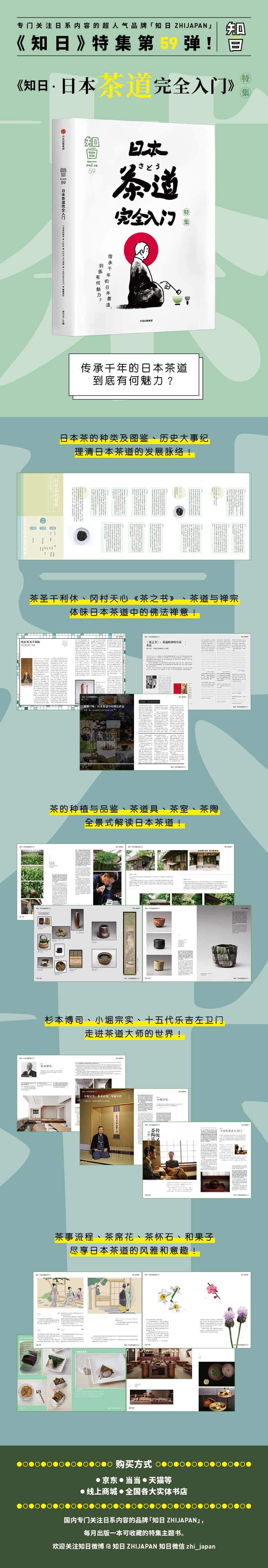 《知日·日本茶道完全入门》为专门关注日系内容品牌“知日”系列的第59本特集书,是一本社科人文类普及读物。本期以日本茶道为主题,全面解析日本茶从茶汤到茶道的演变,以及如今茶道作为一门综合性艺术的构成元素。主要篇目包括:日本茶的种类与品鉴;茶道的定义与历史;茶人代表之千利休、武者小路千家与小崛宗实;茶室、茶庵与茶道具;点茶方式与礼仪、四季茶会、和果子与怀石料理、人气茶铺指南与“茶道”博物馆巡礼等。不仅是碗中茶,包括花、建筑等“代表日本”的古老生活方式,与谦逊感恩的传统礼节都在茶道中得到了充分保留。从这个意义上说,认识日本茶道也是理解日本的有益尝试。