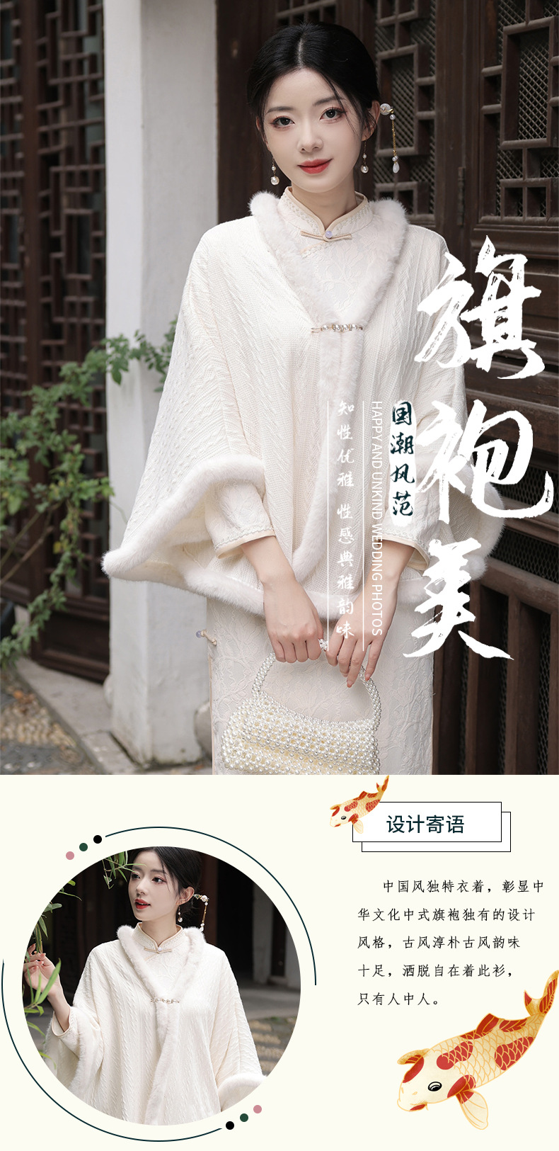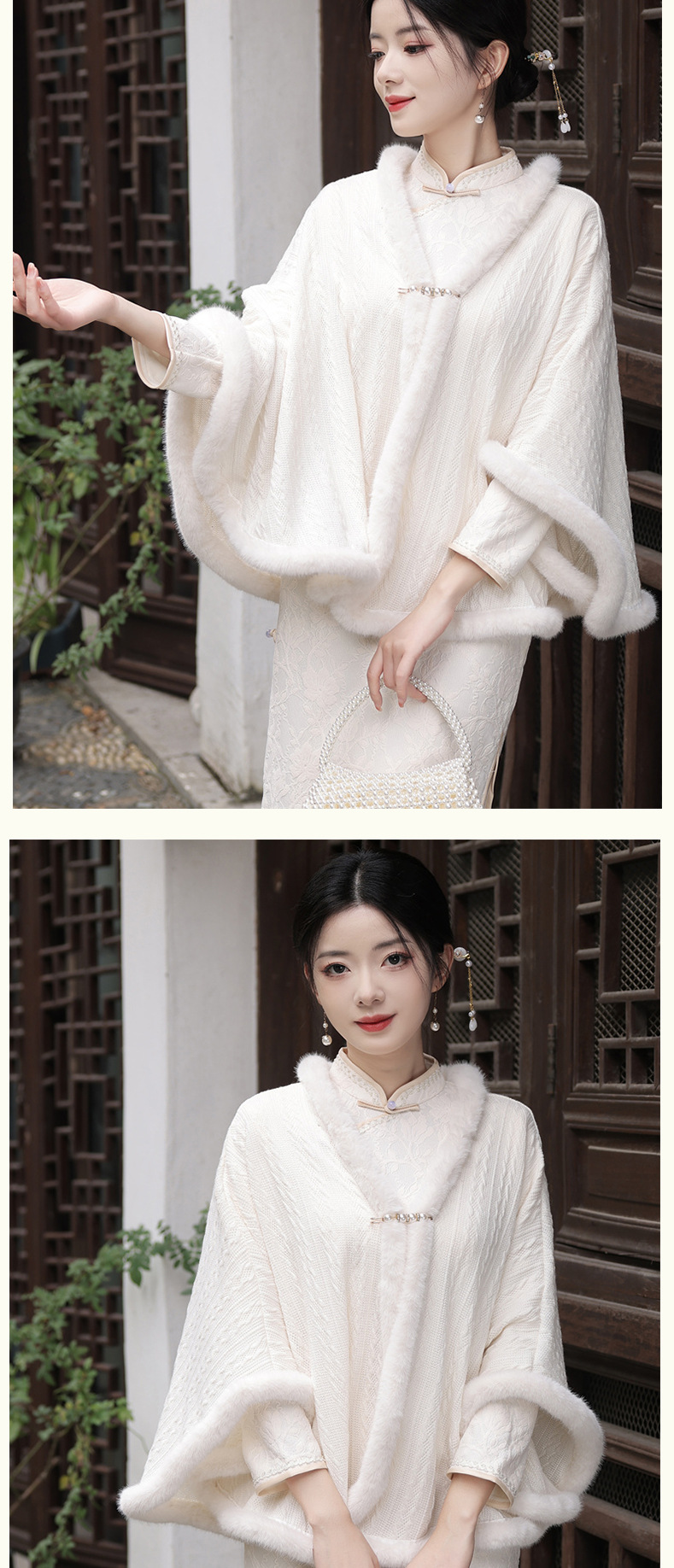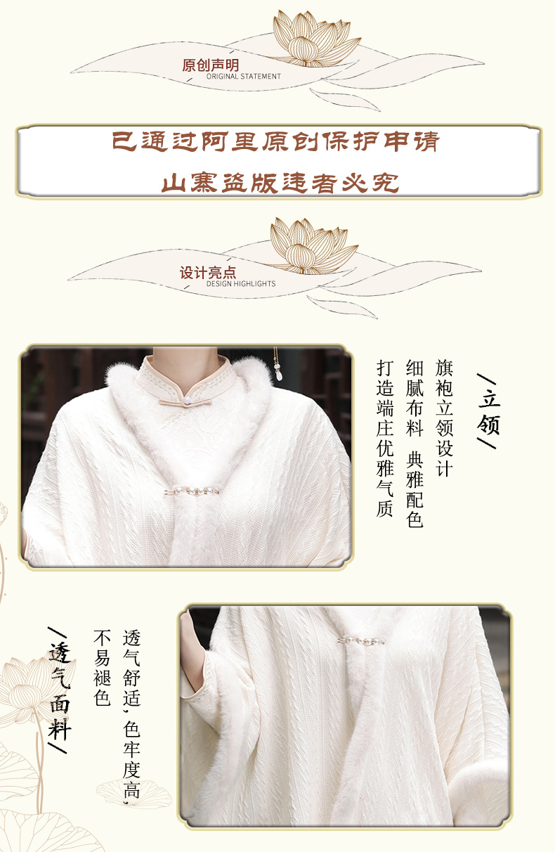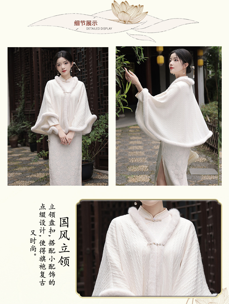 JN秋冬加毛披肩长款复合超柔蕾丝旗袍两件套立领斜襟气质女旗袍