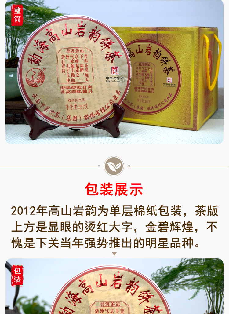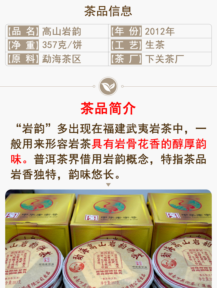 2012年下关高山岩韵普洱茶生茶饼 精选8年陈老料配制 岩韵滋味独特 干仓真品好口感