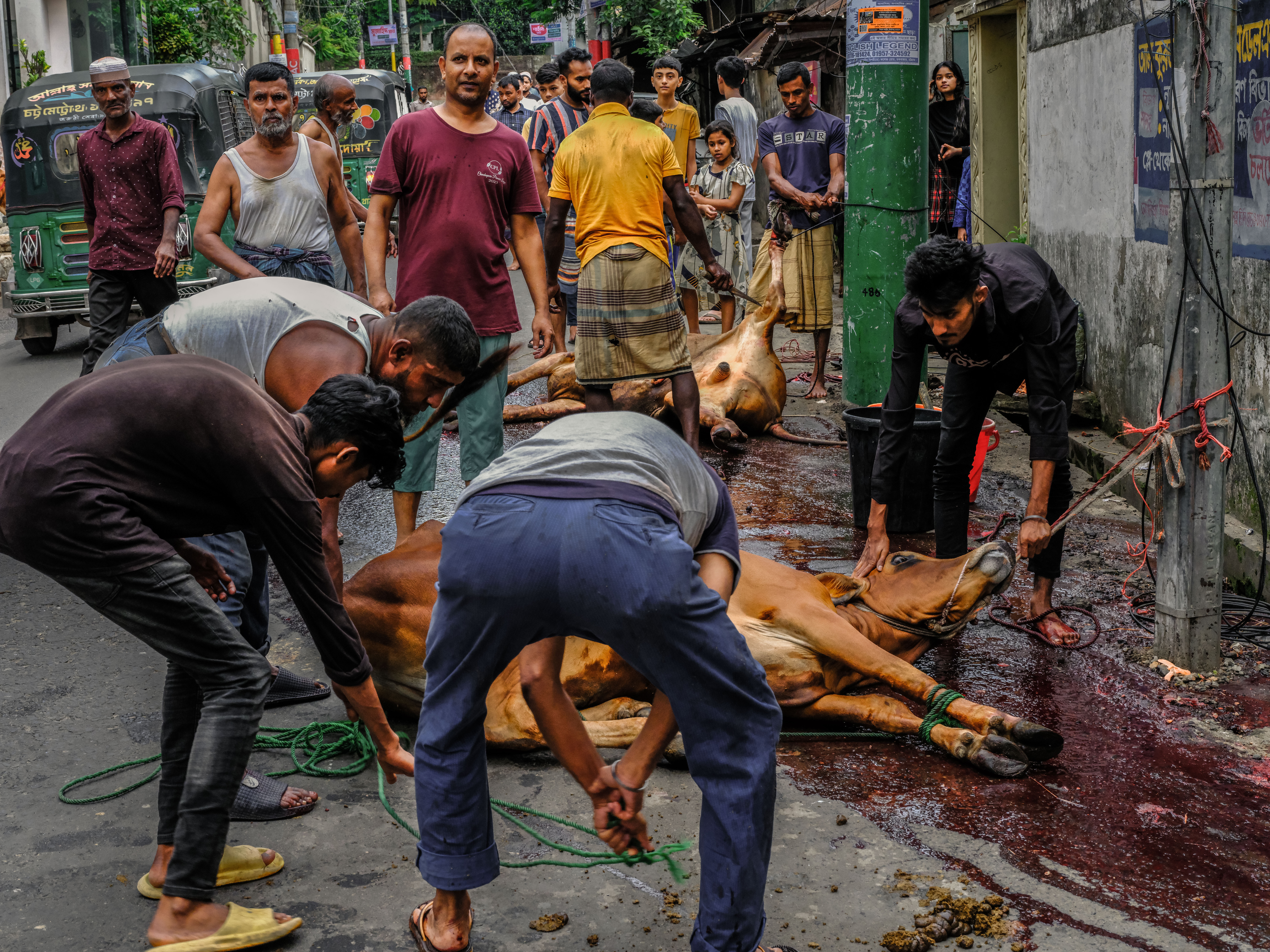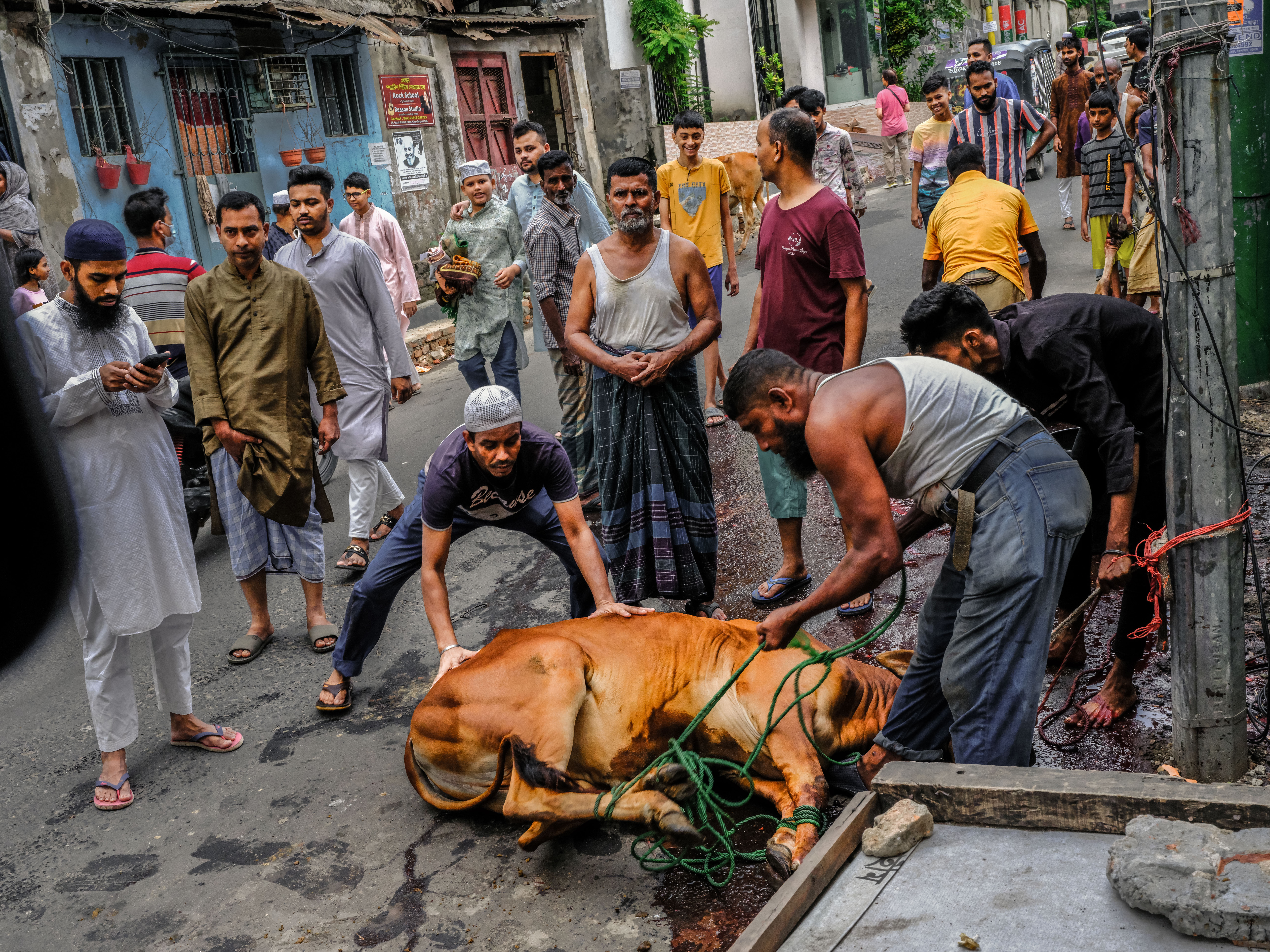早起前往拍摄宰牲节仪式,街头巷尾的宰牛/羊场景、分食肉类的人群;下午前往Karail贫民窟,这是达卡最大的贫民窟之一,拍摄开斋节穿新衣庆祝的儿童、社区生活等;之后送往孟加拉国际机场,搭乘国际航班飞机返回国内。