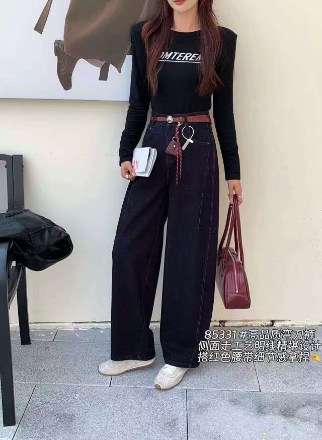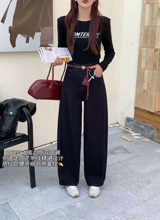 【牛仔裤】85331高弹力秋款红腰带弯刀阔腿裤直筒裤简约时尚牛仔裤女-喜出