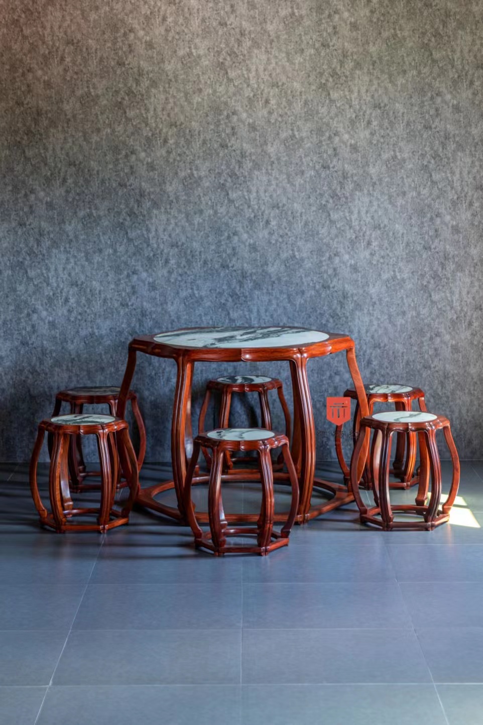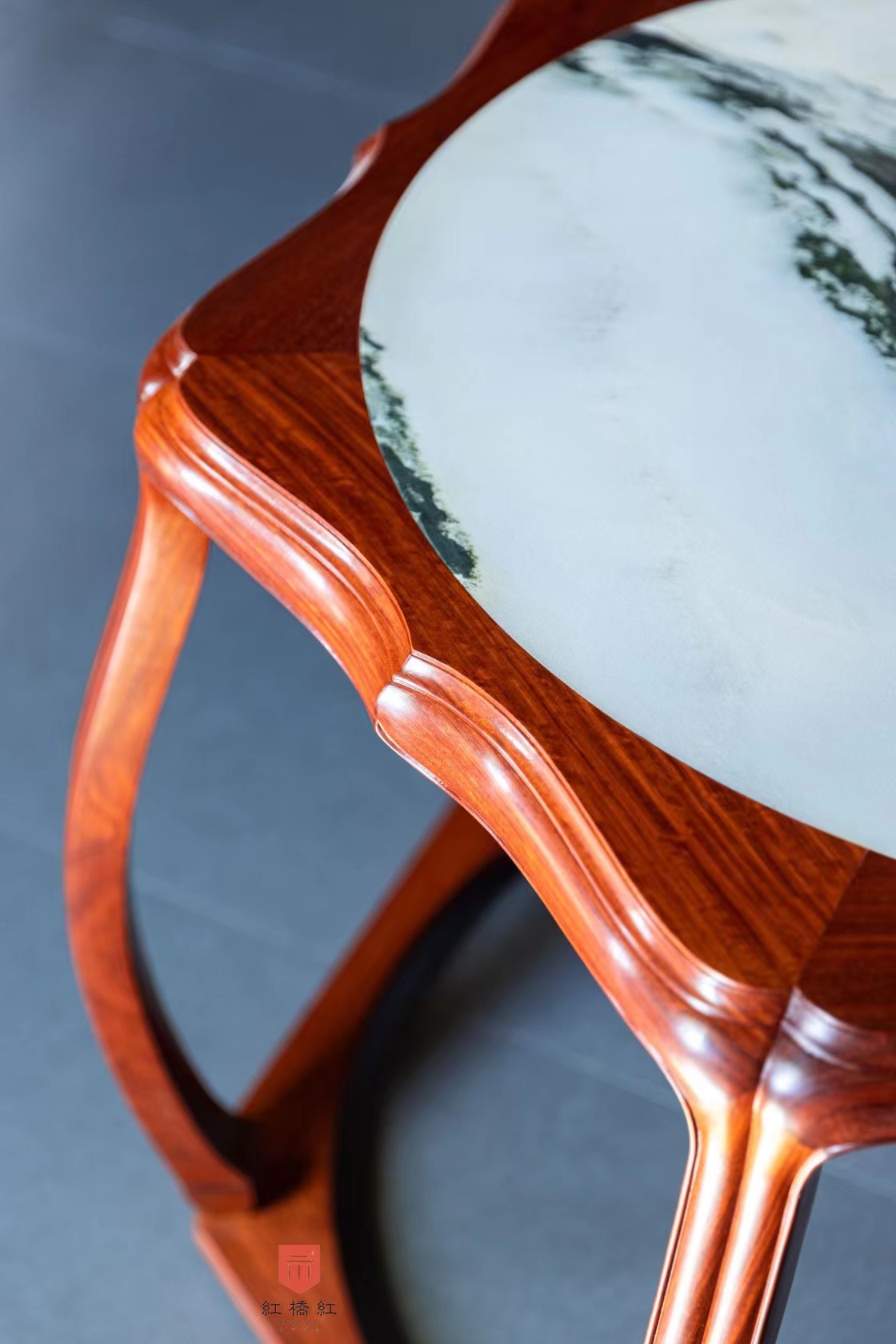 鼓腿与桌面以插肩榫相接,做上部收腿内翻,使鼓腿整体显“S”形,犹如圆桌的杨柳柔腰,整体增添了美感和活力,造型独特,透显无尽雅致之韵。