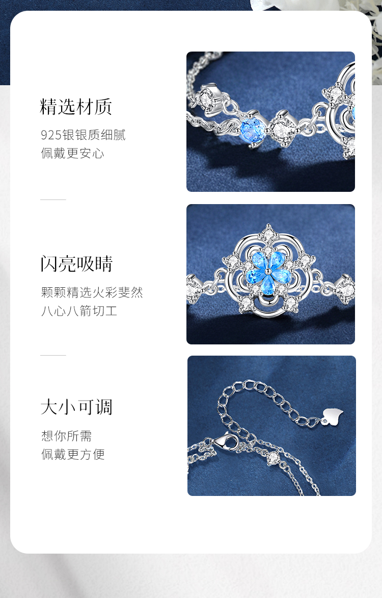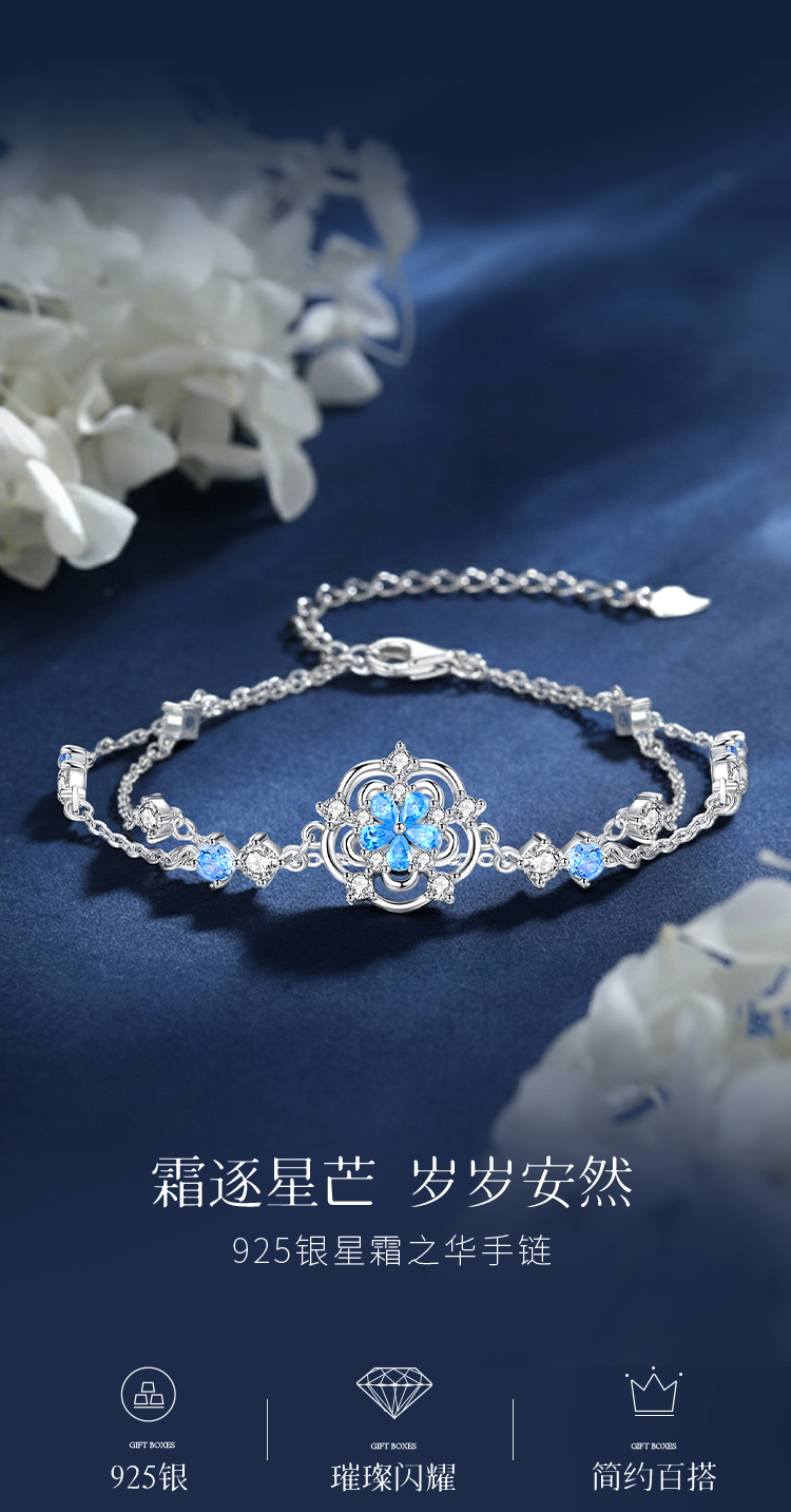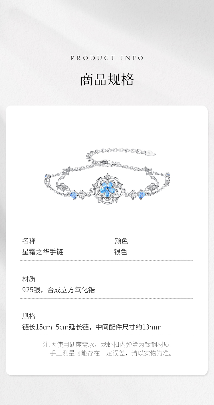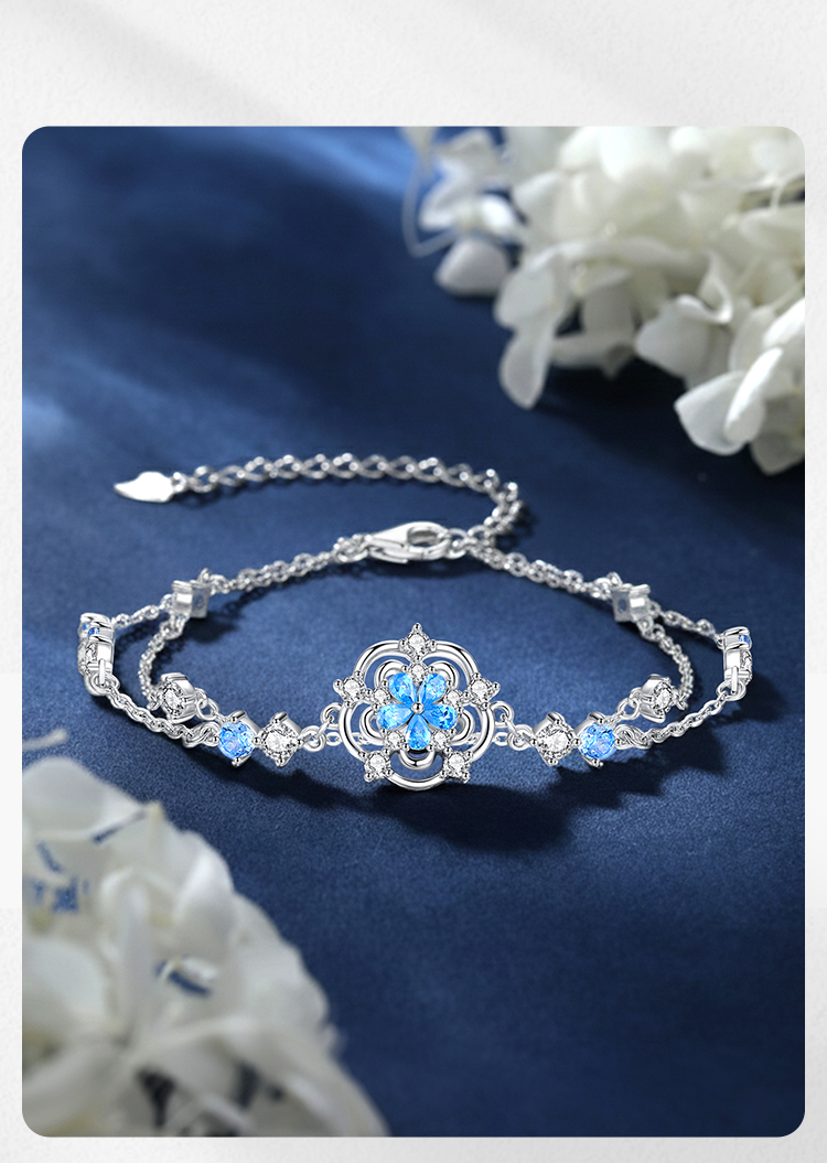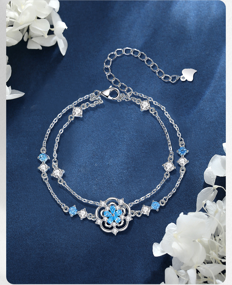 Winy 星霜之华 S925 银手链 冰蓝合成立方氧化锆双层链 甜美元素精致花型腕间饰品