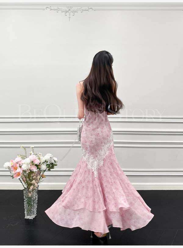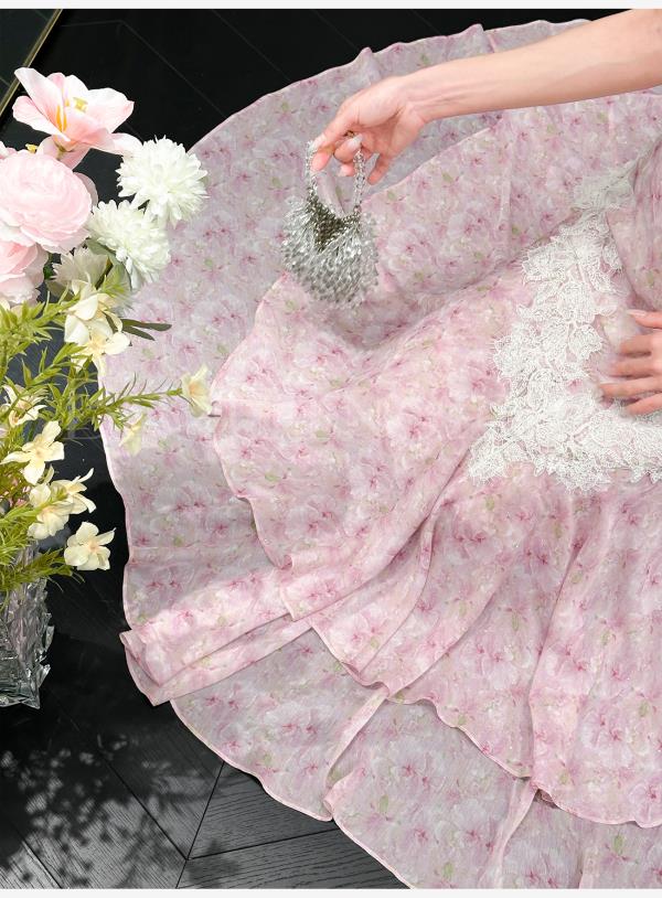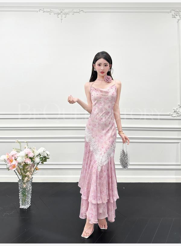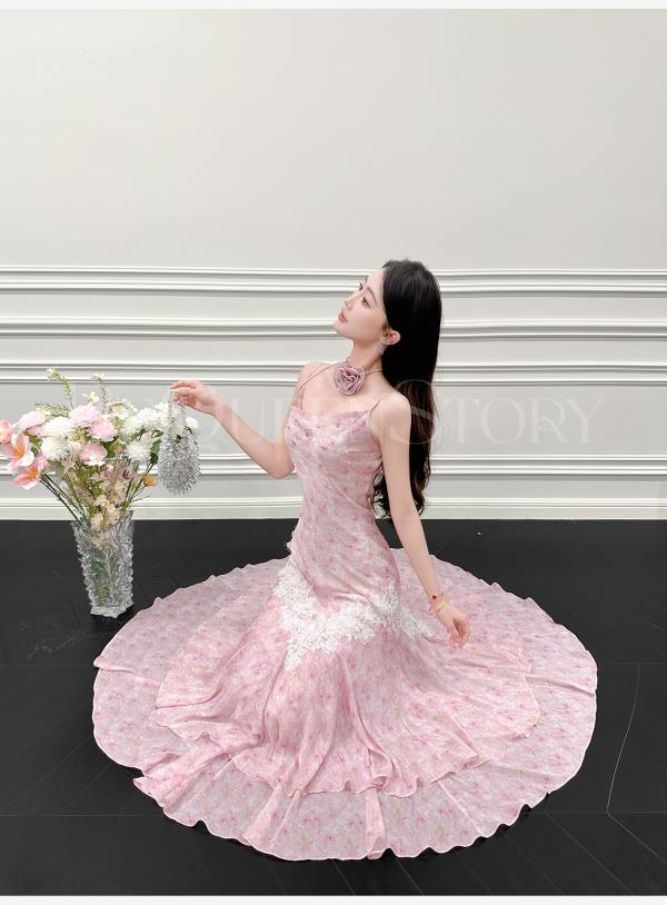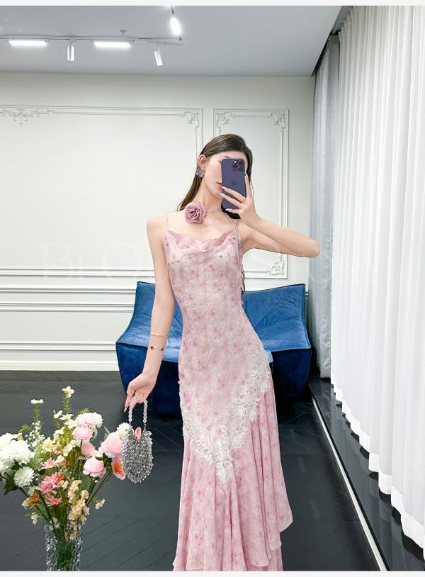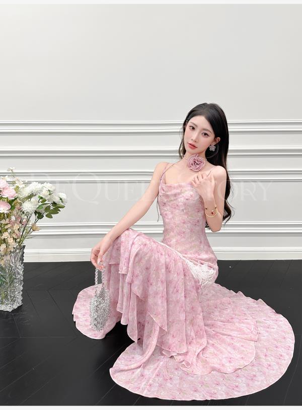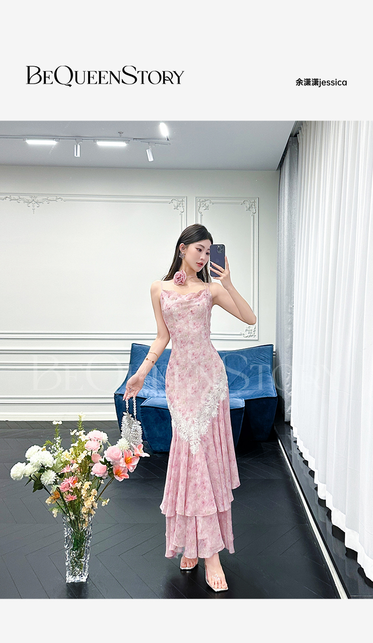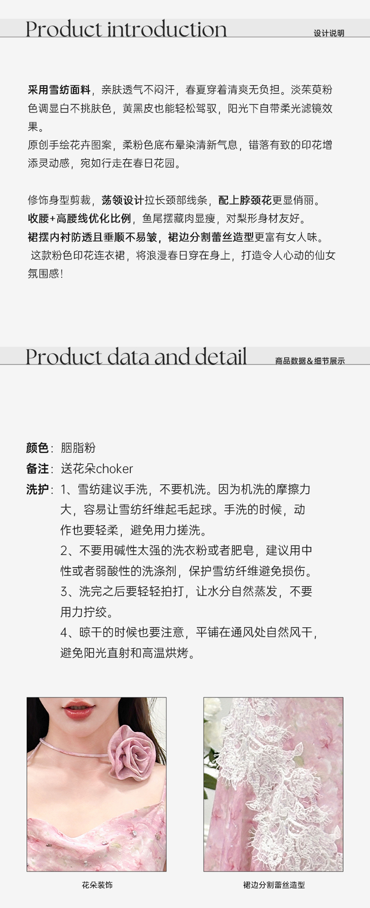 【孤品样衣,不退不换】【胭脂花落】轻奢原创手绘晕染印花荡领收腰吊带连衣裙