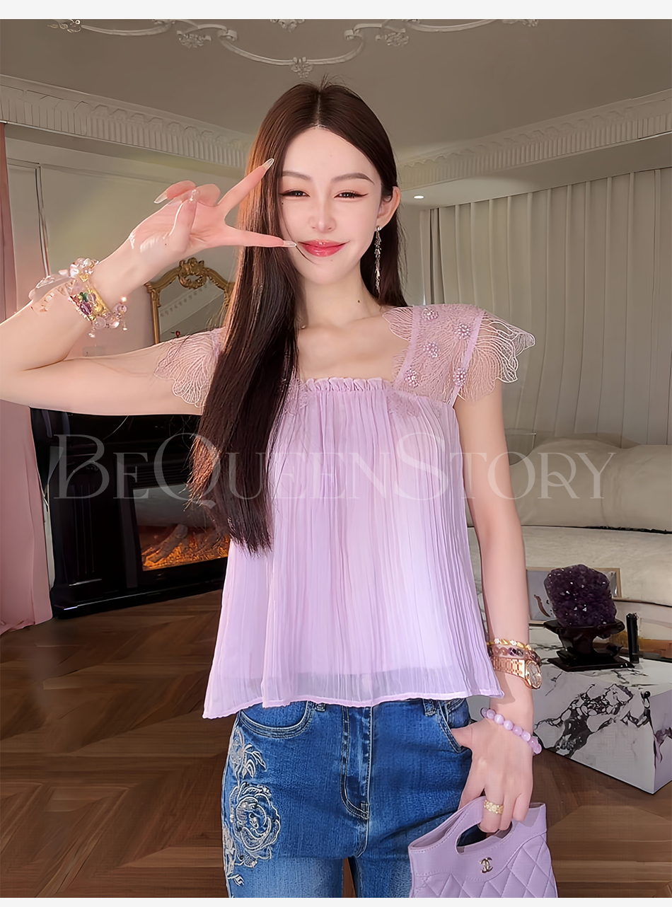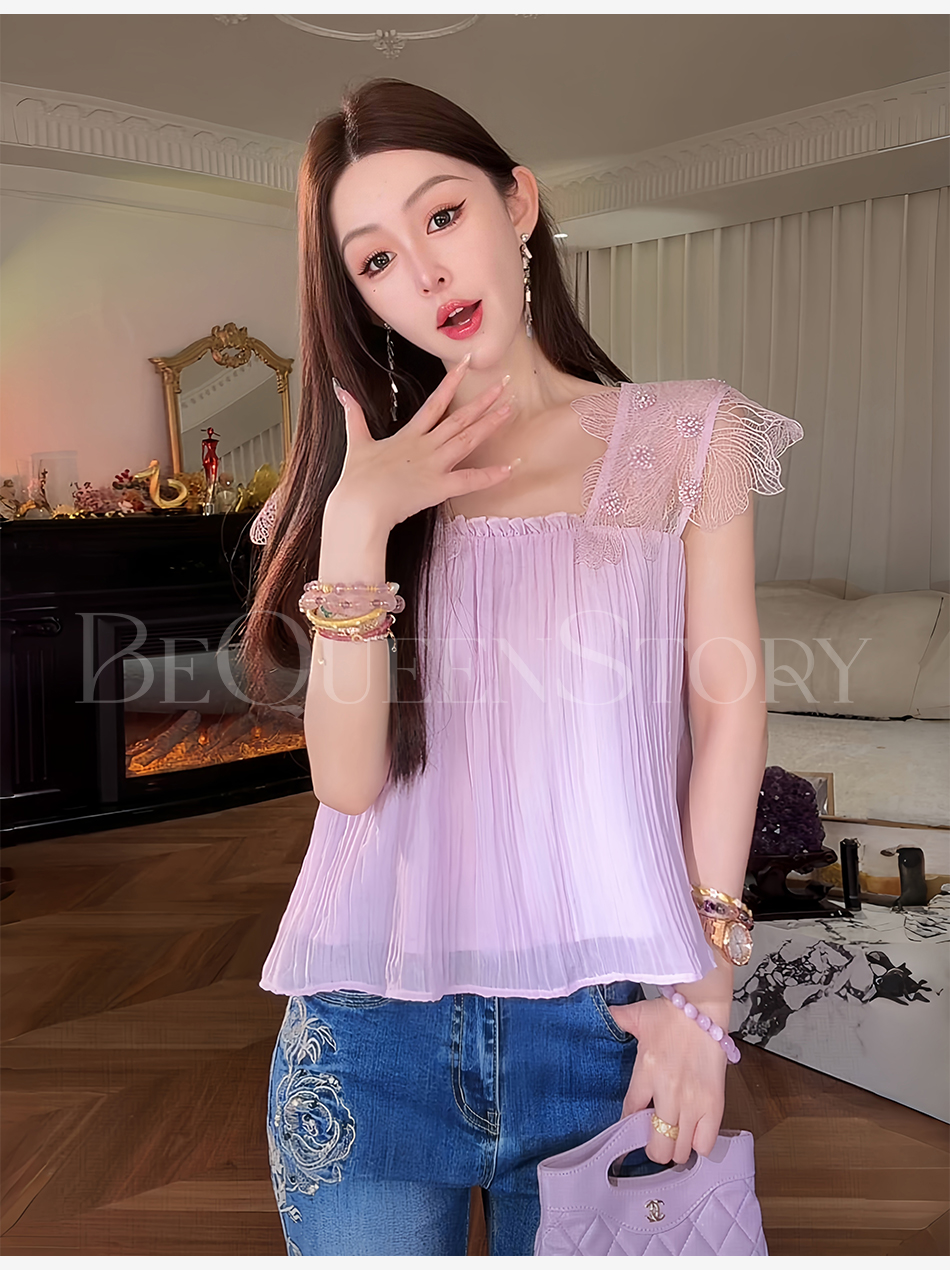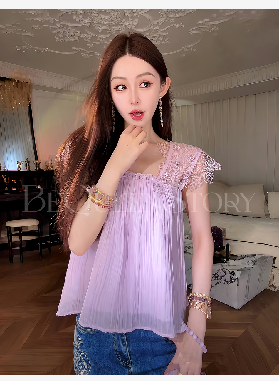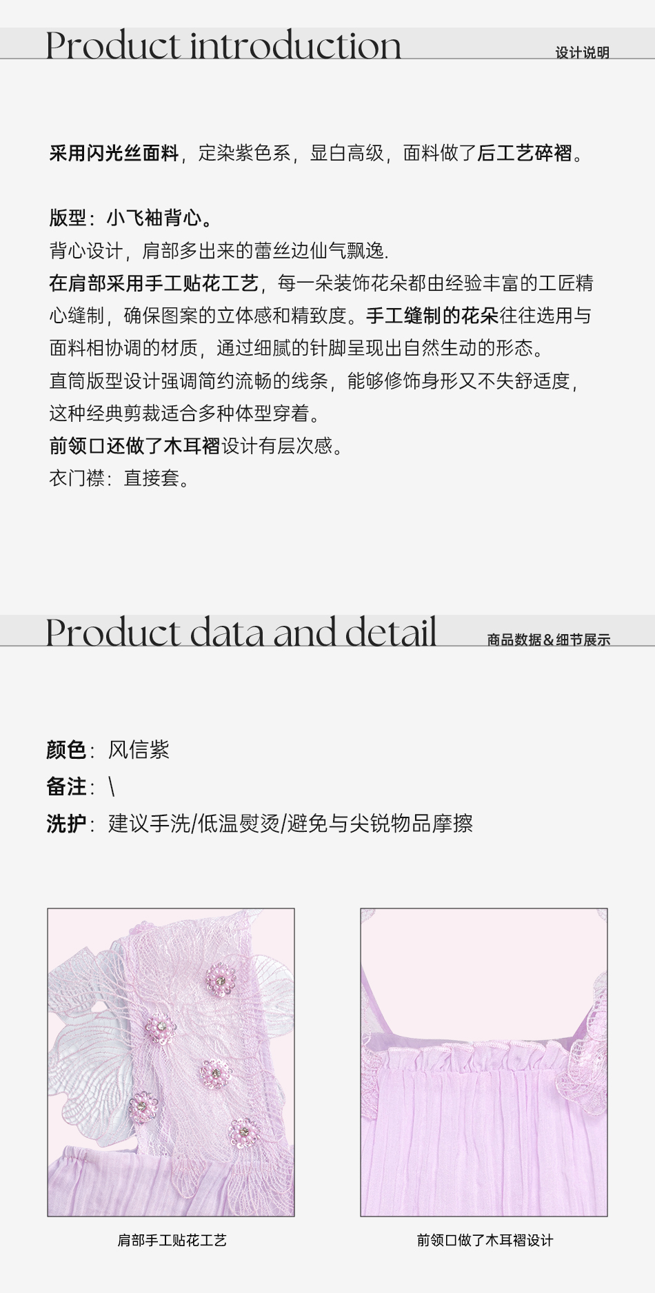 余潇潇【花肩有约】闪光丝蕾丝边手工缝制花朵小飞袖背心2025夏季