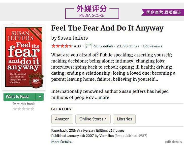 苏珊·杰菲斯所著的《感到恐惧》是当代西方的一本励志类心理著作,原版畅销海外20余年,累计销量过100万册。