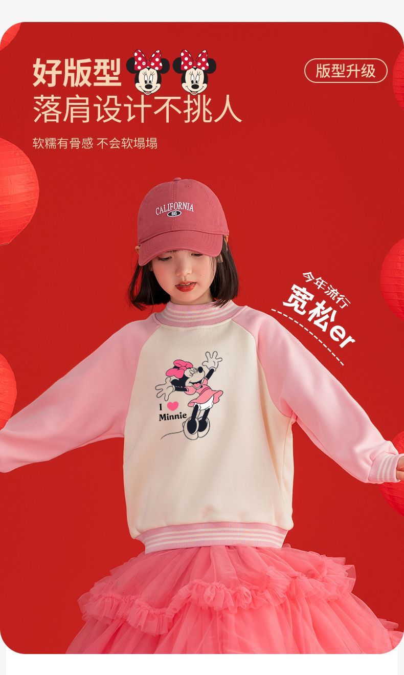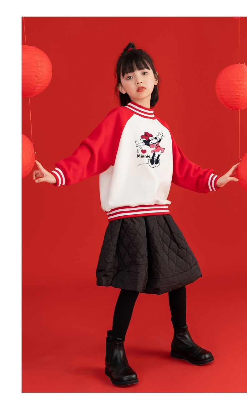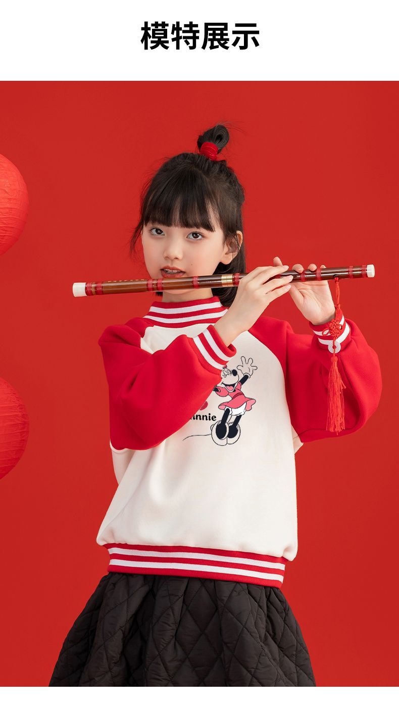迪士尼女童新年装加绒红色卫衣2024新款儿童拜年服女孩大童保暖衣