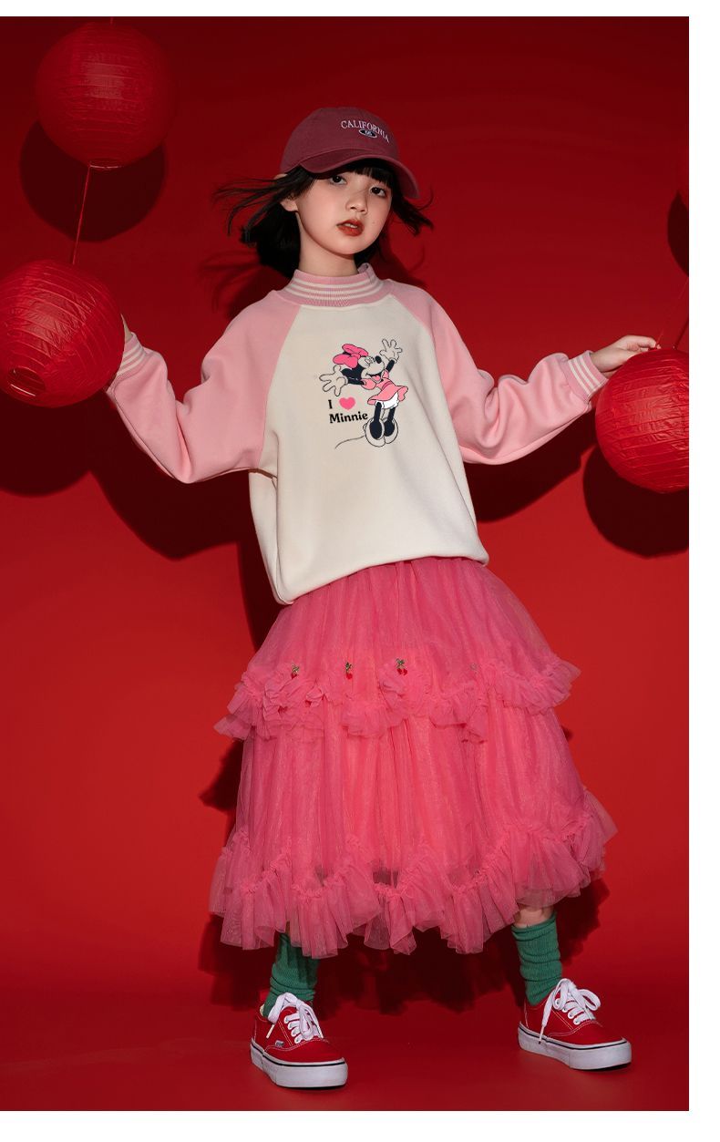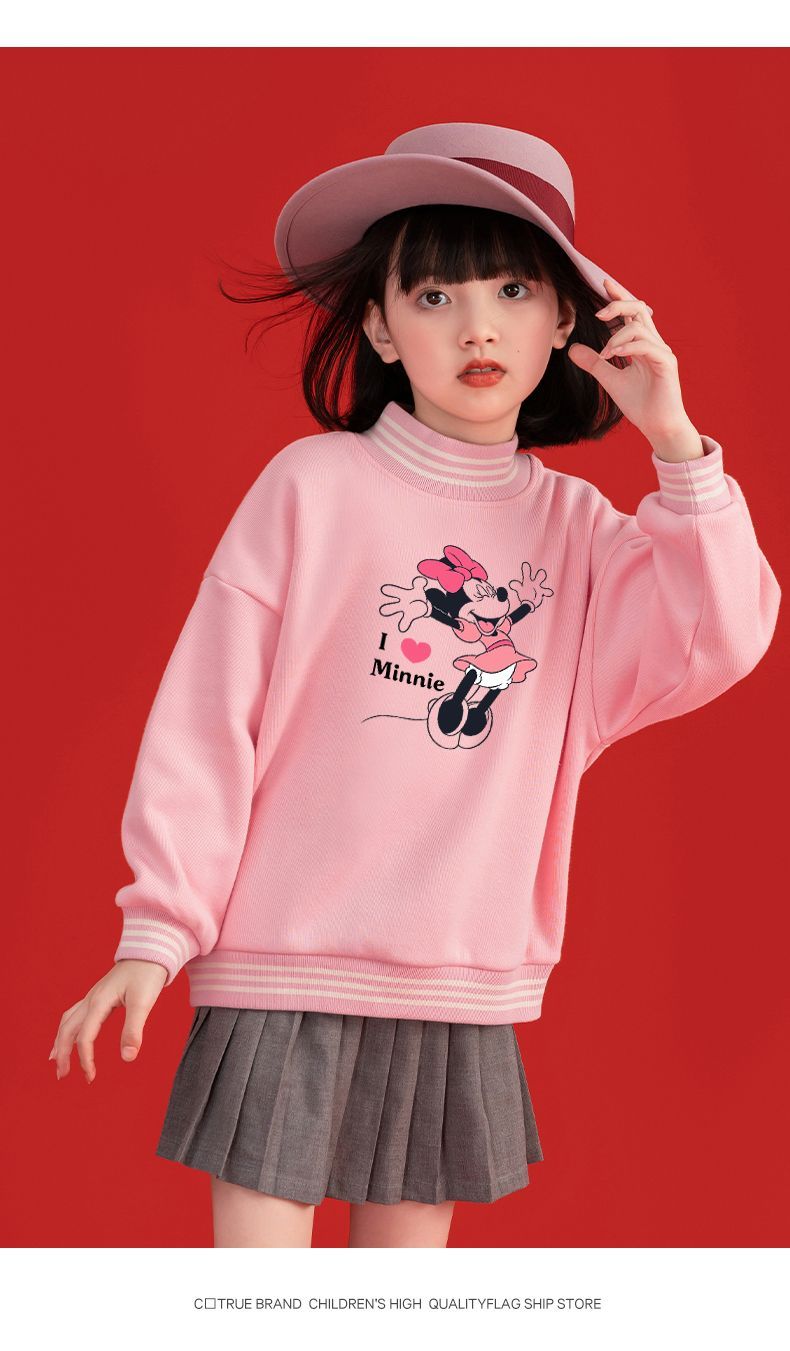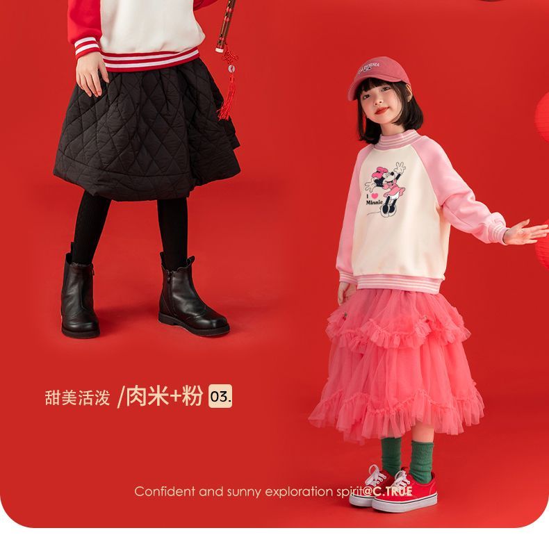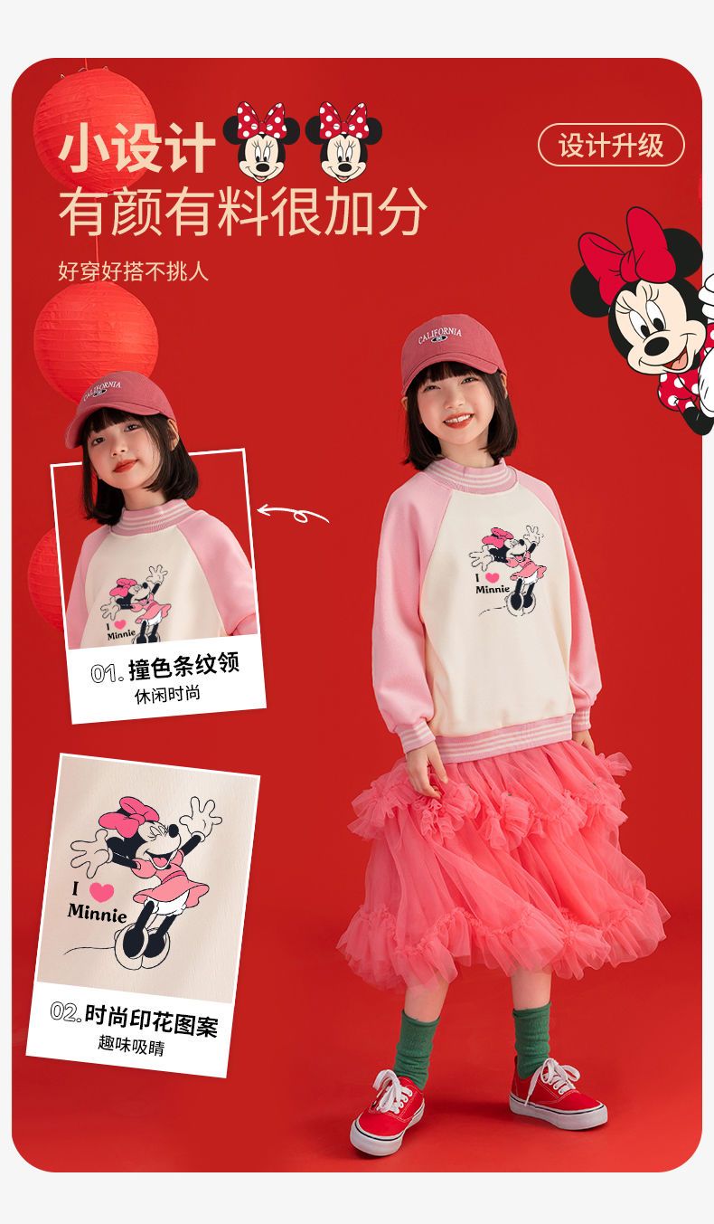 迪士尼女童新年装加绒红色卫衣2024新款儿童拜年服女孩大童保暖衣