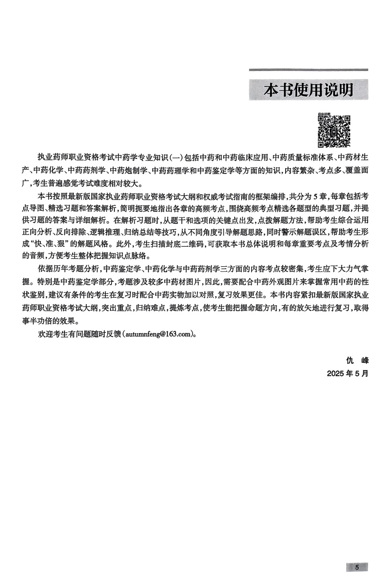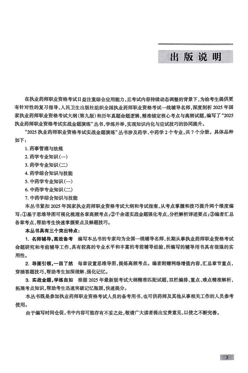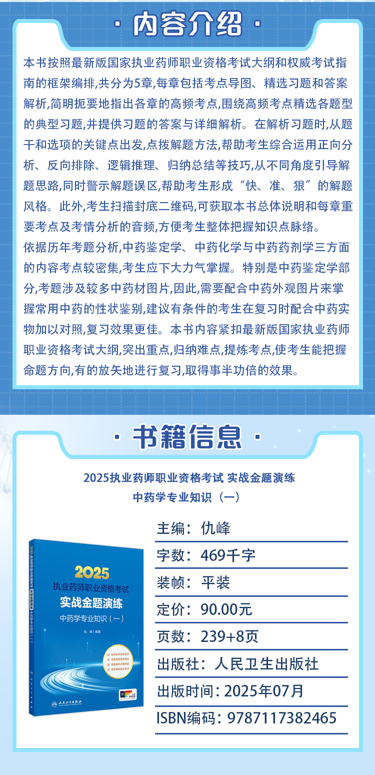 本套“实战金题演练”紧扣2025年新大纲,侧重于习题的同步测试与识记,以思维导图的形式呈现重要知识点,同时以二维码的形式提供作者讲解的本章重要考点视频或PPT;通过约1500道习题及重难点解析,使考生能快速掌握考试重点和解题技巧,迅速提高成绩。1.名师辅导,高效备考。参编本套辅导用书的教授学者均为全国名师,长期参与执业药师资格考试命题研究和考前辅导工作,具有较高的专业水平和丰富的考前辅导经验,能立足考情,掌握学情,所编写的辅导用书具有很强的实用性。 2.图表导图,一目了然。考点内容以思维导图或表格形式呈现,避免大量文字致重难点不清的弊端,将繁杂的内容图表化,突出重点、难点,有助于考生加深理解,增强记忆效率。 3.实战金题,名师讲解。考点内容依据新考纲,试题紧跟考点,覆盖面广,疑难问题提供主编讲解,对重难点加以巧妙点拨,助考生迅速突破记忆瓶颈,快速提分。 4.本套辅导用书以音频、视频或ppt的形式配有各章考点串讲;同时提供考点微课、习题、试卷等增值服务。