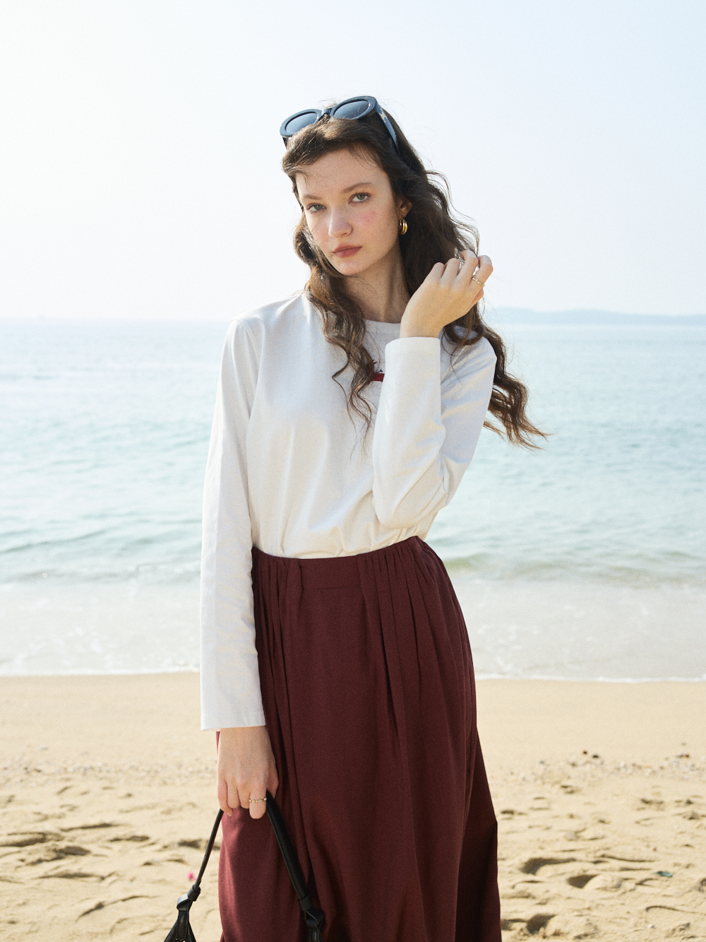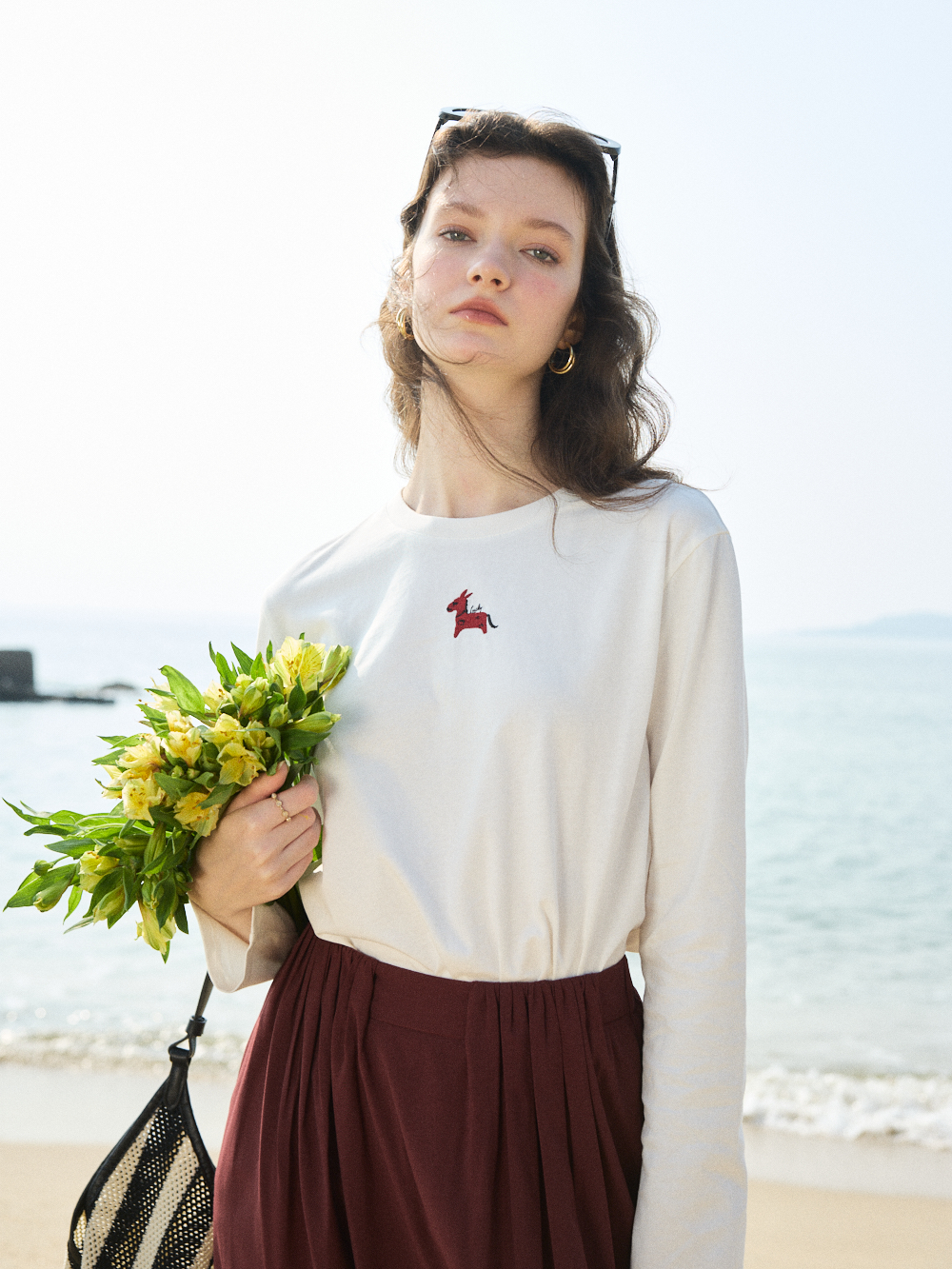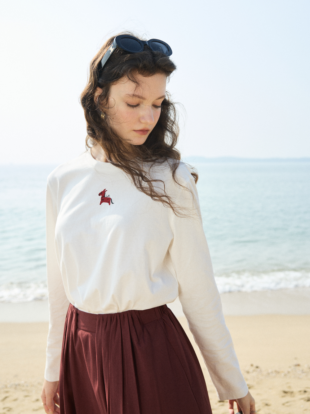 OLrain欧芮儿2026春米白色简约休闲长袖T恤圆领