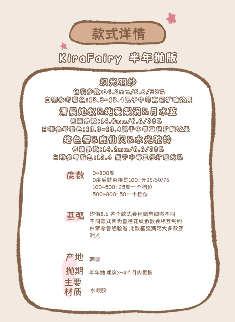 Kira Fairy半年抛 ·鹿仙贝&水光驼铃&络色樱|14.2mm白狮参考着色中等直径 韩产2片