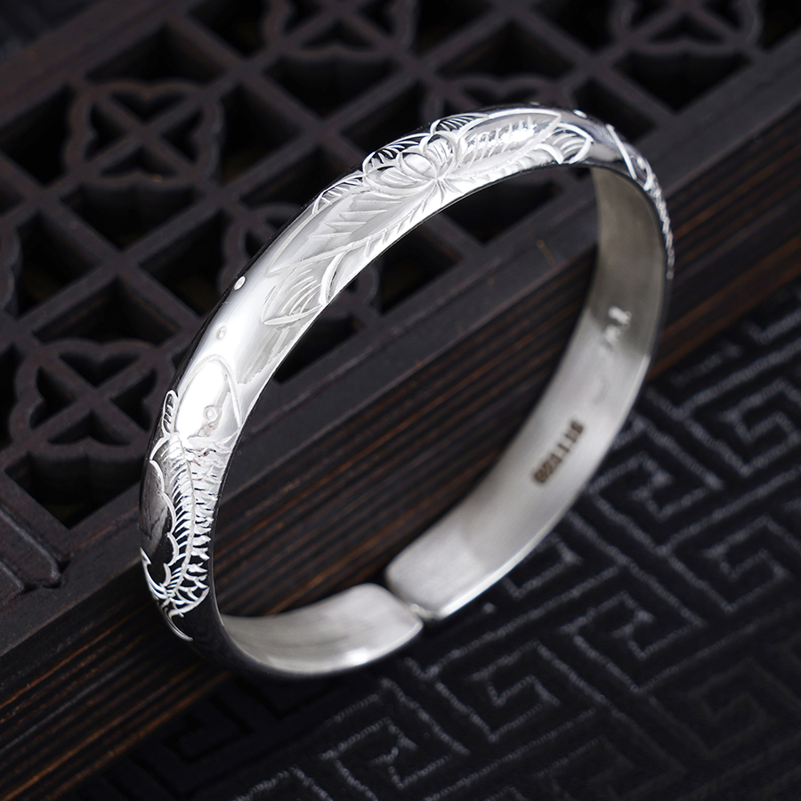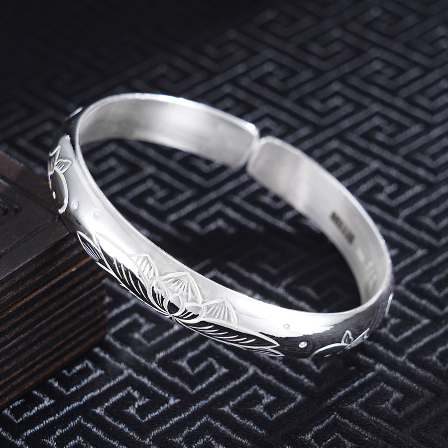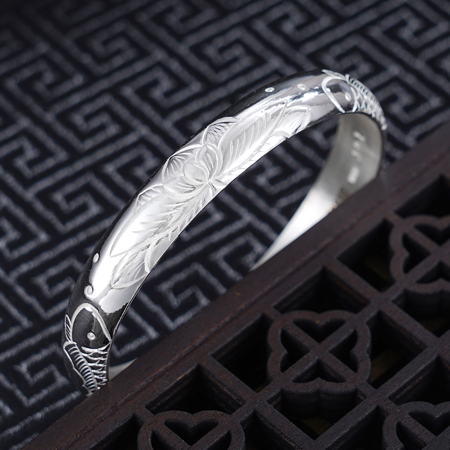 【寓意】:纯银开口手镯,镯面錾刻游鱼戏莲之景,辅以抛光工艺,更显婉约清雅。寓意好运连连,吉庆有余。