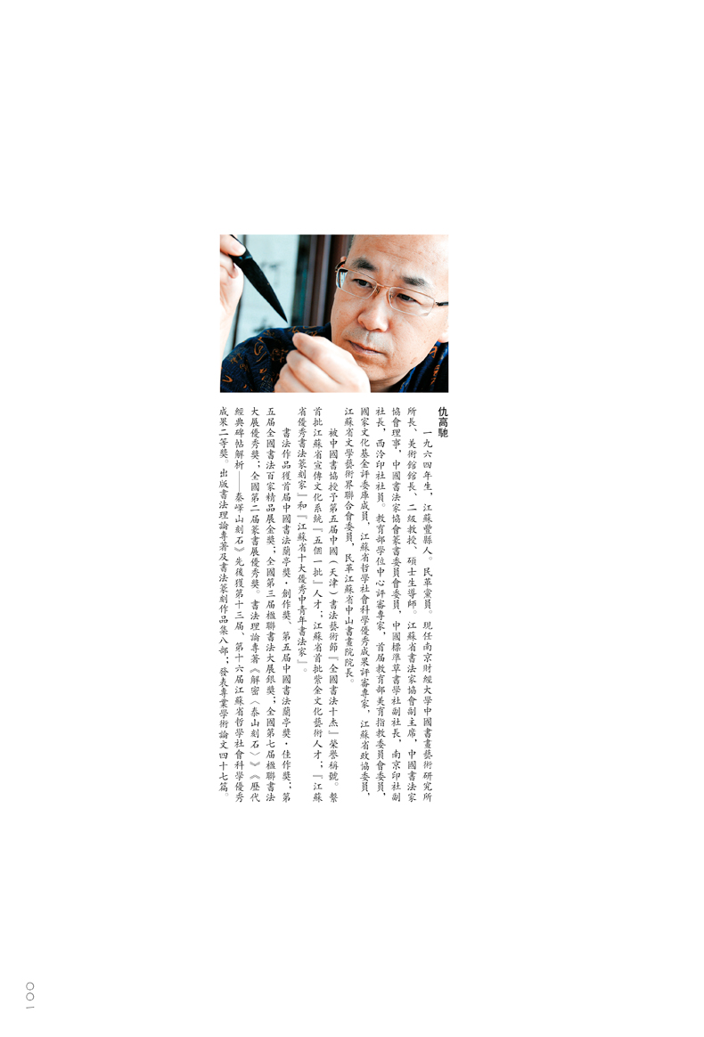 仇高驰,现从事书法和篆刻艺术的创作、教学和书法理论研究。书法诸体兼擅,尤工秦篆。其书法用笔如锥画沙,笔势洞达而无霸气,雍容秀润而无媚态,线条稳健凝练,而又有流动飘逸之致。