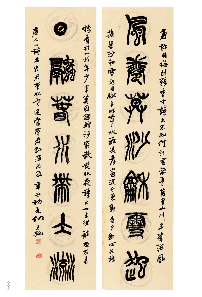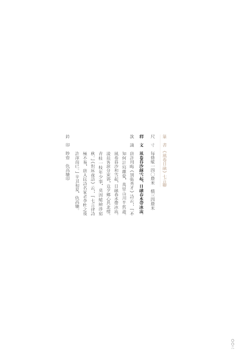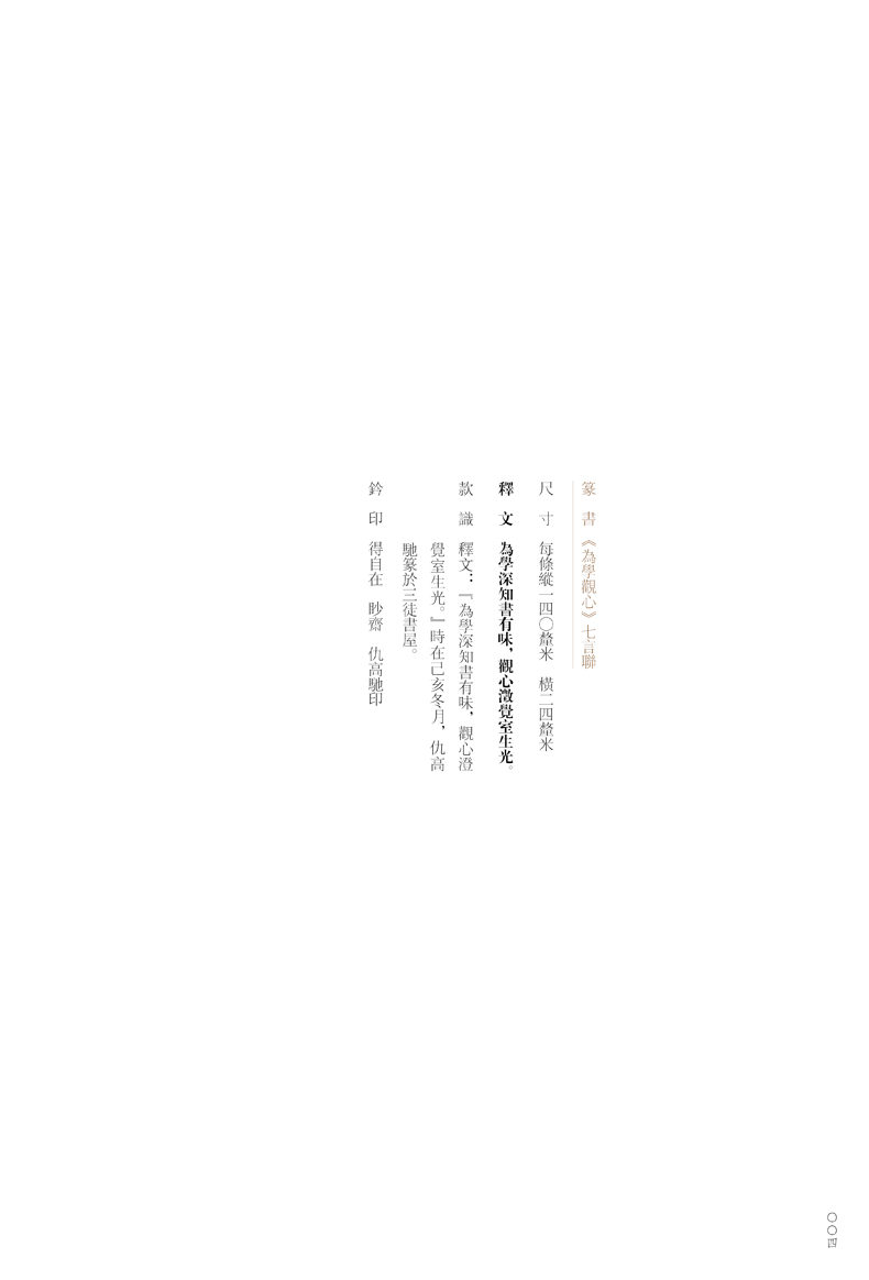 仇高驰书法诸体兼善,尤工篆书。其篆书自秦篆入手,继而上溯商周钟鼎文字得古朴厚重之气息,下窥邓石如、赵之谦等大家之作得婉畅之运笔,数十年浸淫探索,渊雅清纯格调高古,在高手如林的当代书坛,以其独具个性的篆书开出一条路来。本书精选仇高驰近年创作的篆书楹联书法50件,在选题方面,都是对仗工稳、内容高雅的经典楹联,从四言联到多字联,同时,也照顾到各种形制丰富多样,极具阅读性,可以说《仇高驰篆书楹联选》全面反映了作者现阶段篆书创作的水准。