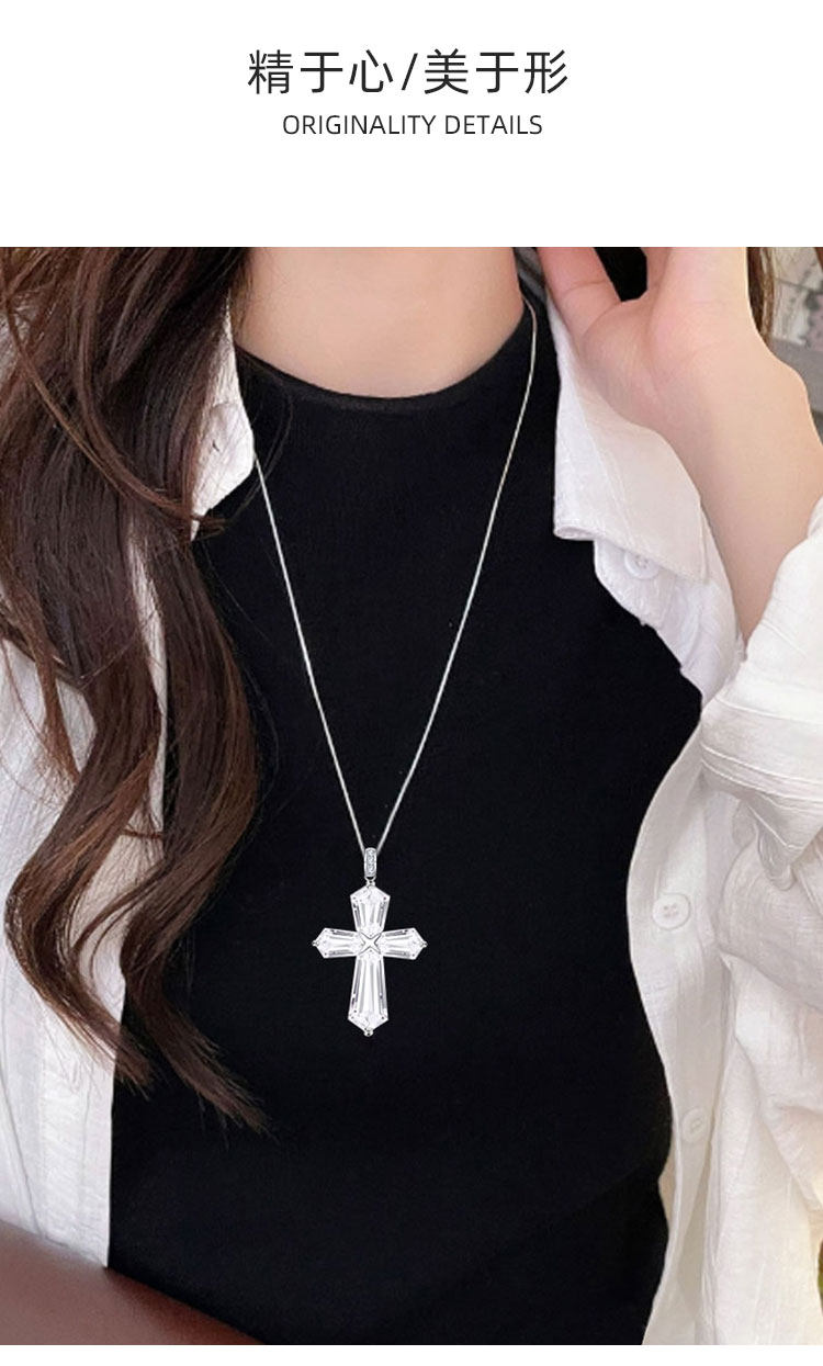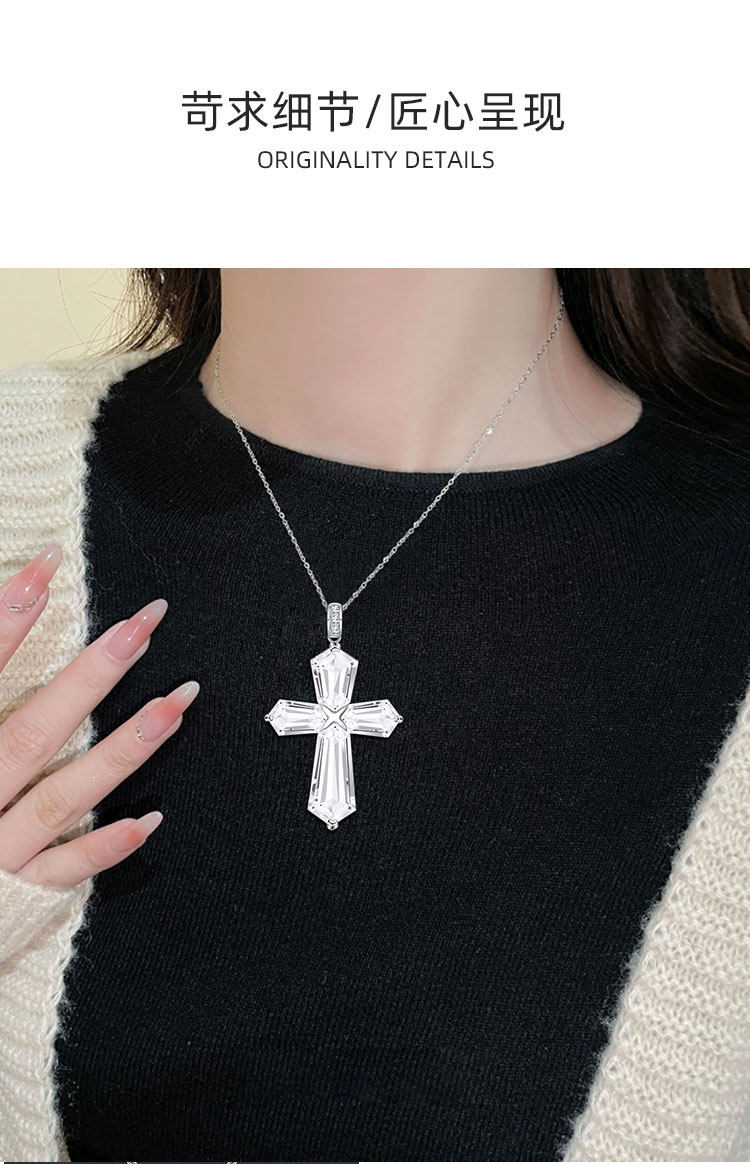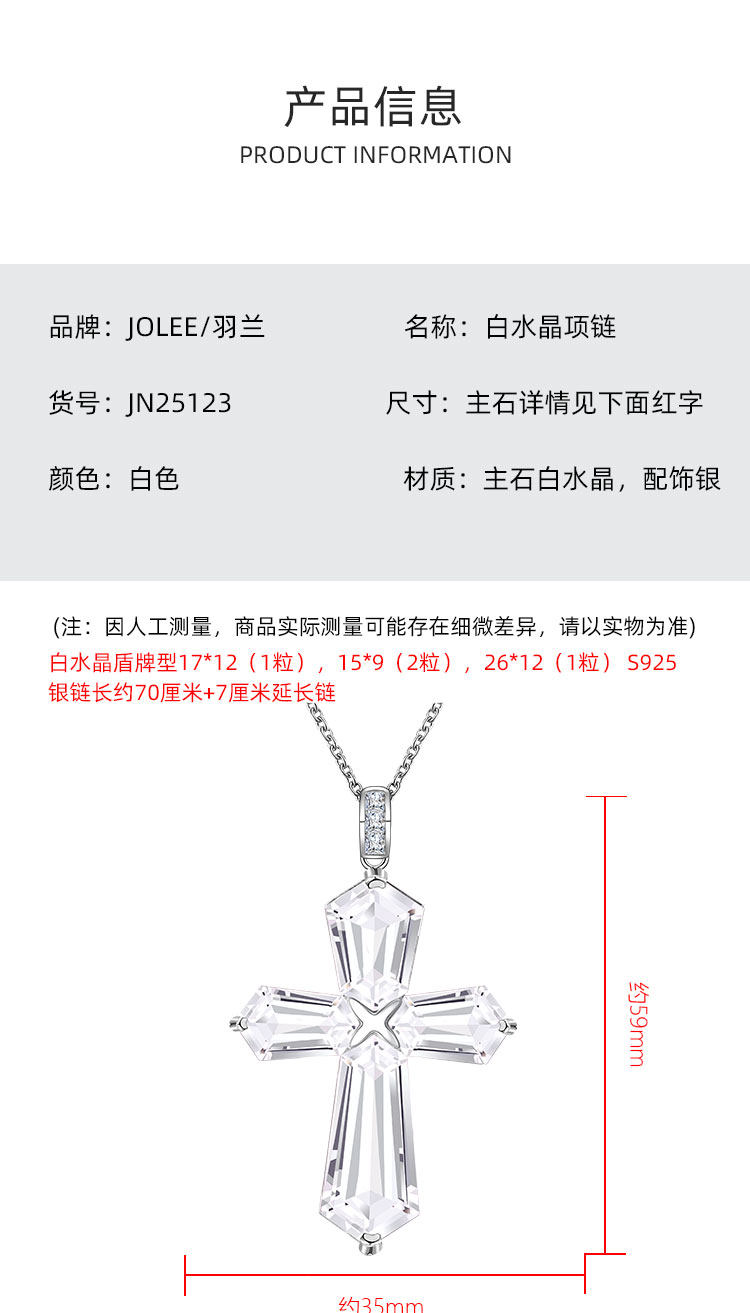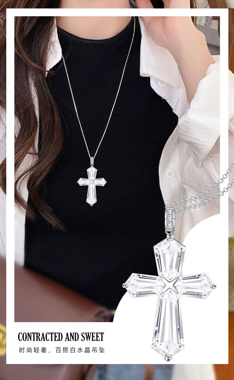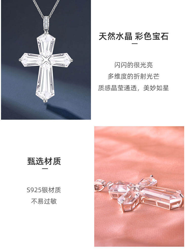 【天然白水晶毛衣链】S925银情侣款十字吊坠项链饰品送男女礼物JN25123-水晶CC