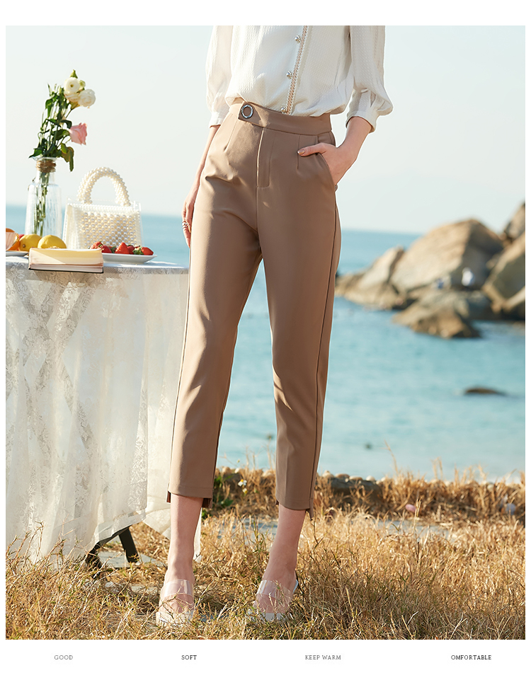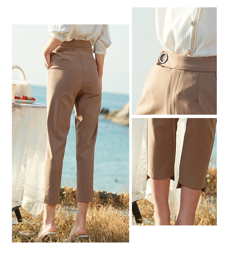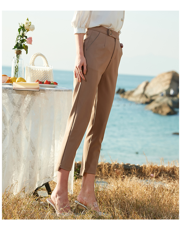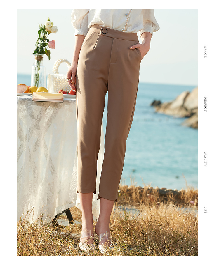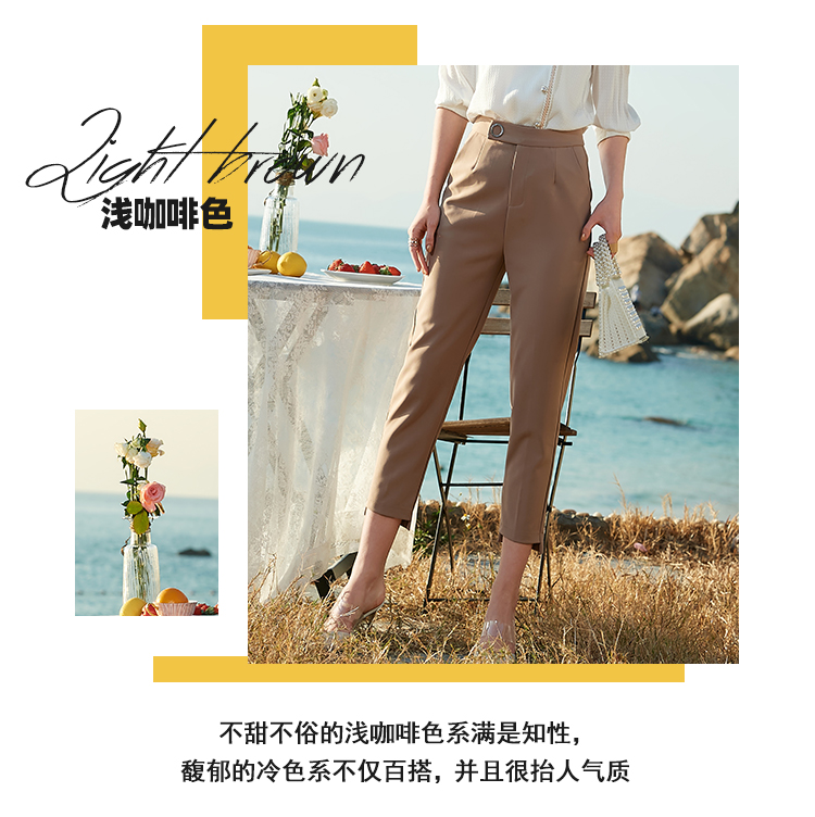 欧芮儿2021夏装新款高腰显瘦九分休闲裤通勤OL风修身咖色哈伦裤潮