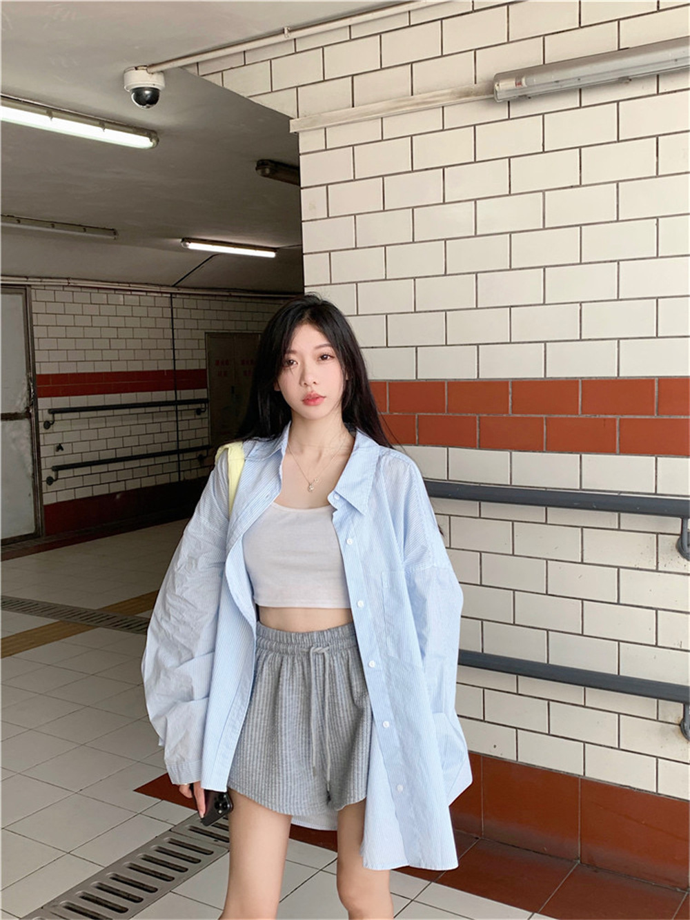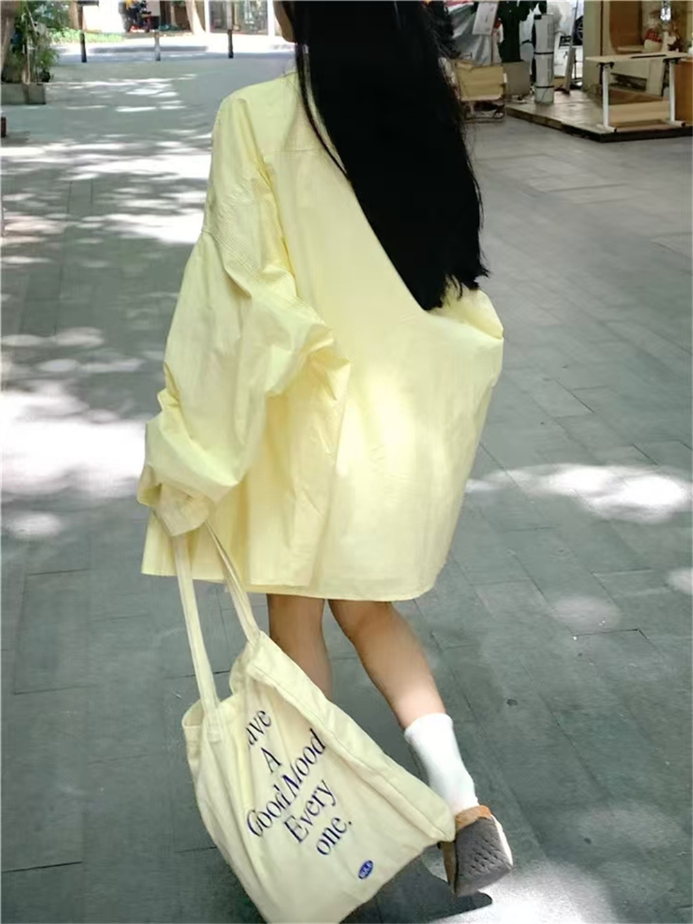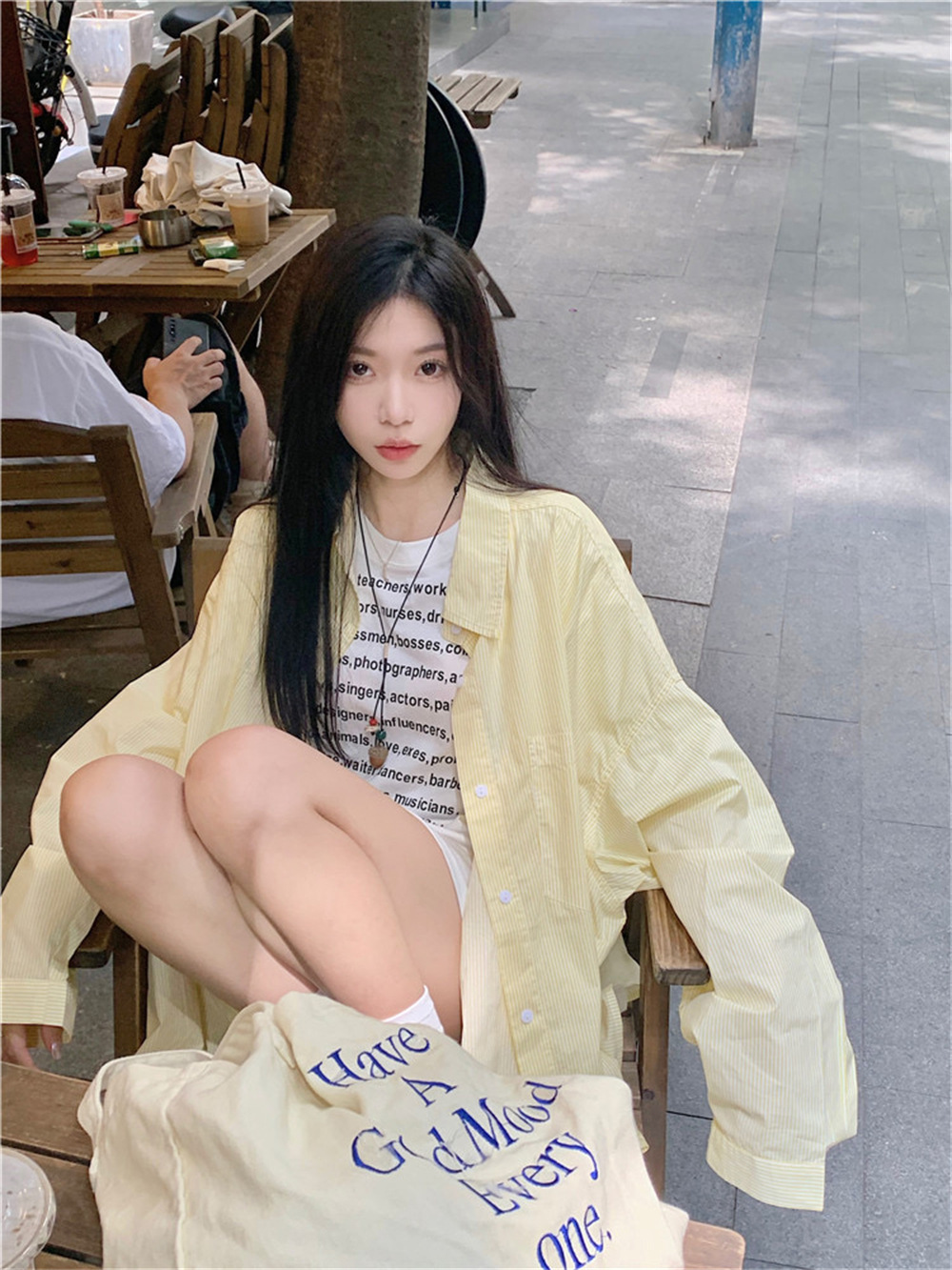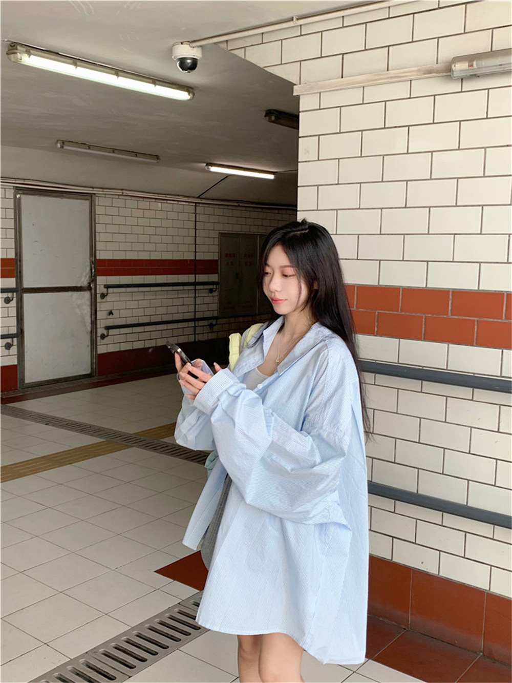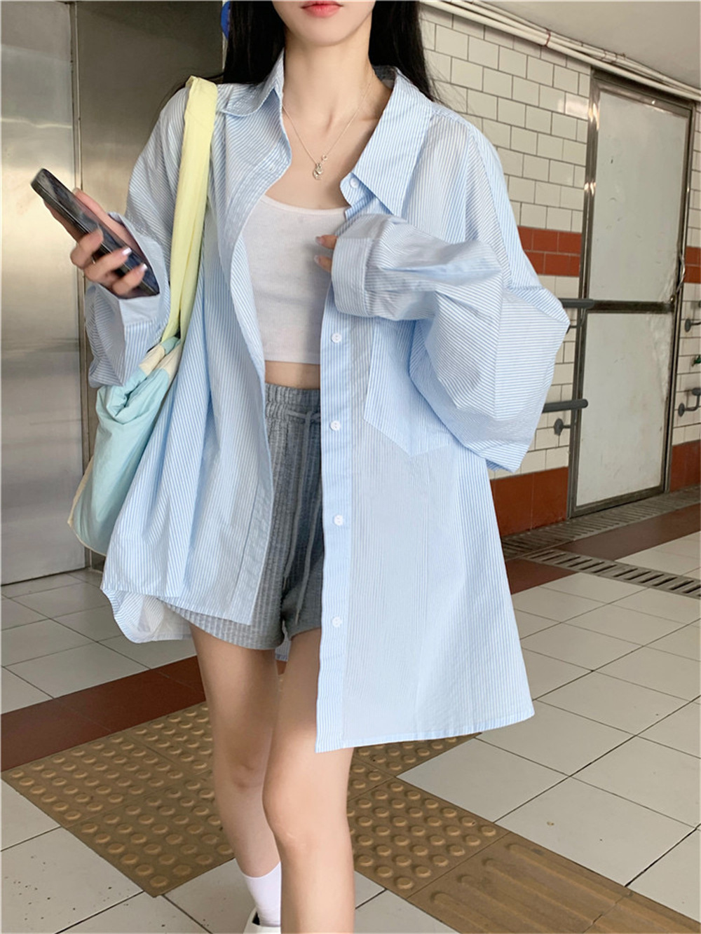 【松弛感韩系风❗️条纹宽松衬衫外套】浅蓝细条纹自带清新滤镜,宽松版型慵懒随性,轻松营造 “不费力的时髦感”夏季防晒衬衣宽松,休闲开衫中长款上衣女L★美物社