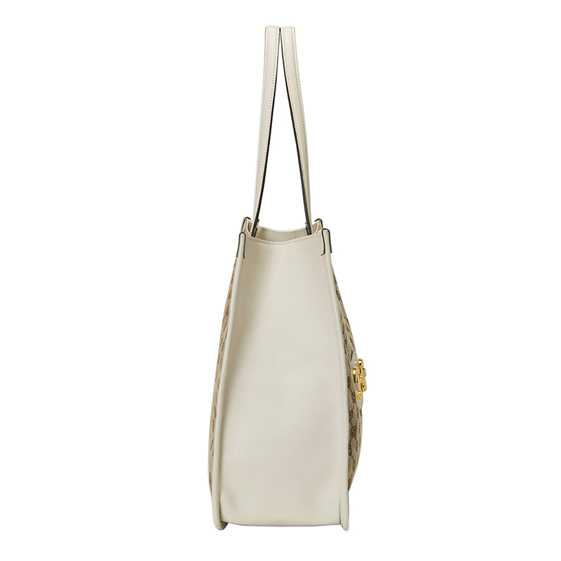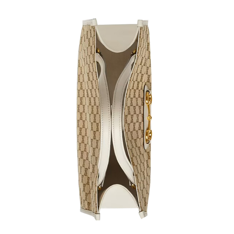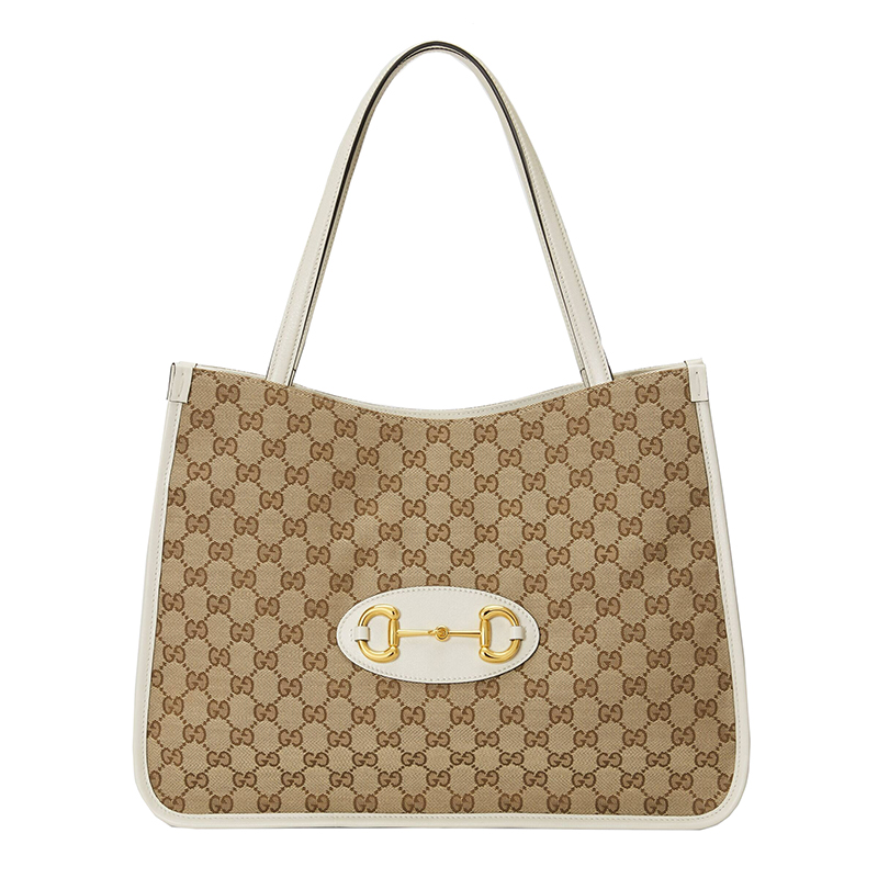 Gucci 马衔扣1955系列手提包边角圆润、线条柔和,由GG Supreme帆布材质制作而成,饰以白色皮革滚边。这款手提包采用双提手造型,搭配整洁有序的内部构造和搭扣细节。该系列延用六十余年前包袋上使用的设计细节,同时注入现代时尚精髓,彰显马衔扣的别致魅力。作为Gucci的经典传承之一,这一由双环和长条形两个元素构成的设计图案从Gucci的马术本源汲取灵感,如今已经成为品牌耀眼的标志性元素之一。