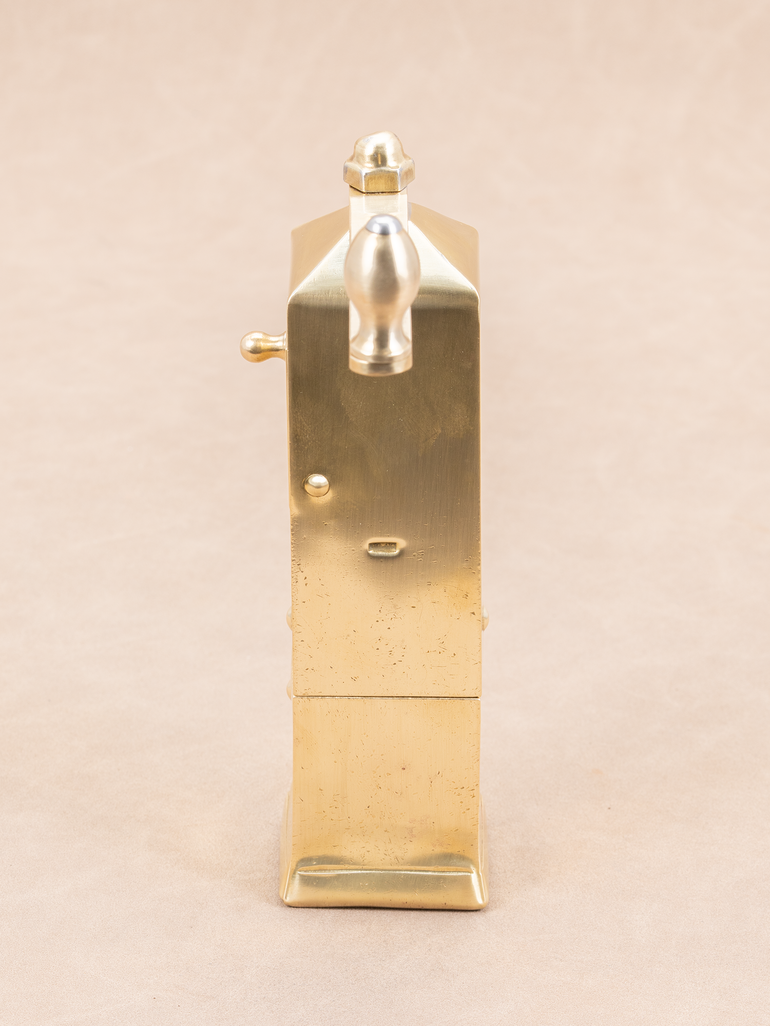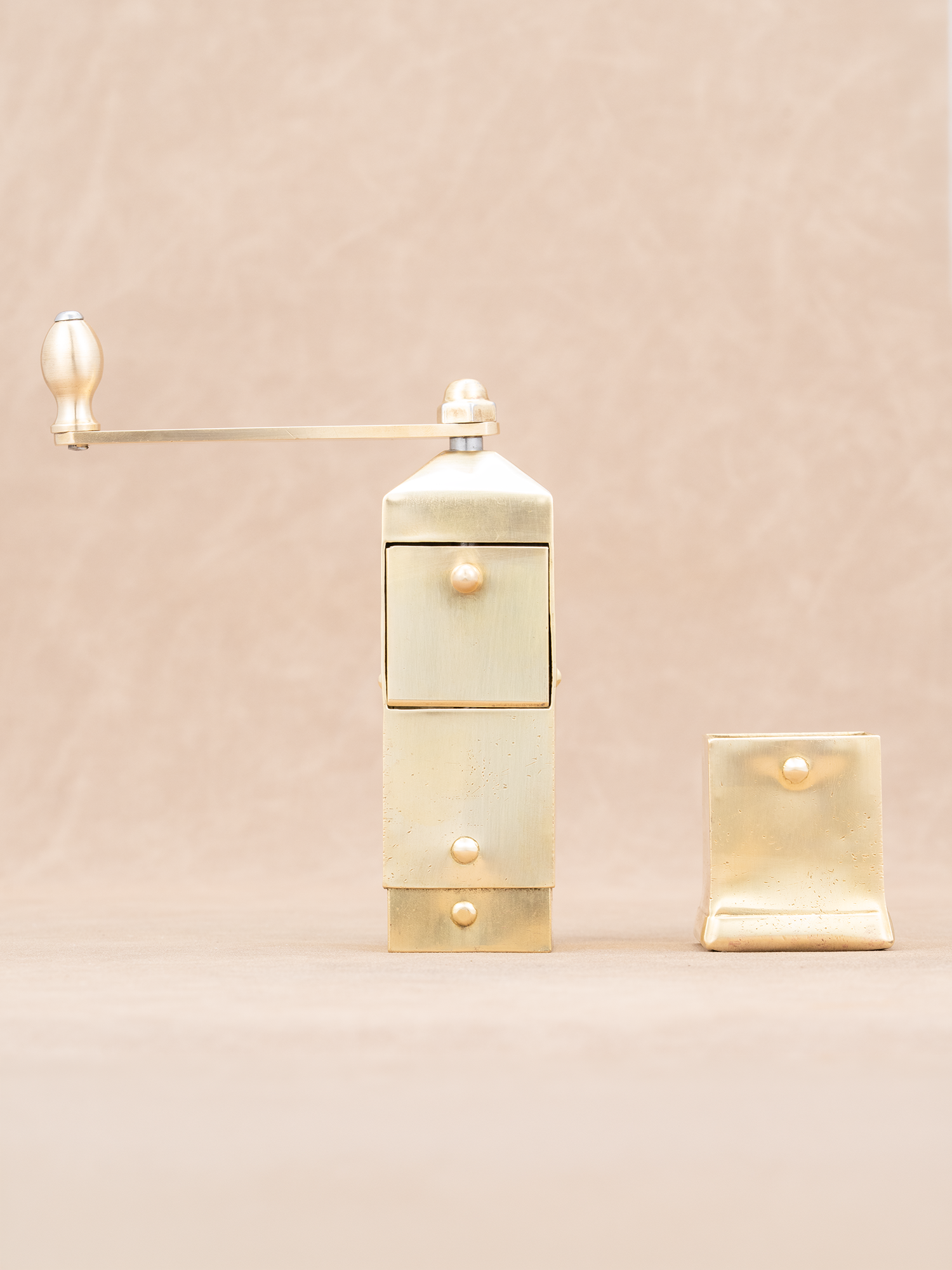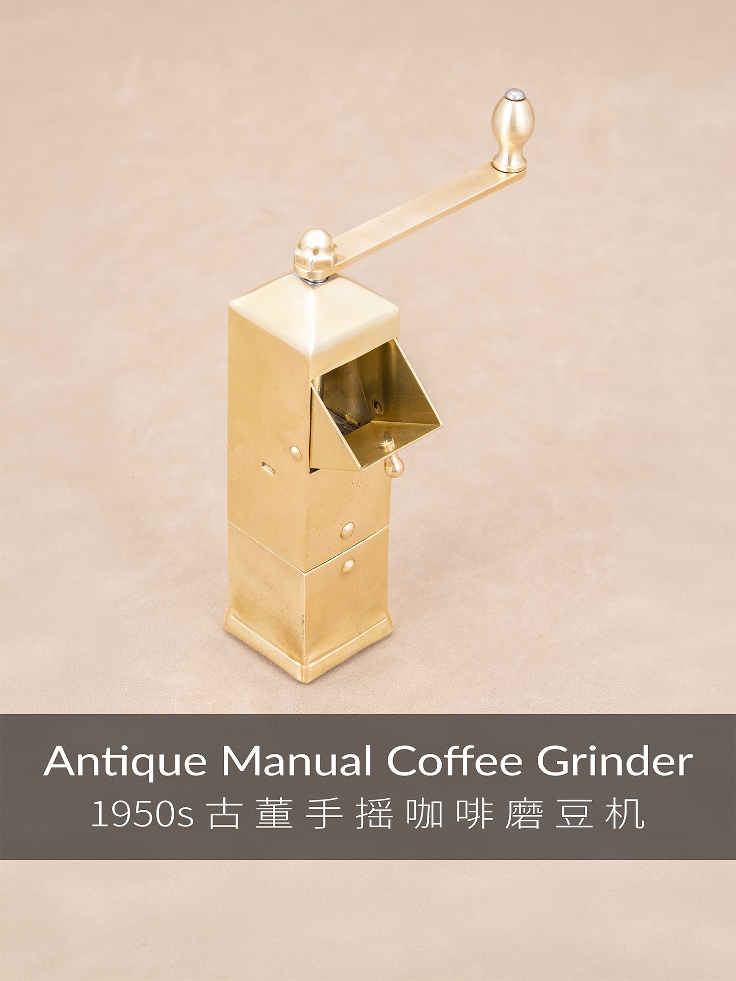这款黄铜古董手摇磨豆机,至今约75年左右历史,有一些岁月留下的痕迹,黄铜发亮的质感很上片,整体品相上乘。