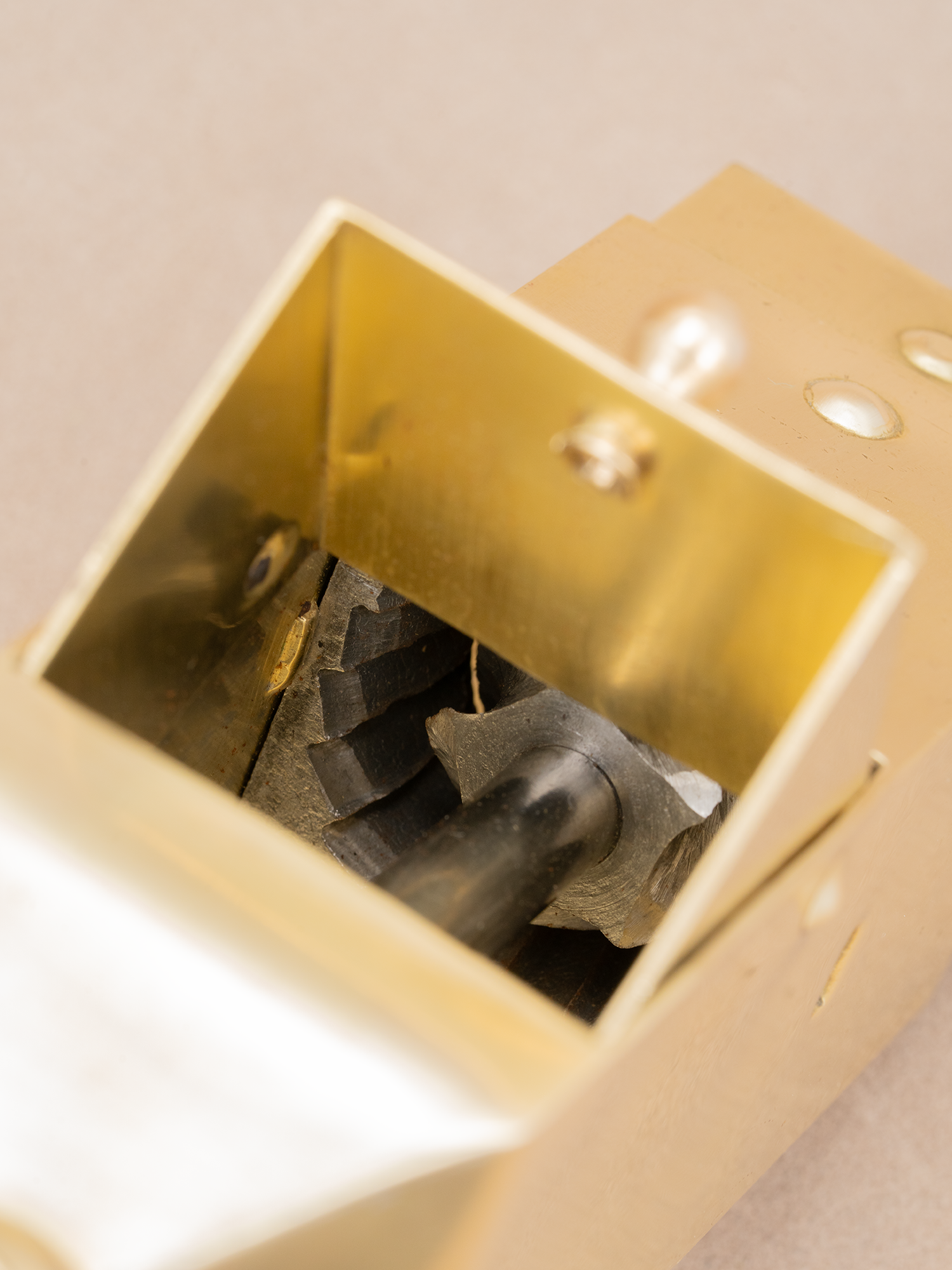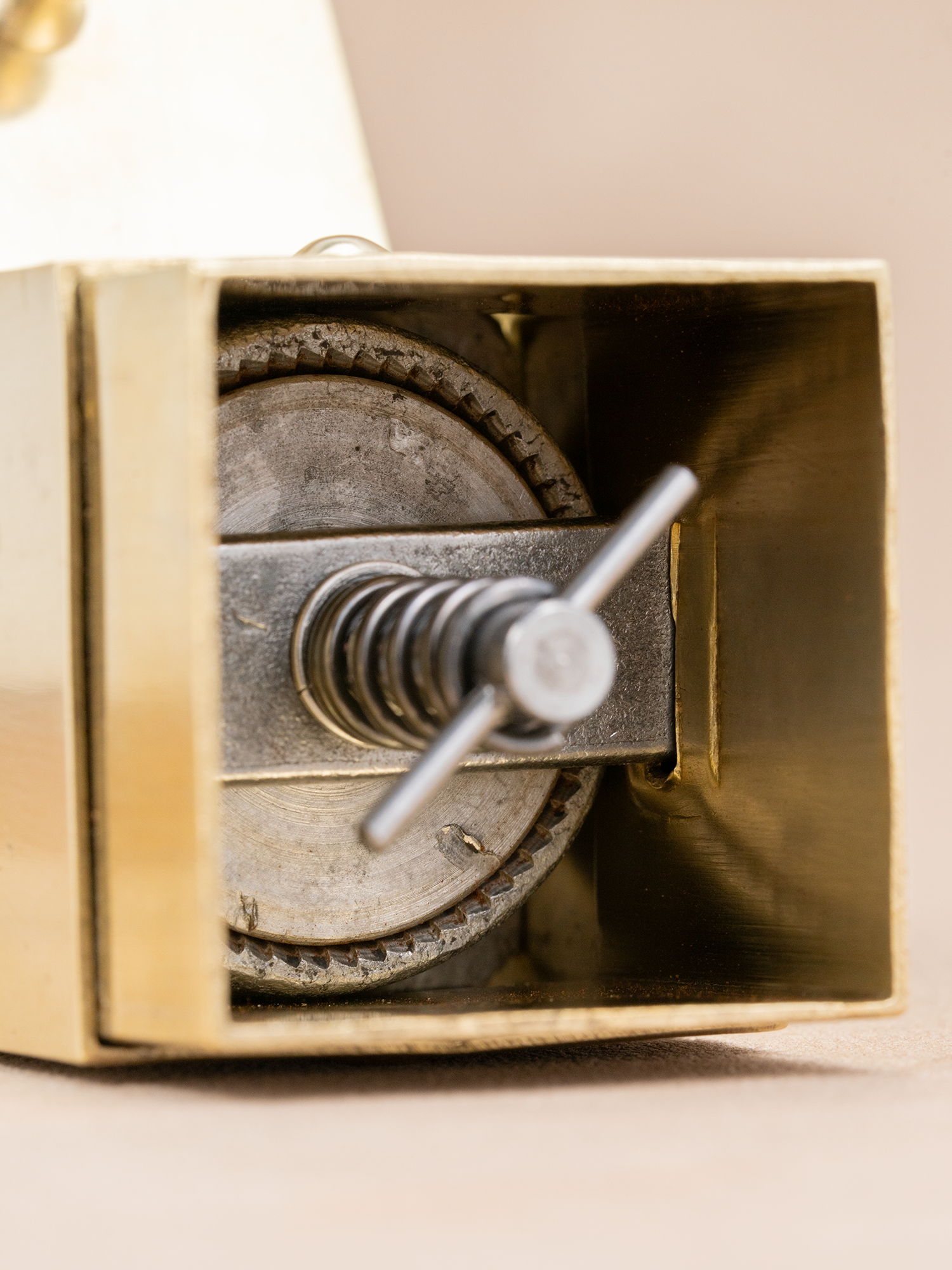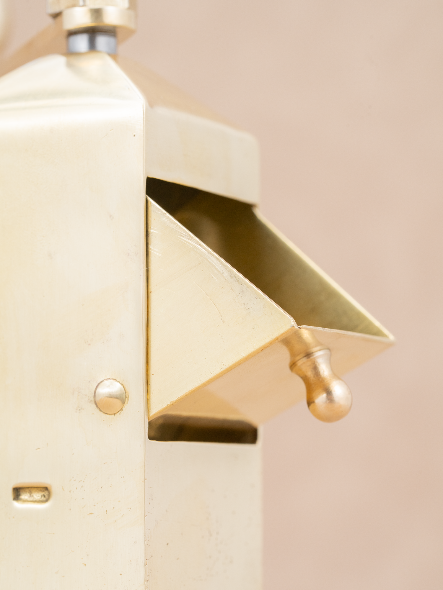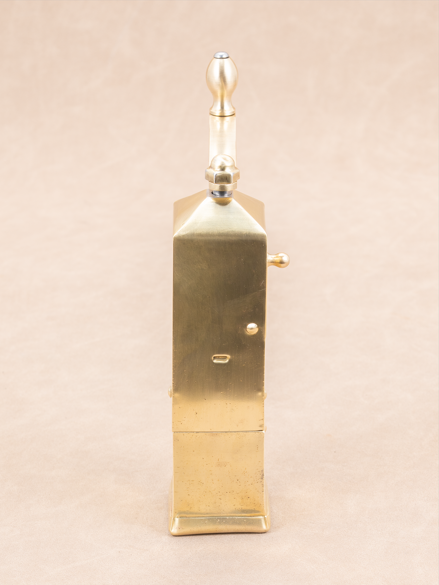 这款黄铜古董手摇磨豆机,至今约75年左右历史,有一些岁月留下的痕迹,黄铜发亮的质感很上片,整体品相上乘。