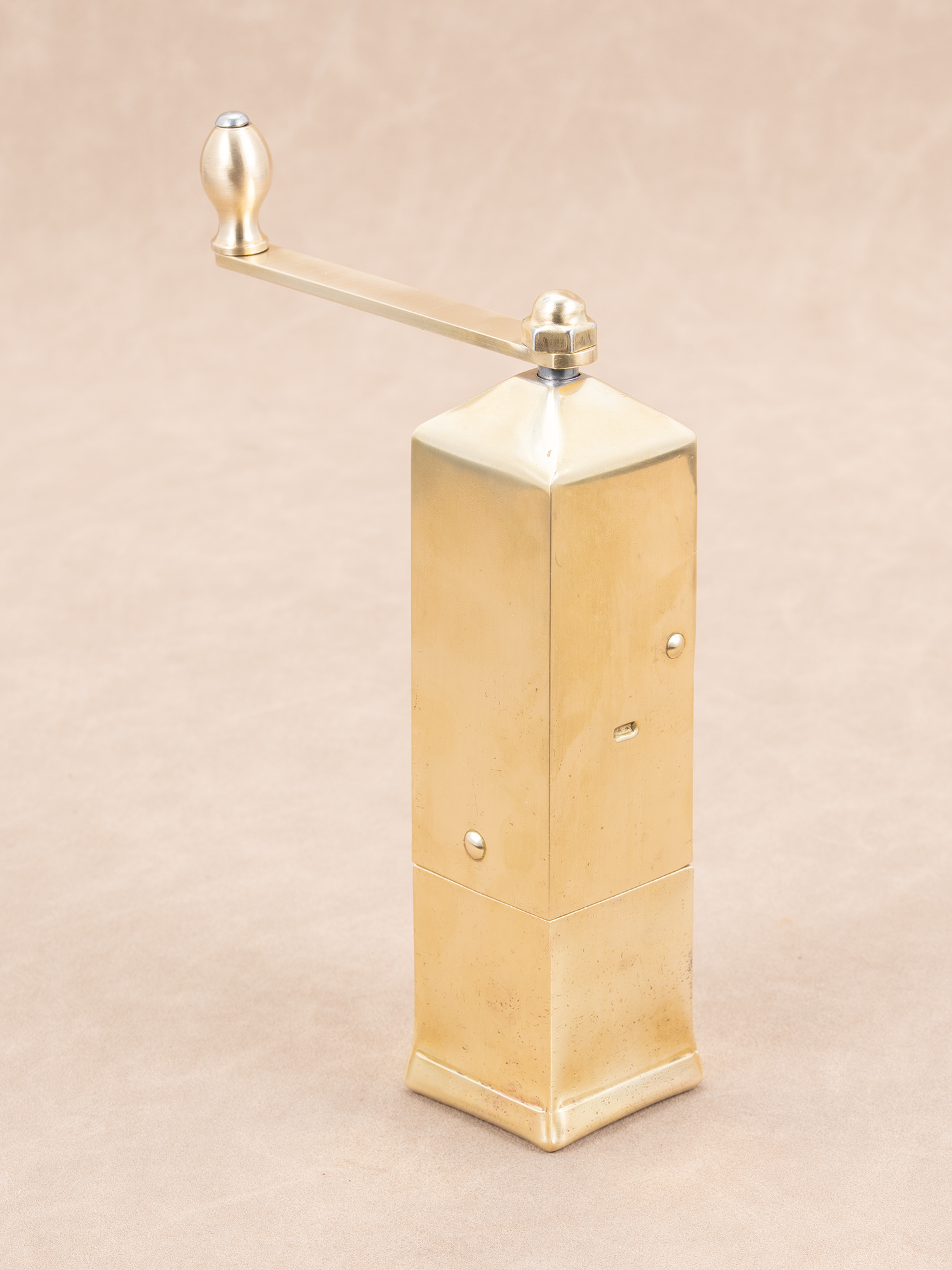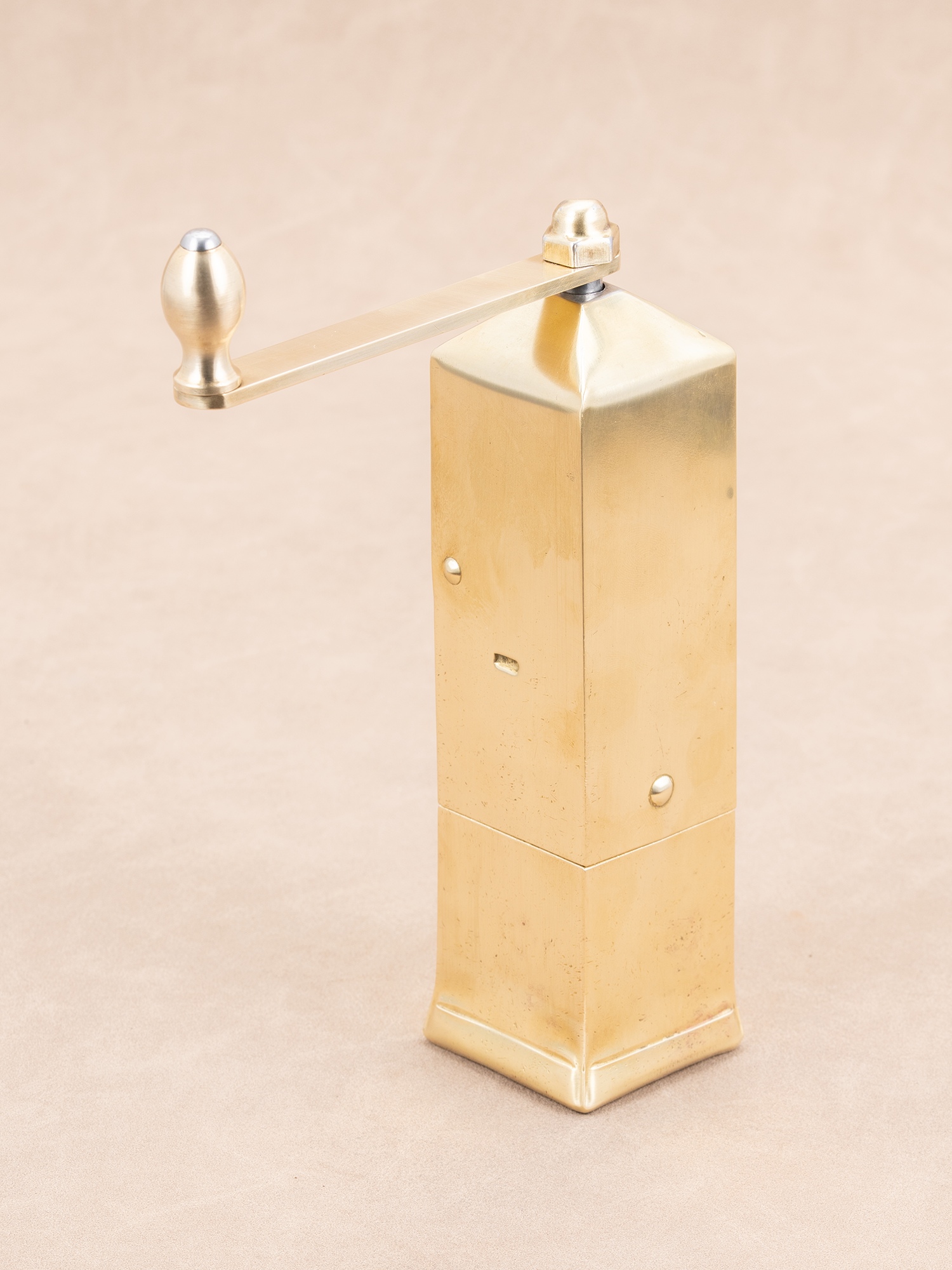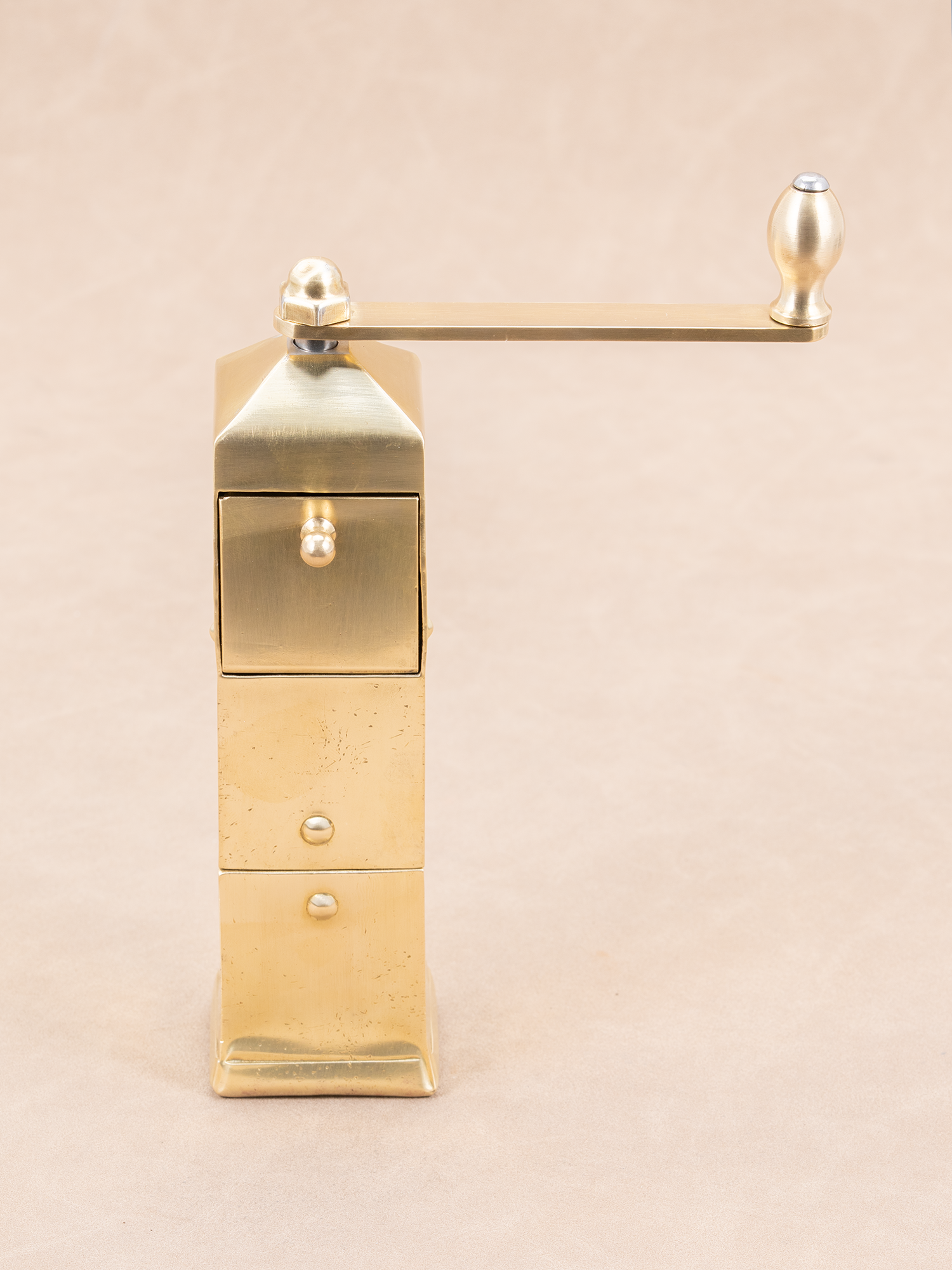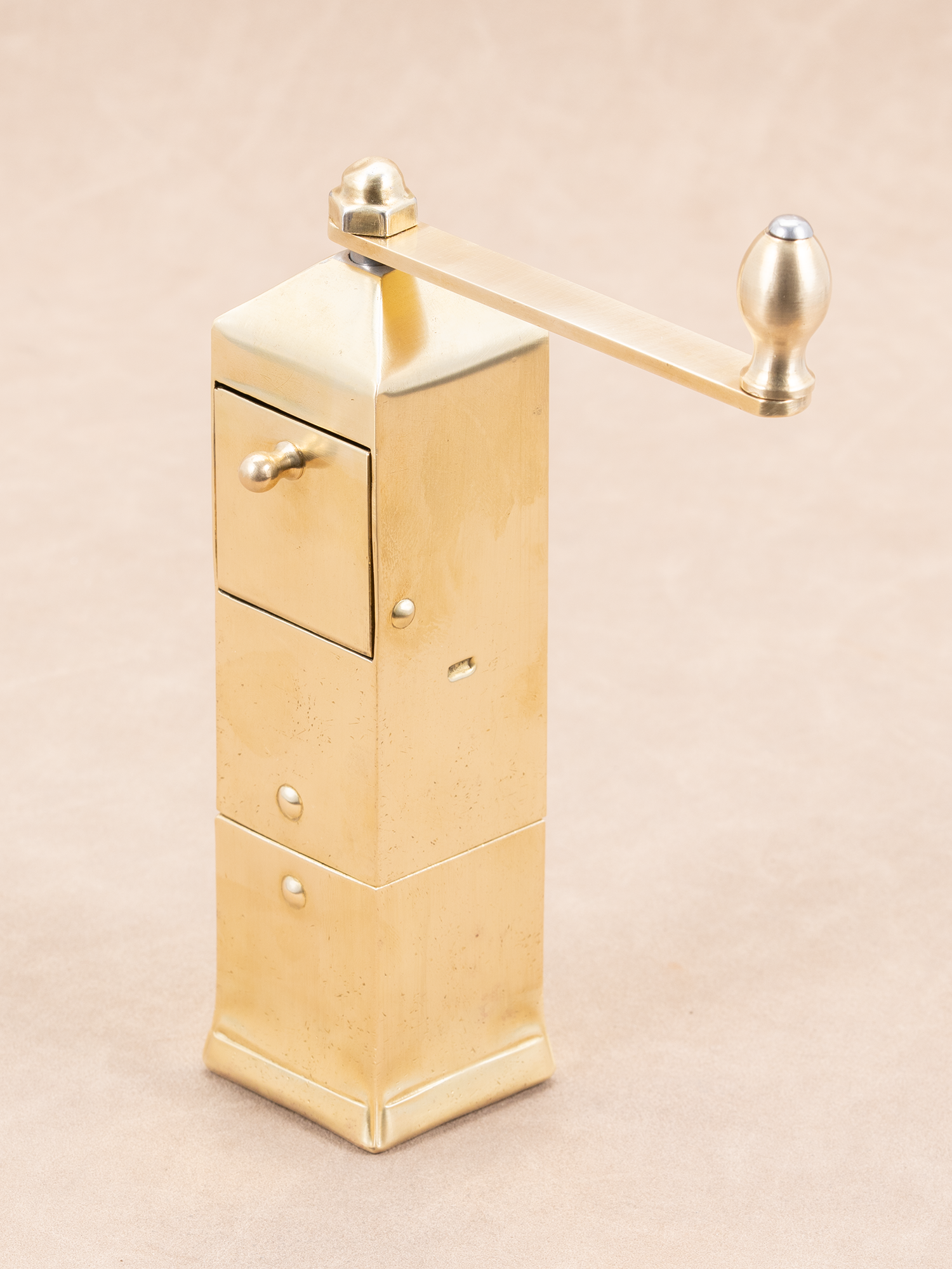 1)全机身为黄铜材质(除内部锻钢磨芯); 2)上面豆仓开口朝上,方便放咖啡豆;下面粉仓可直接拿出,方便倒咖啡粉; 3)磨体是非常规的圆形设计,被设计成方形,这样手摇时不会手滑(同时也不会硌手); 4)能研磨非常细的咖啡粉,如土耳其咖啡。