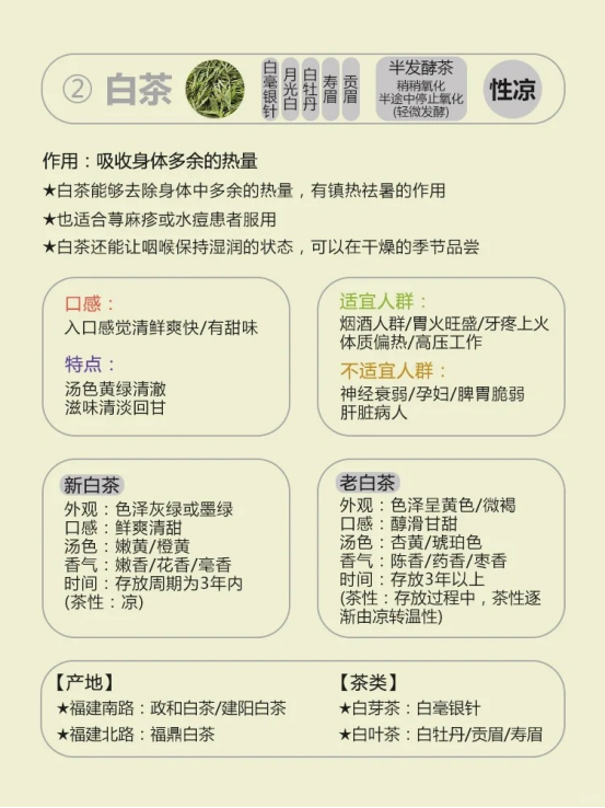 白茶 作用:吸收身体多余的热量 去除身体中多余热量,可镇热祛暑,适合荨麻疹或水痘患者,还能让咽喉保持湿润状态 代表性茶叶:白毫银针/白牡丹